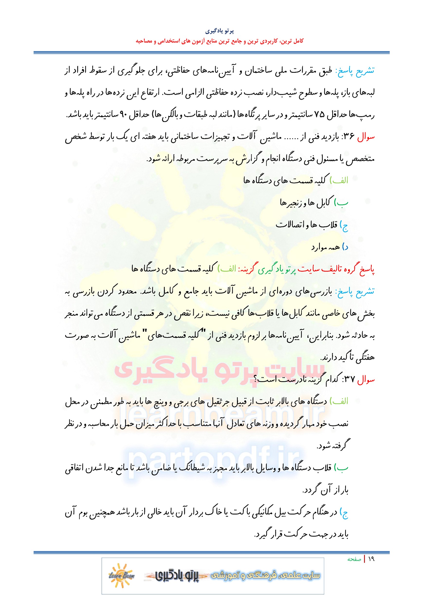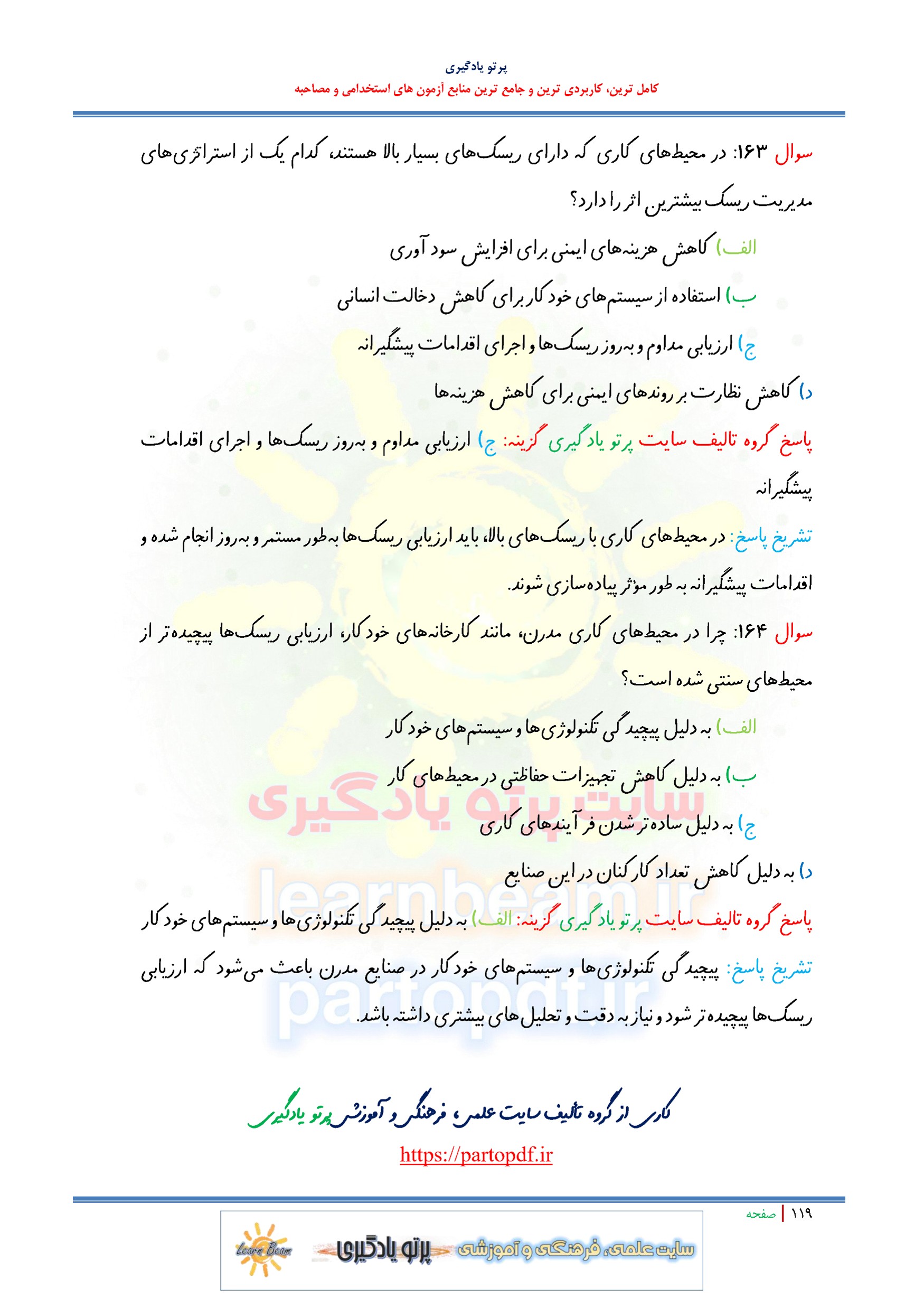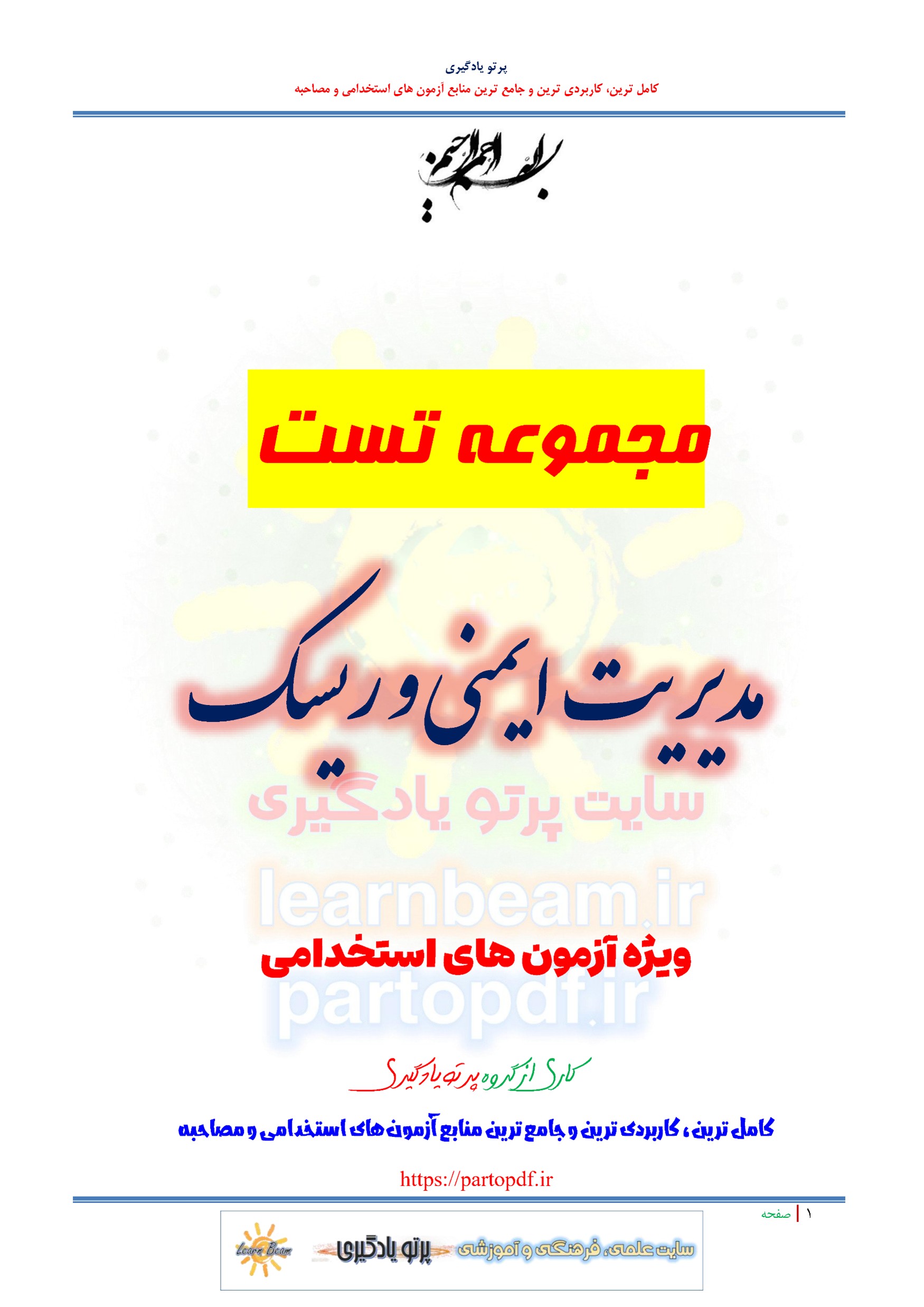 سوالات و تست مدیریت ایمنی و ریسک سوالات تستی مدیریت ایمنی و مدیریت ریسک شامل 90 سوال تستی مدیریت ایمنی و 164 سوال تستی مدیریت ریسک و در مجموع 154 سوال تستی در 119 صفحه با پاسخ تشریحی در قالب فایل pdf. مطابق با سرفصل های دفترچه آزمون های استخدامی و اصلاحیه شماره یک. مجموعه تستی مدیریت ایمنی و ریسک بهترین منبع برای آمادگی آزمون های استخدامی می باشد. مجموعه سوالات و تست مدیریت ایمنی و ریسک مطالب خوانده شده داوطلبین آزمون استخدامی را نظم بخشیده و منسجم می سازد. مجموعه سوالات تستی مدیریت ایمنی و ریسک ویژه آزمون های استخدامی مرور سریع داوطلب را سبب می شود و آگاهی های وی را نظم بخشیده و یک آمادگی و شبیه سازی را برای جلسه آزمون به همراه دارد. مطالعه پک مجموعه سوالات و تست مدیریت ایمنی و ریسک این منبع داوطلبین آزمون های استخدامی پیشنهاد می شود.