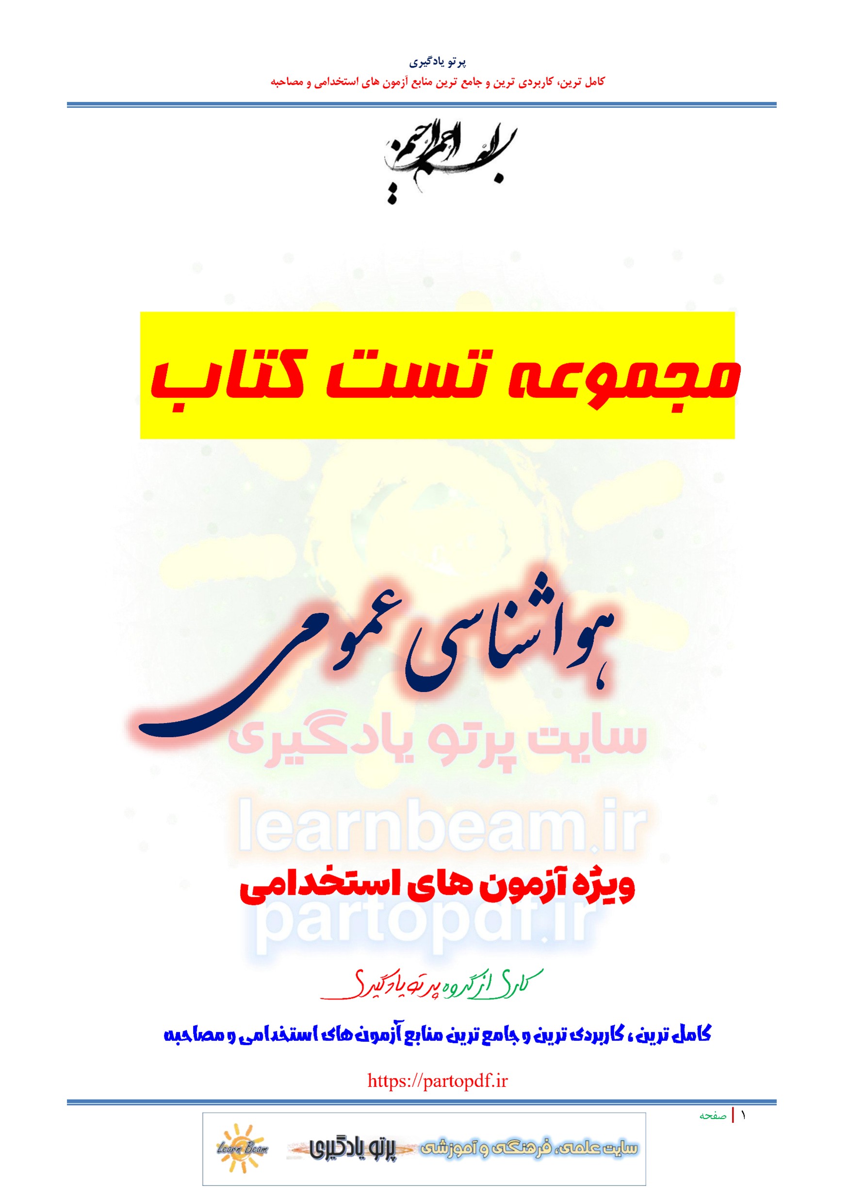 سوالات و تست کتاب هواشناسی عمومی سوالات تستی کتاب هواشناسی عمومی شامل 370 سوال تستی در 154 صفحه با پاسخ تشریحی در قالب فایل pdf. مطابق با سرفصل های دفترچه آزمون های استخدامی. مجموعه تستی کتاب هواشناسی عمومی بهترین منبع برای آمادگی آزمون های استخدامی می باشد. مجموعه سوالات و تست کتاب هواشناسی عمومی مطالب خوانده شده داوطلبین آزمون استخدامی را نظم بخشیده و منسجم می سازد. مجموعه سوالات تستی کتاب هواشناسی عمومی ویژه آزمون های استخدامی مرور سریع داوطلب را سبب می شود و آگاهی های وی را نظم بخشیده و یک آمادگی و شبیه سازی را برای جلسه آزمون به همراه دارد. مطالعه پک مجموعه سوالات و تست کتاب هواشناسی عمومی این منبع داوطلبین آزمون های استخدامی پیشنهاد می شود.