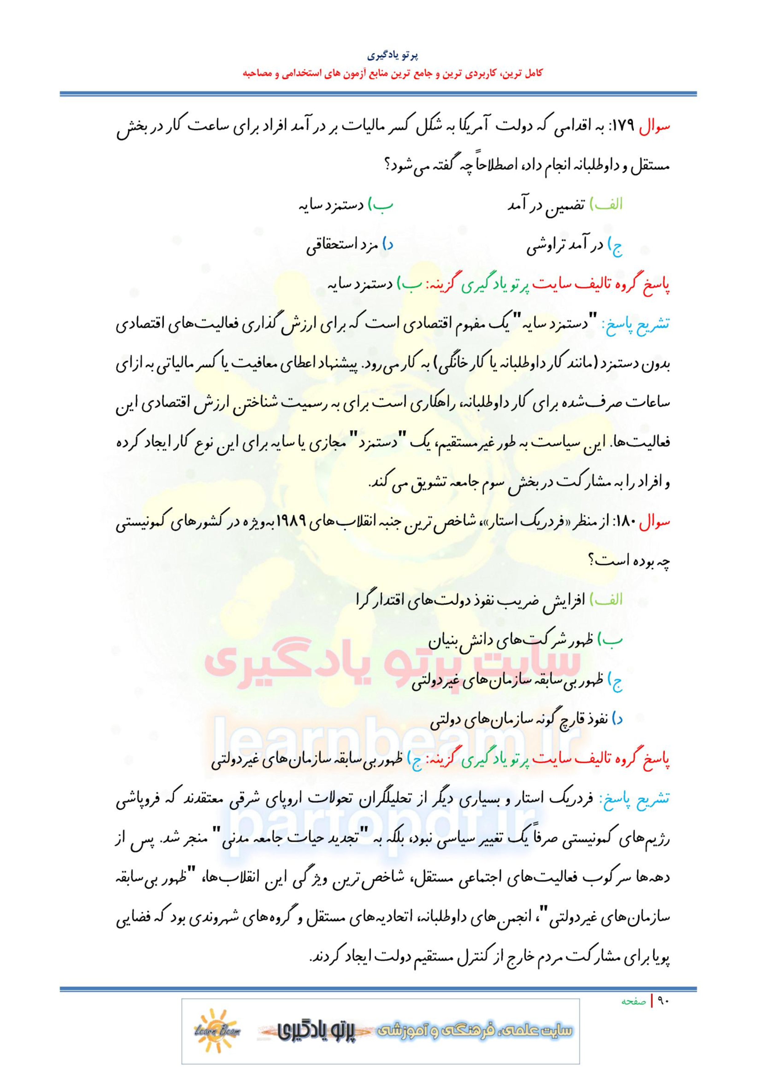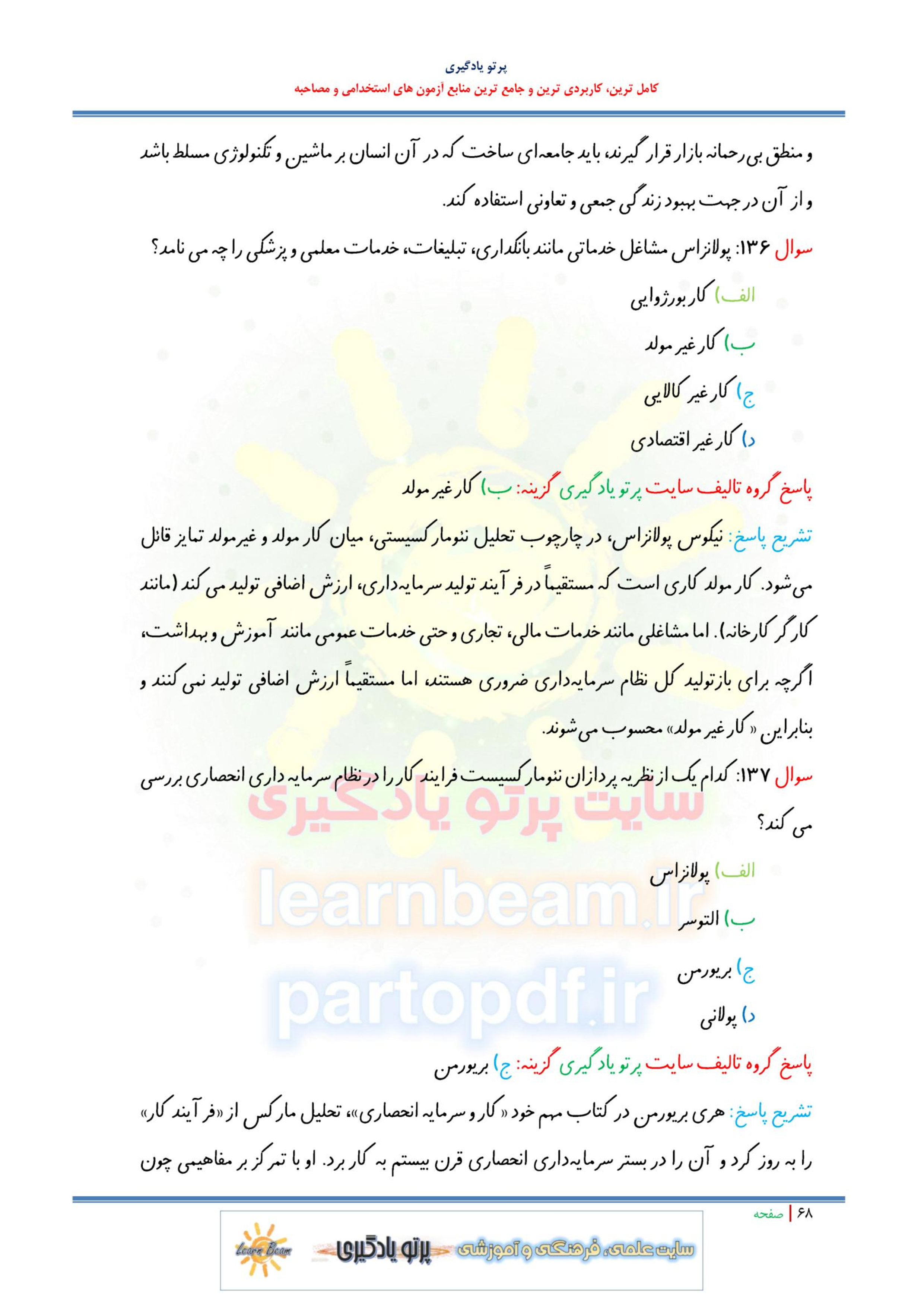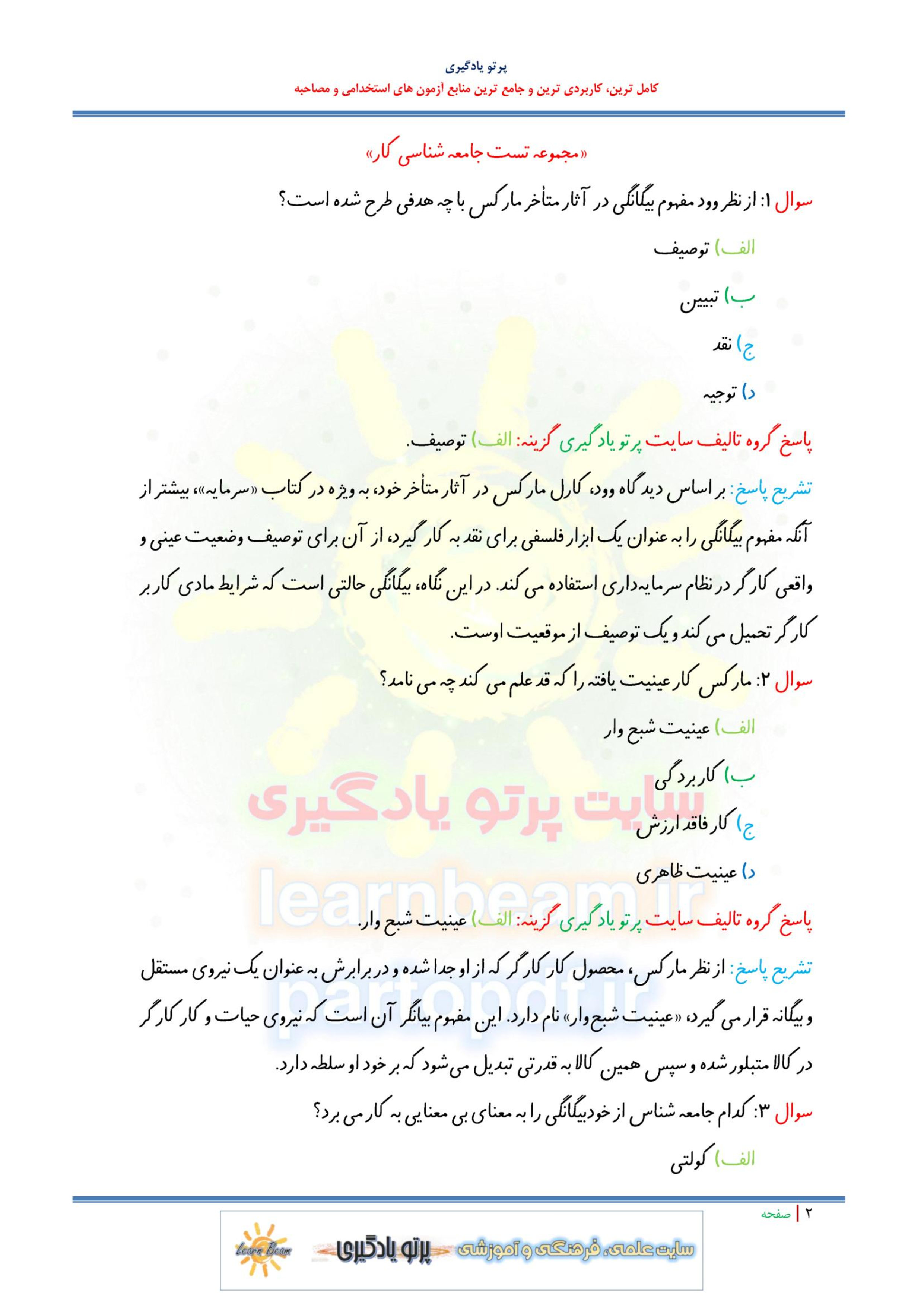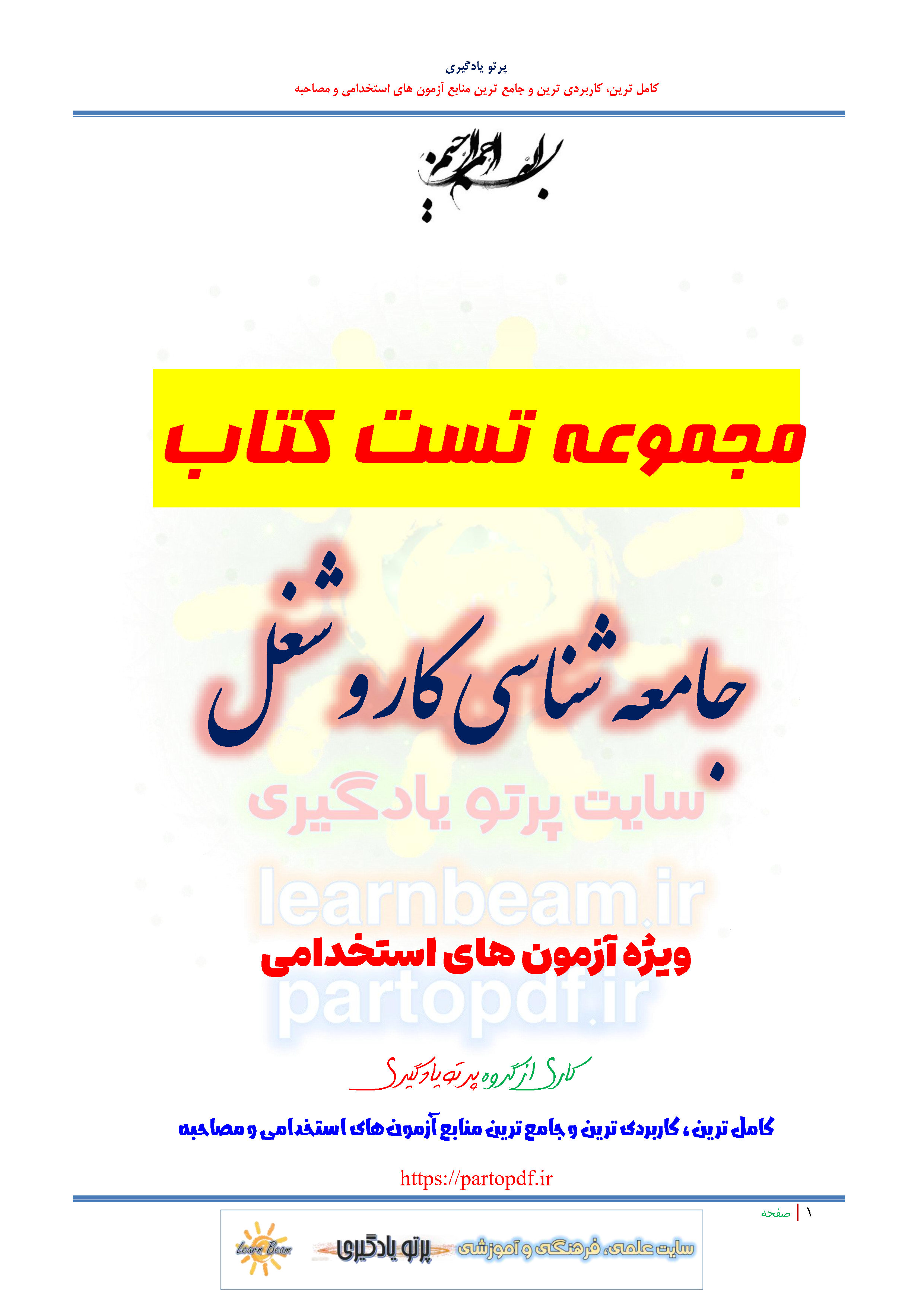 سوالات و تست کتاب جامعه شناسی کار و شغل سوالات کتاب جامعه شناسی کار و شغل شامل 180 سوال تستی در 90 صفحه با پاسخ تشریحی در قالب فایل pdf. بهترین منبع برای آزمون های استخدامی می باشد. مجموعه سوالات تستی کتاب جامعه شناسی کار و شغل مطالب خوانده شده داوطلبین آزمون استخدامی را نظم بخشیده و منسجم می سازد. این مجموعه مرور سریع داوطلب را سبب می شود و آگاهی های وی را نظم بخشیده و یک آمادگی و شبیه سازی را برای جلسه آزمون به همراه دارد. مطالعه این منبع برای همه داوطلبین شرکت کننده در آزمون های استخدامی پیشنهاد می شود.