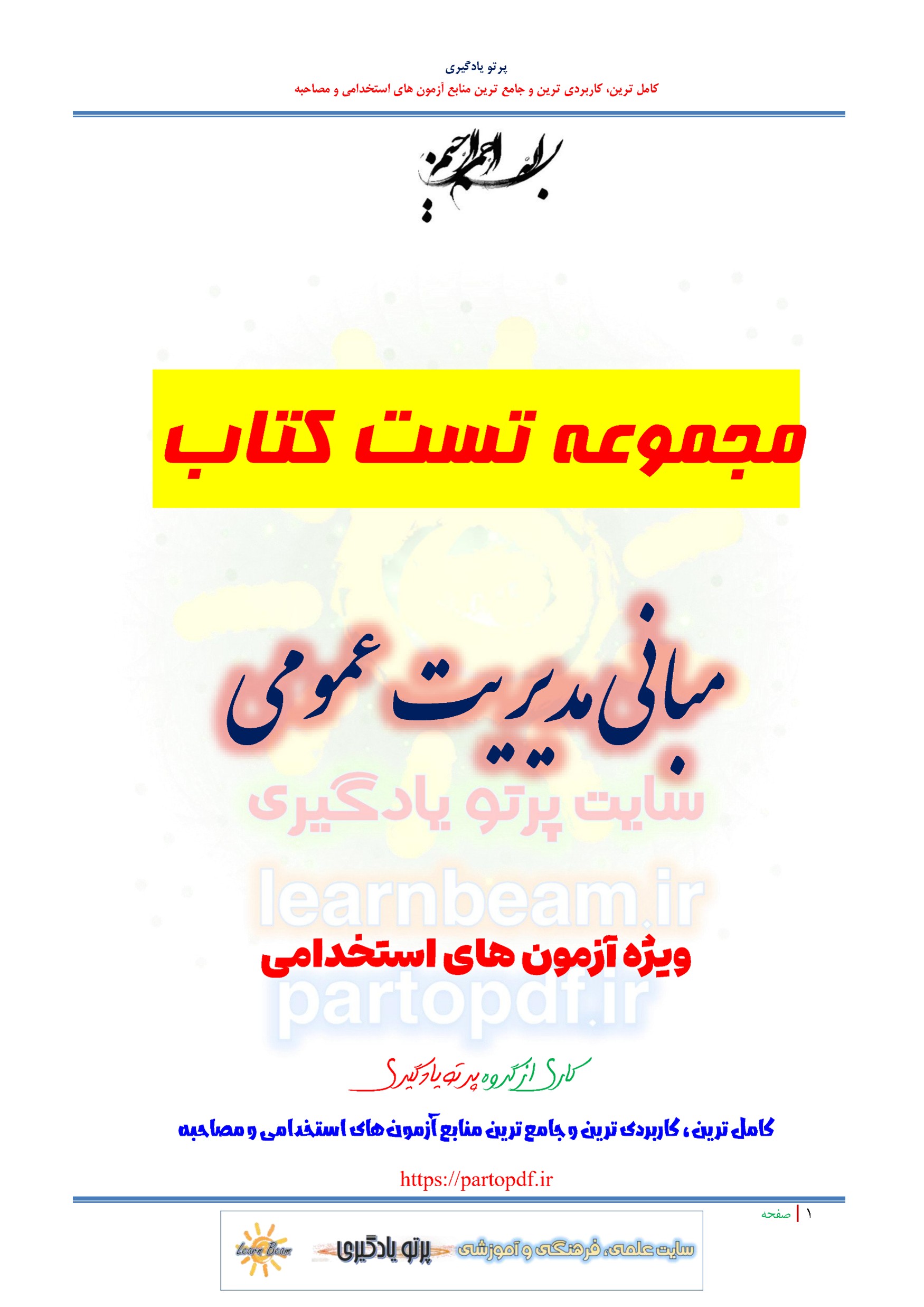 سوالات و تست کتاب مبانی مدیریت عمومی سوالات کتاب مبانی مدیریت عمومی شامل 130 سوال تستی در 69 صفحه با پاسخ تشریحی در قالب فایل pdf. بهترین منبع برای آزمون های استخدامی می باشد. مجموعه سوالات تستی کتاب مبانی مدیریت عمومی مطالب خوانده شده داوطلبین آزمون استخدامی را نظم بخشیده و منسجم می سازد. این مجموعه مرور سریع داوطلب را سبب می شود و آگاهی های وی را نظم بخشیده و یک آمادگی و شبیه سازی را برای جلسه آزمون به همراه دارد. مطالعه این منبع برای همه داوطلبین شرکت کننده در آزمون های استخدامی پیشنهاد می شود.