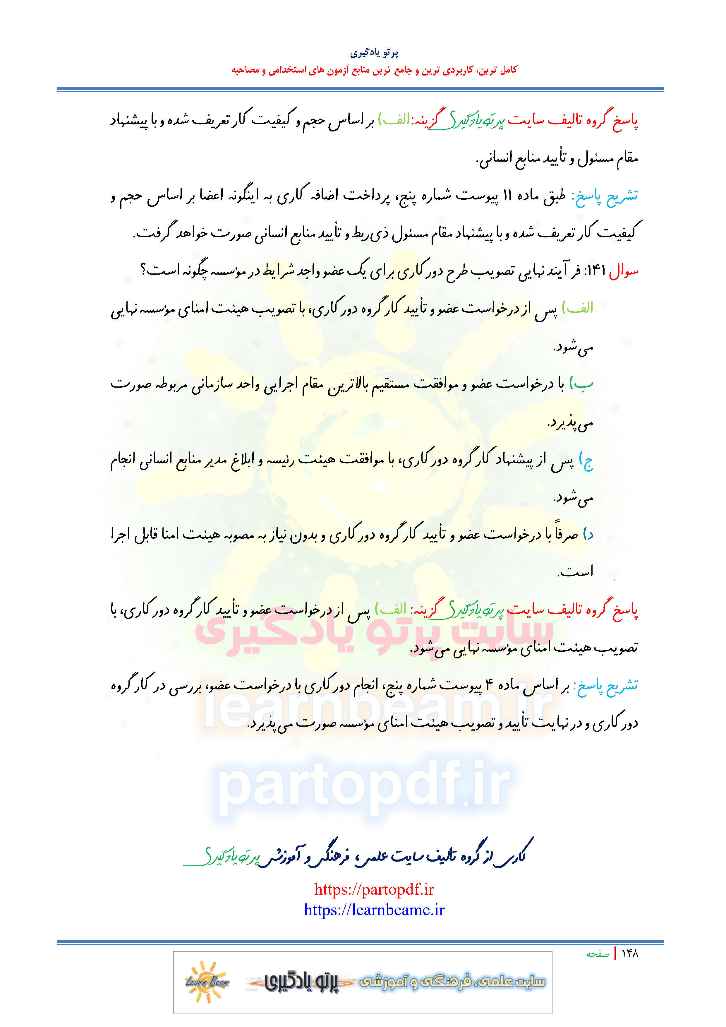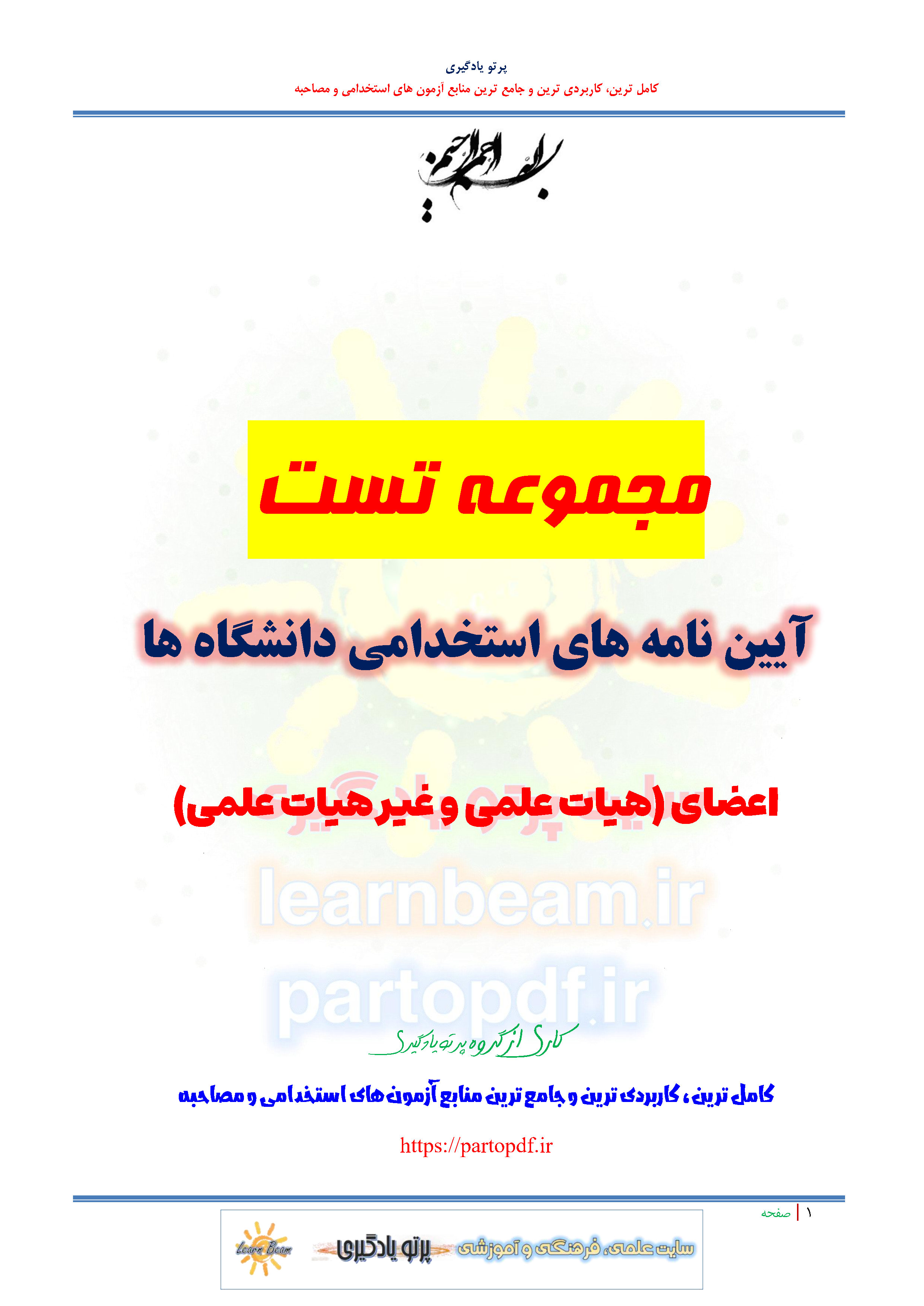 سوالات و تست آیین نامه های استخدامی دانشگاه ها هیات علمی و غیر هیات علمی سوالات آیین نامه های استخدامی دانشگاه ها هیات علمی و غیر هیات علمی شامل 190 سوال تستی آیین نامه استخدامی اعضای هیئت علمی و 141 سوال تستی آیین نامه استخدامی اعضای هیئت غیر علمی و جمعا 331 سوال تستی در 148 صفحه با پاسخ تشریحی در قالب فایل pdf. بهترین منبع برای آزمون های استخدامی می باشد. مجموعه سوالات تستی آیین نامه های استخدامی دانشگاه ها هیئت علمی و غیر هیئت علمی مطالب خوانده شده داوطلبین آزمون استخدامی را نظم بخشیده و منسجم می سازد. این مجموعه مرور سریع داوطلب را سبب می شود و آگاهی های وی را نظم بخشیده و یک آمادگی و شبیه سازی را برای جلسه آزمون به همراه دارد. مطالعه این منبع برای همه داوطلبین شرکت کننده در آزمون های استخدامی پیشنهاد می شود.