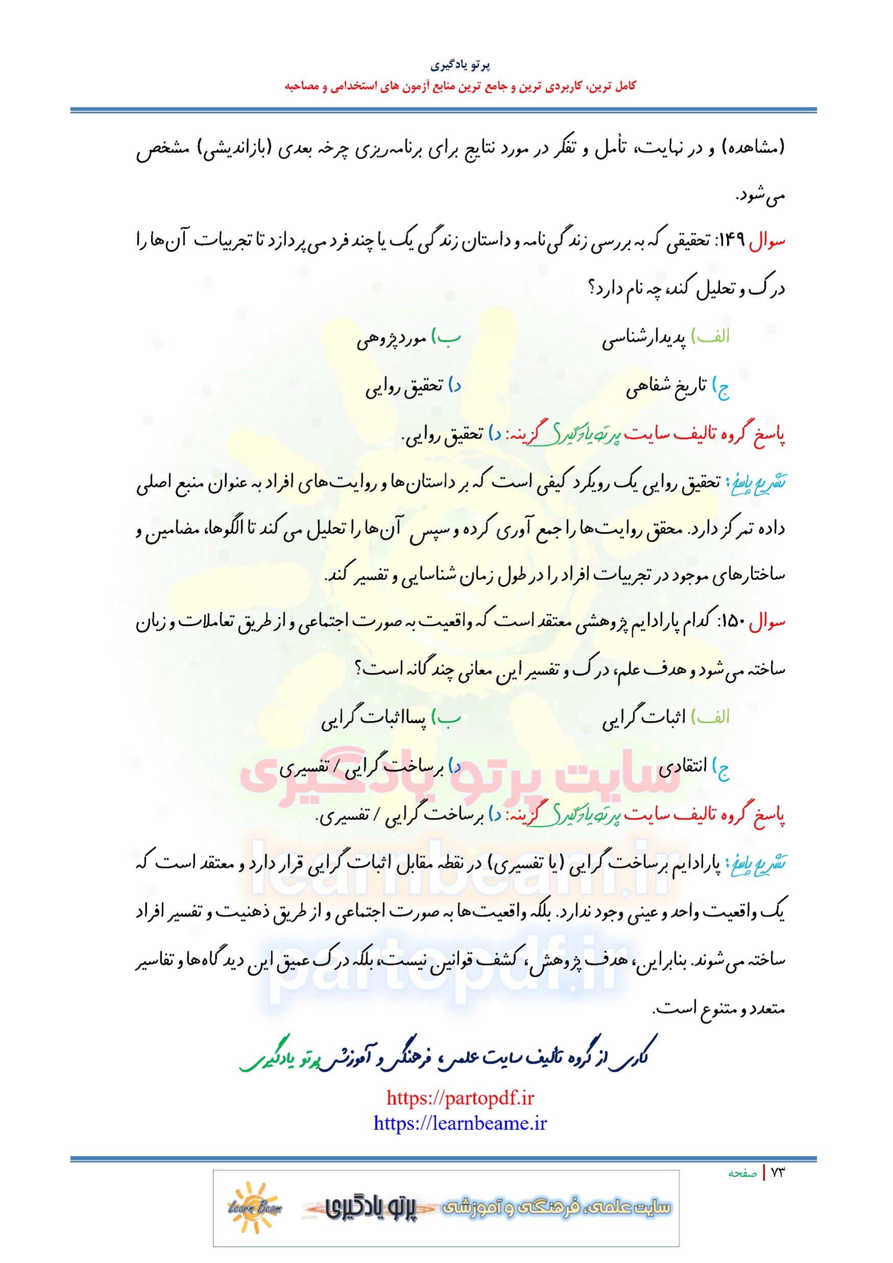 سوالات و تست کتاب روش تحقیق سوالات کتاب روش تحقیق شامل 150 سوال تستی در 73 صفحه با پاسخ تشریحی در قالب فایل pdf. بهترین منبع برای آزمون های استخدامی می باشد. مجموعه سوالات تستی کتاب روش تحقیق مطالب خوانده شده داوطلبین آزمون استخدامی را نظم بخشیده و منسجم می سازد. این مجموعه مرور سریع داوطلب را سبب می شود و آگاهی های وی را نظم بخشیده و یک آمادگی و شبیه سازی را برای جلسه آزمون به همراه دارد. مطالعه این منبع برای همه داوطلبین شرکت کننده در آزمون های استخدامی پیشنهاد می شود.