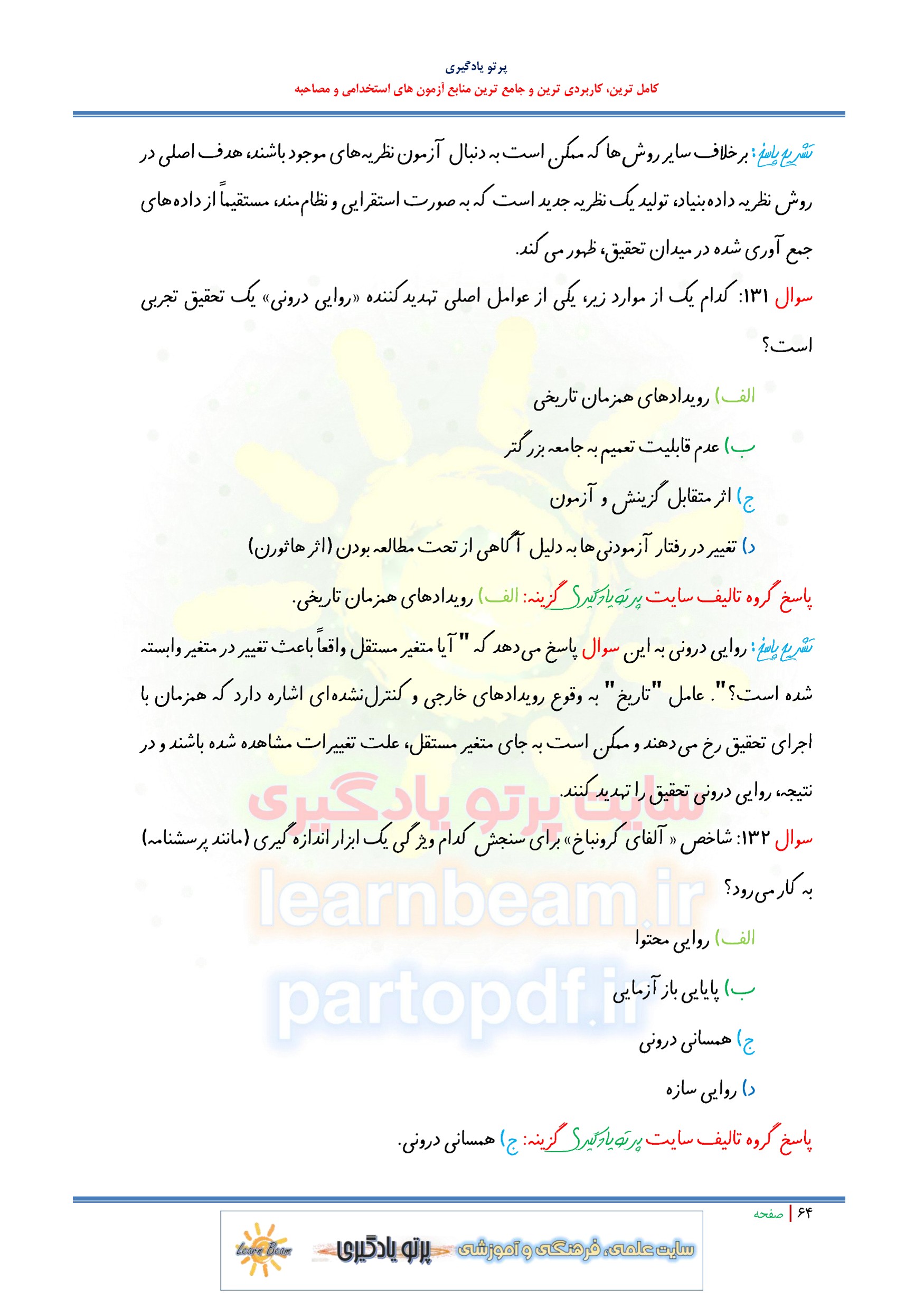 سوالات و تست کتاب روش تحقیق سوالات تستی کتاب روش تحقیق شامل 150 سوال تستی در 73 صفحه با پاسخ تشریحی در قالب فایل pdf. مطابق با سرفصل های دفترچه آزمون های استخدامی مجموعه تستی کتاب روش تحقیق بهترین منبع برای آمادگی آزمون های استخدامی می باشد. مجموعه سوالات و تست کتاب روش تحقیق مطالب خوانده شده داوطلبین آزمون استخدامی را نظم بخشیده و منسجم می سازد. مجموعه سوالات تستی کتاب روش تحقیق ویژه آزمون های استخدامی مرور سریع داوطلب را سبب می شود و آگاهی های وی را نظم بخشیده و یک آمادگی و شبیه سازی را برای جلسه آزمون به همراه دارد. مطالعه پک مجموعه سوالات و تست کتاب روش تحقیق برای داوطلبین آزمون های استخدامی پیشنهاد می شود.