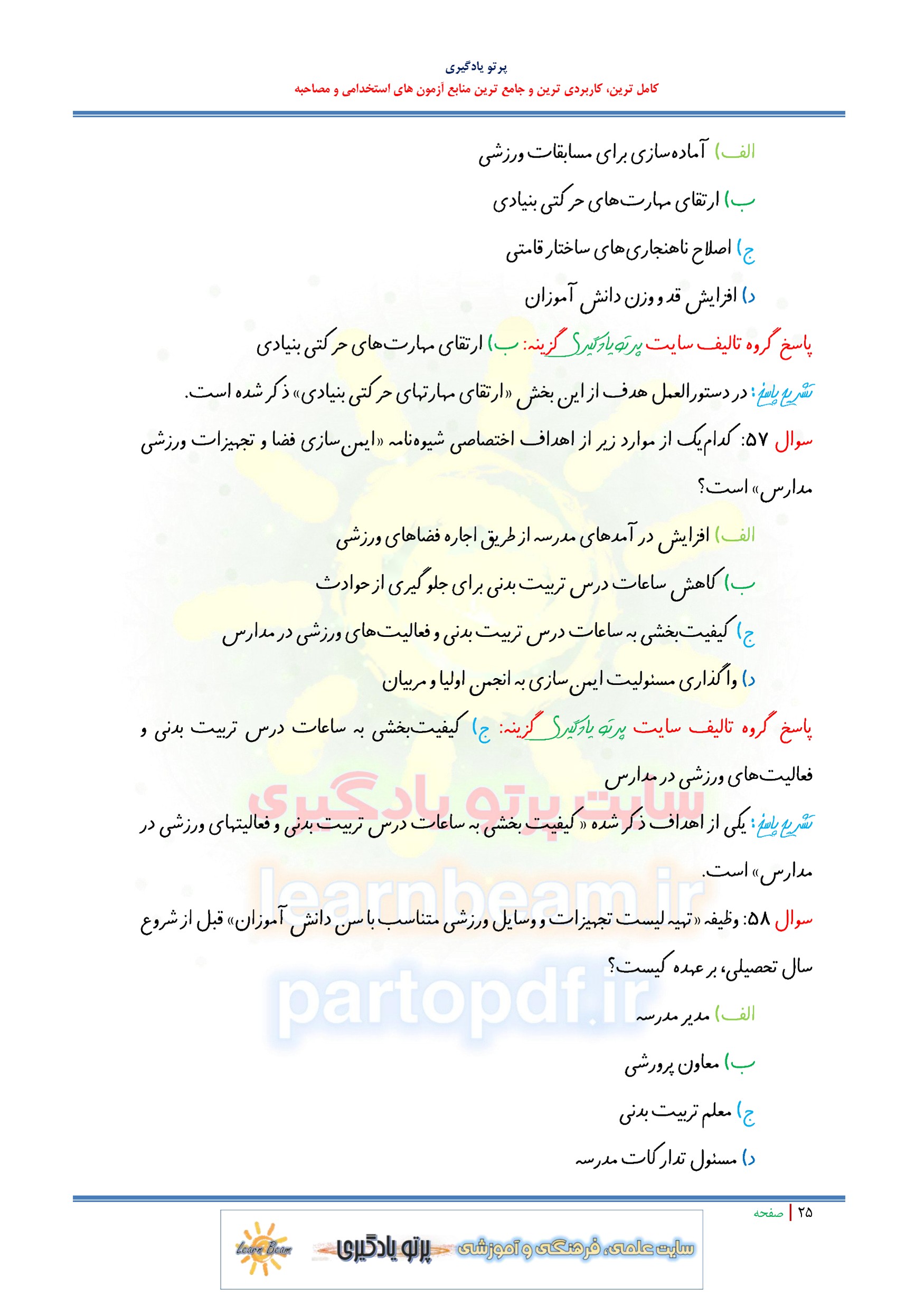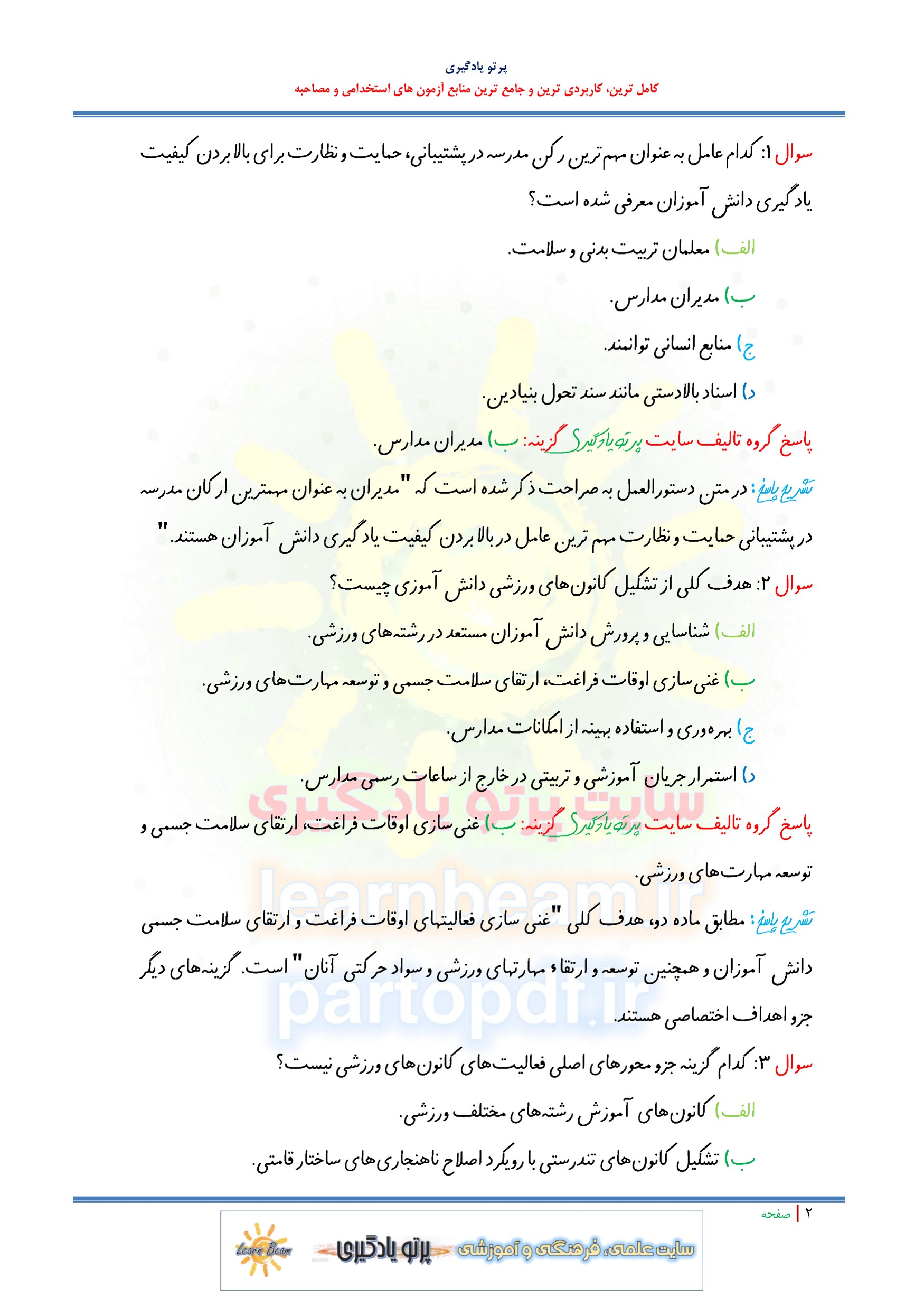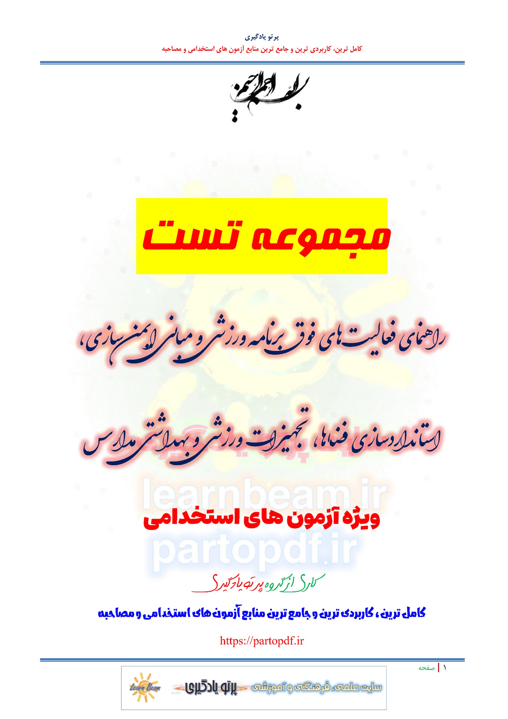 مجموعه سوالات و تست کتاب راهنمای فعالیتهای فوق برنامه ورزشی و مبانی ایمنسازی استانداردسازی فضاها تجهیزات ورزشی و بهداشتی مدارس با پاسخ تشریحی