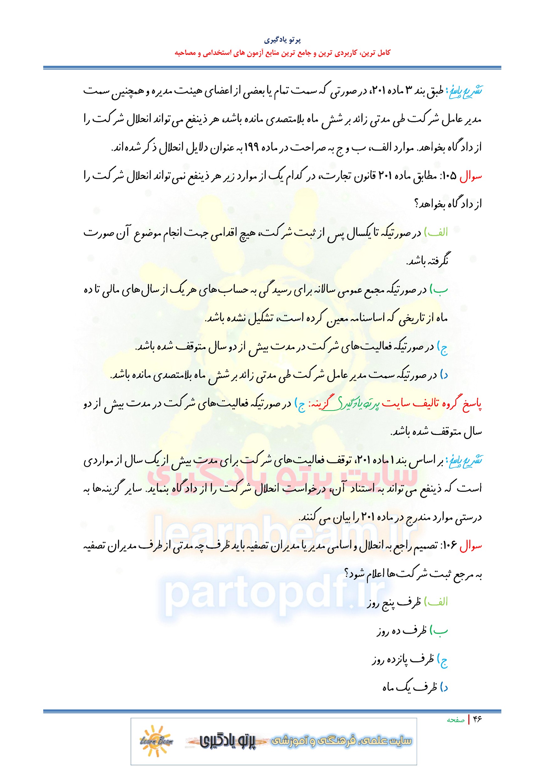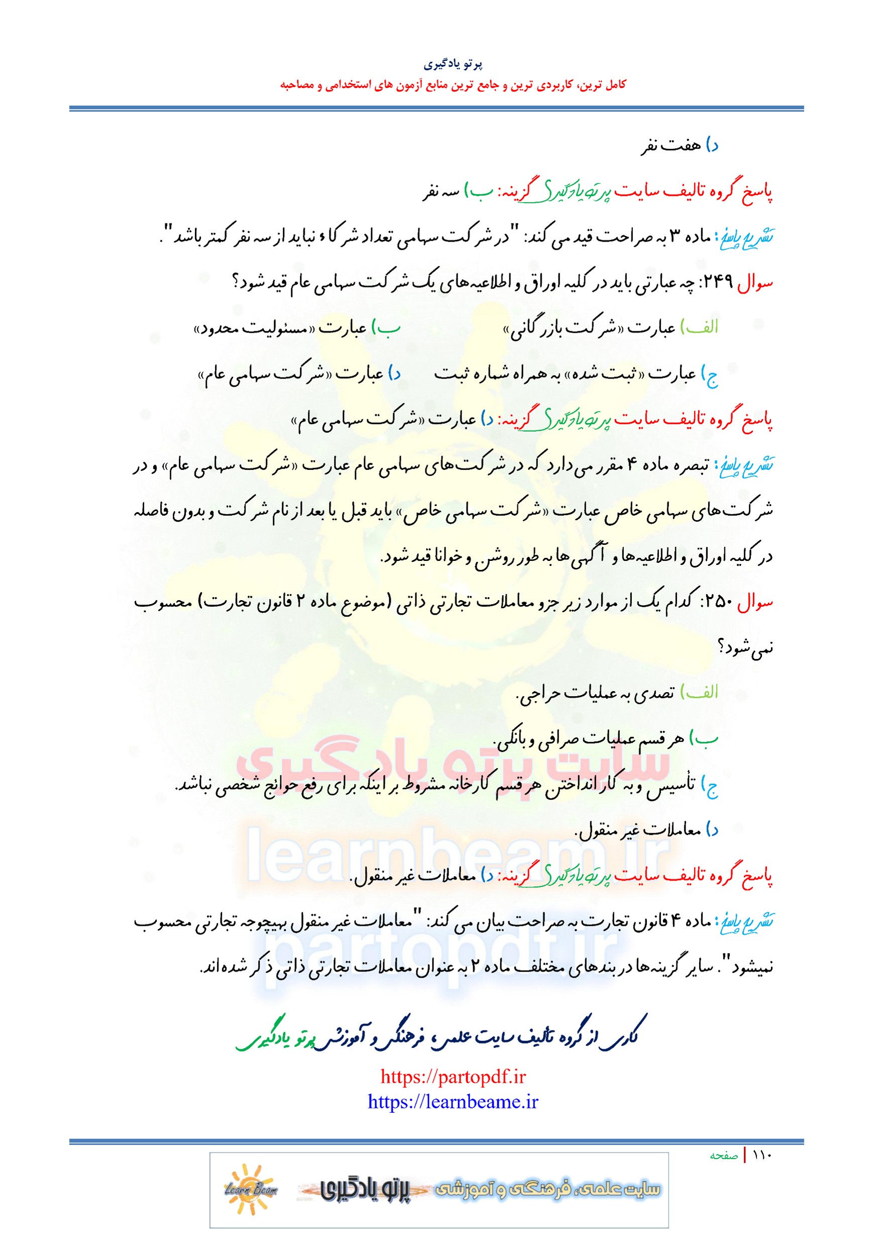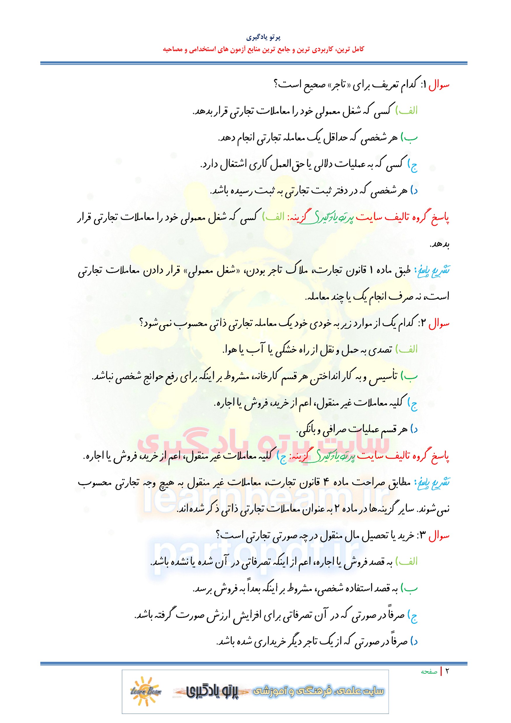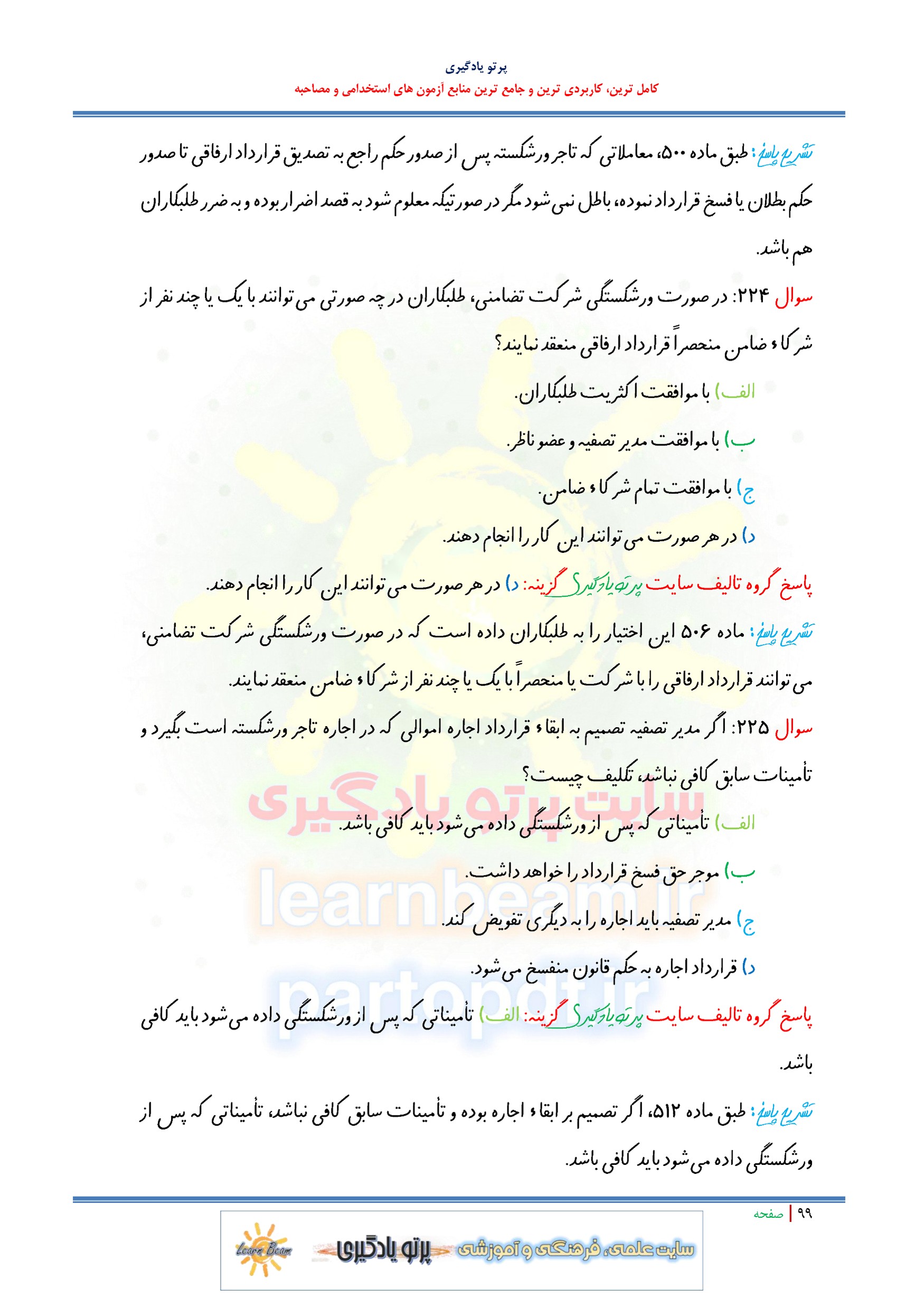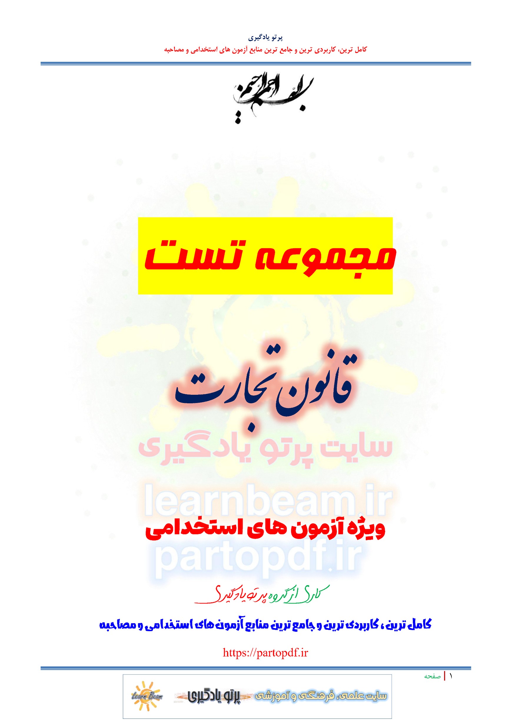 سوالات و تست قانون تجارت سوالات کتاب قانون تجارت شامل 250 سوال تستی در 110 صفحه با پاسخ تشریحی در قالب فایل pdf. بهترین منبع برای آزمون های استخدامی می باشد. مجموعه سوالات تستی قانون تجارت مطالب خوانده شده داوطلبین آزمون استخدامی را نظم بخشیده و منسجم می سازد. این مجموعه مرور سریع داوطلب را سبب می شود و آگاهی های وی را نظم بخشیده و یک آمادگی و شبیه سازی را برای جلسه آزمون به همراه دارد. مطالعه این منبع برای همه داوطلبین شرکت کننده در آزمون های استخدامی پیشنهاد می شود.