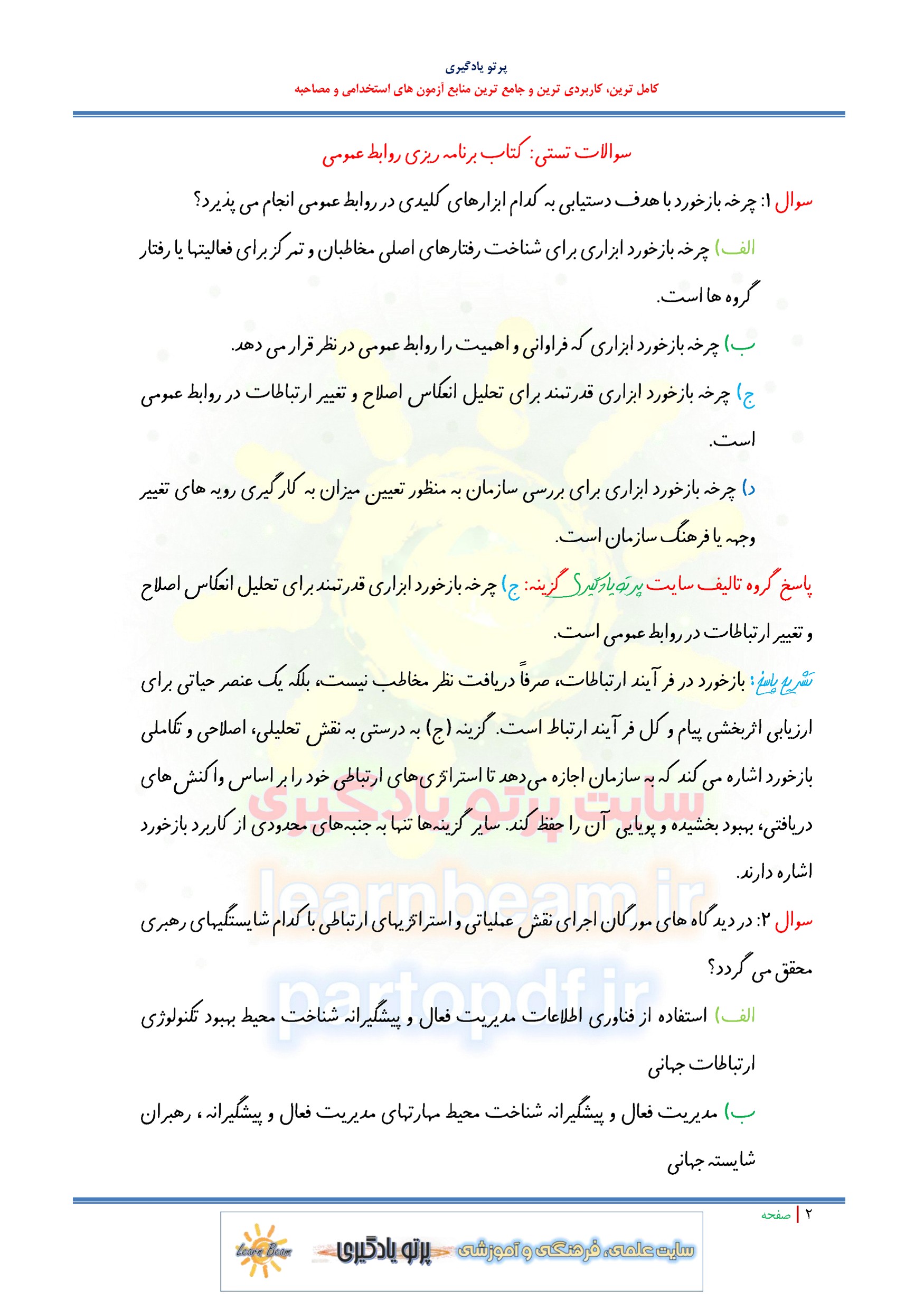 مجموعه سوالات و تست کتاب برنامه ریزی روابط عمومی با پاسخ تشریحی