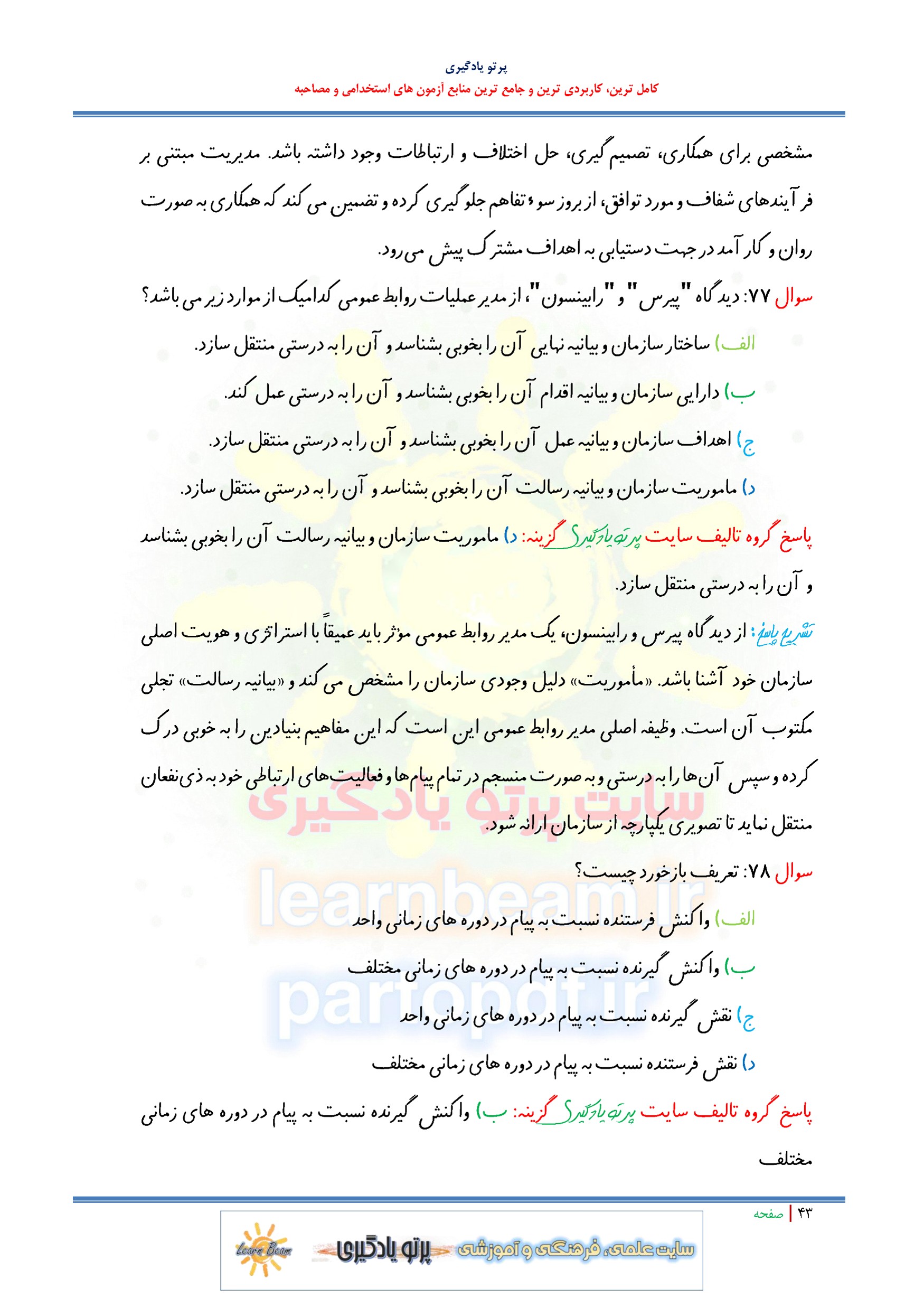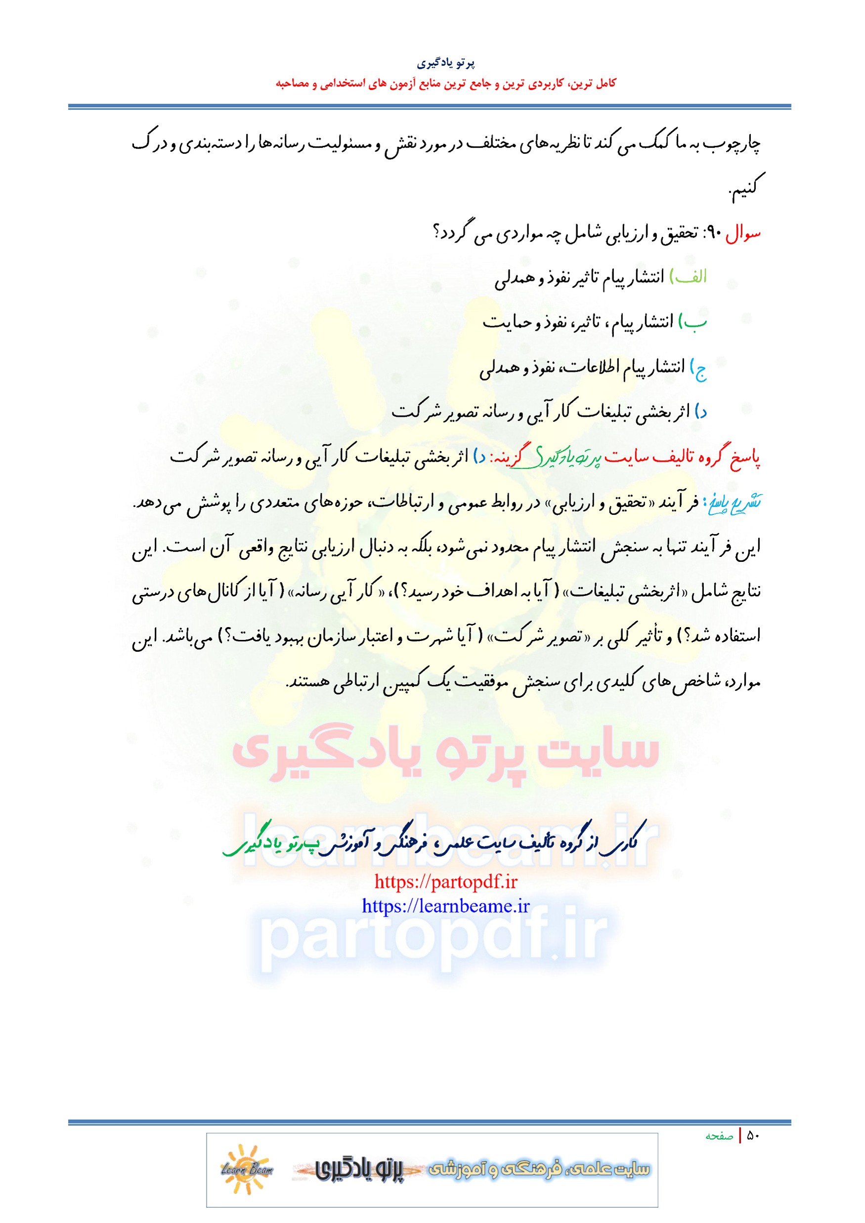 سوالات و تست کتاب مدیریت روابط عمومی سوالات کتاب برنامه ریزی روابط عمومی شامل 90 سوال تستی در 50 صفحه با پاسخ تشریحی در قالب فایل pdf. بهترین منبع برای آزمون های استخدامی می باشد. مجموعه سوالات تستی کتاب برنامه ریزی روابط عمومی مطالب خوانده شده داوطلبین آزمون استخدامی را نظم بخشیده و منسجم می سازد. این مجموعه مرور سریع داوطلب را سبب می شود و آگاهی های وی را نظم بخشیده و یک آمادگی و شبیه سازی را برای جلسه آزمون به همراه دارد. مطالعه این منبع برای همه داوطلبین شرکت کننده در آزمون های استخدامی پیشنهاد می شود.