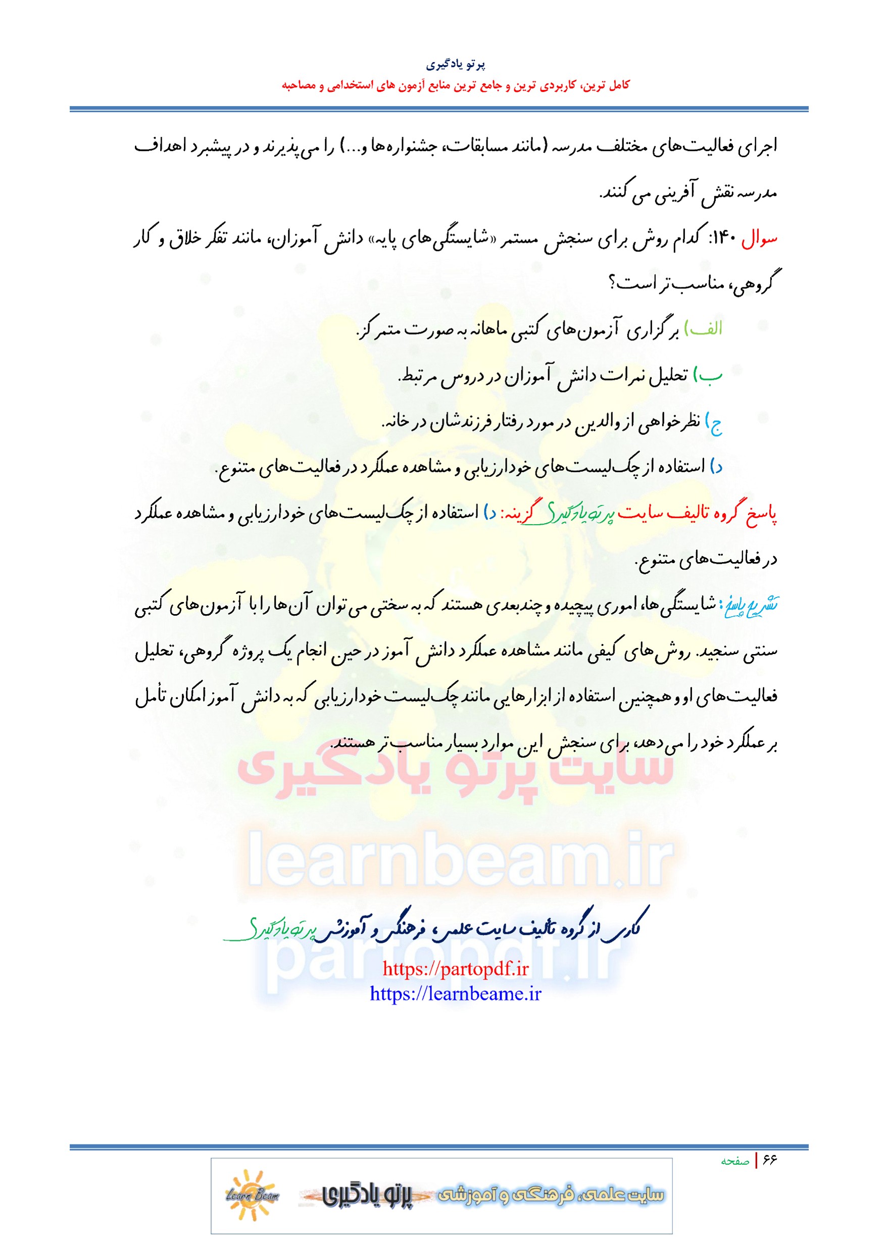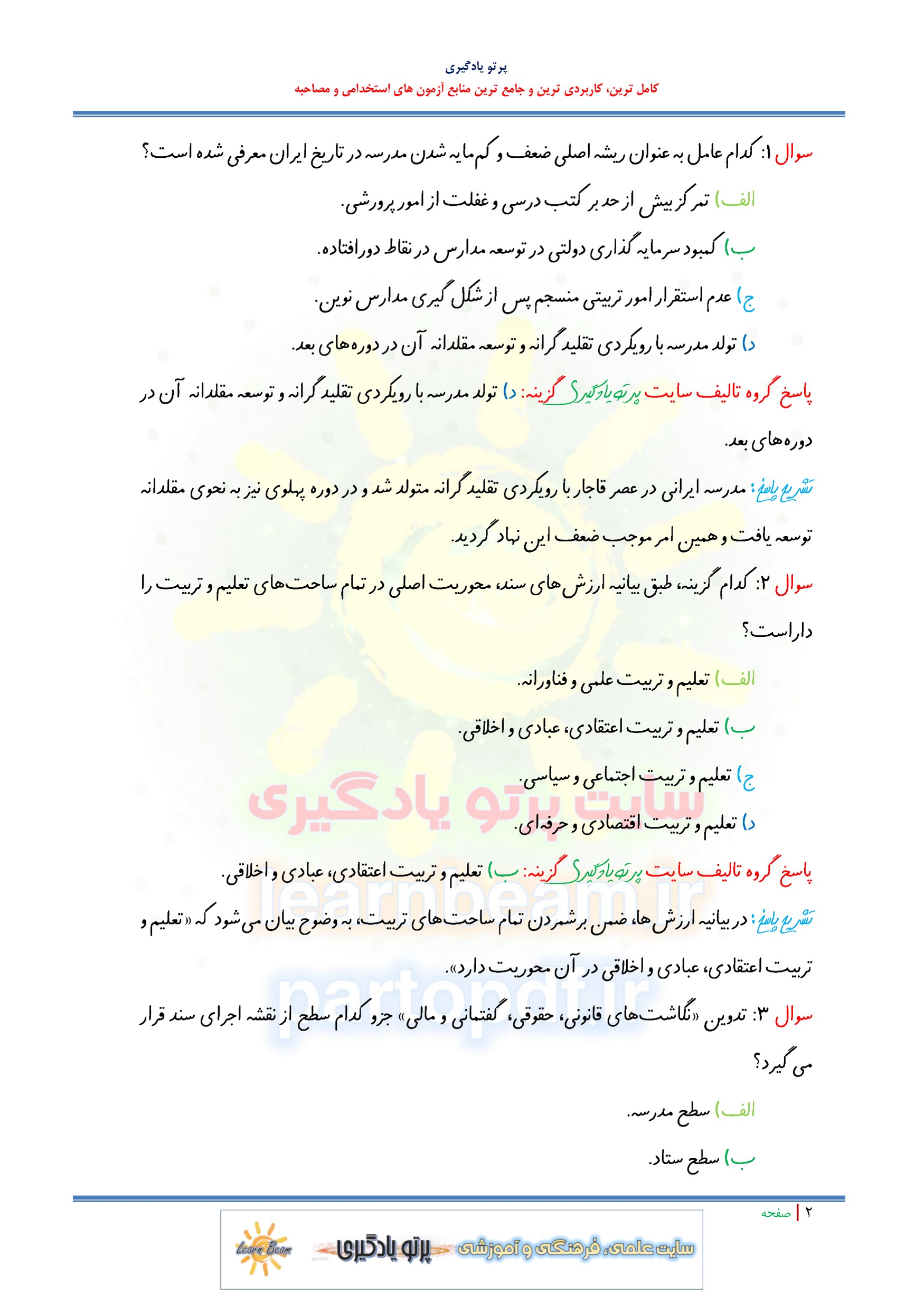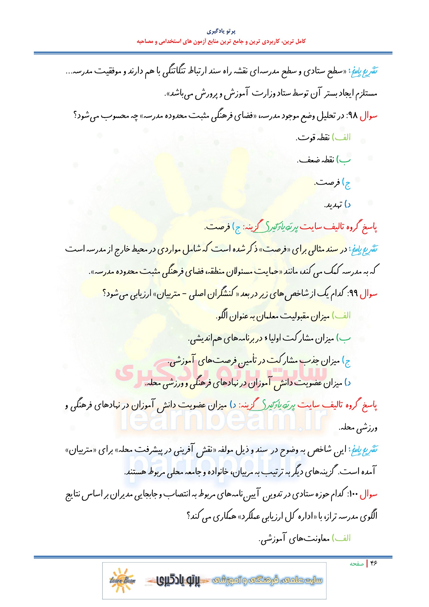 سوالات تستی کتاب مدرسه تراز سند تحول بنیادین آموزش و پرورش
