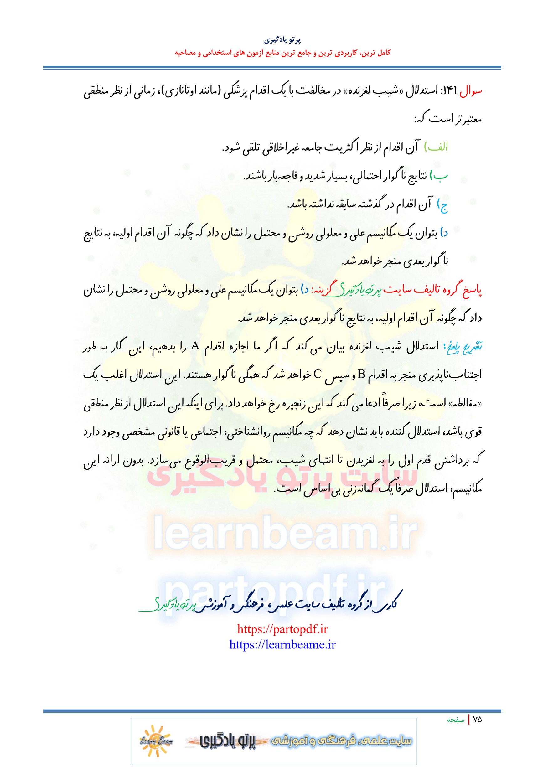 سوالات و تست کتاب اخلاق پزشکی سوالات کتاب اخلاق پزشکی شامل 141 سوال تستی در 75 صفحه با پاسخ تشریحی در قالب فایل pdf. بهترین منبع برای آزمون های استخدامی می باشد. مجموعه سوالات تستی کتاب اخلاق پزشکی مطالب خوانده شده داوطلبین آزمون استخدامی را نظم بخشیده و منسجم می سازد. این مجموعه مرور سریع داوطلب را سبب می شود و آگاهی های وی را نظم بخشیده و یک آمادگی و شبیه سازی را برای جلسه آزمون به همراه دارد. مطالعه این منبع برای همه داوطلبین شرکت کننده در آزمون های استخدامی پیشنهاد می شود.