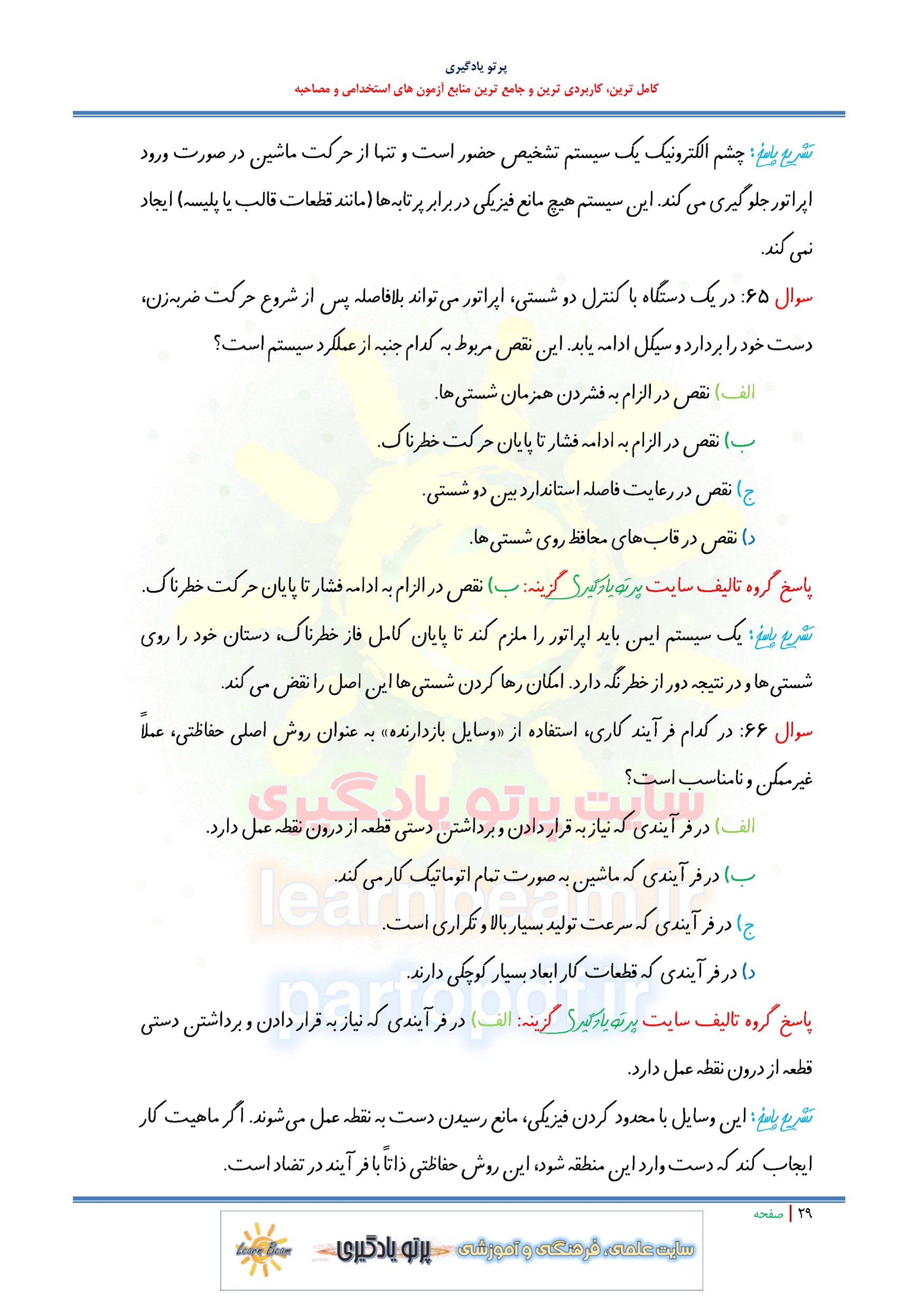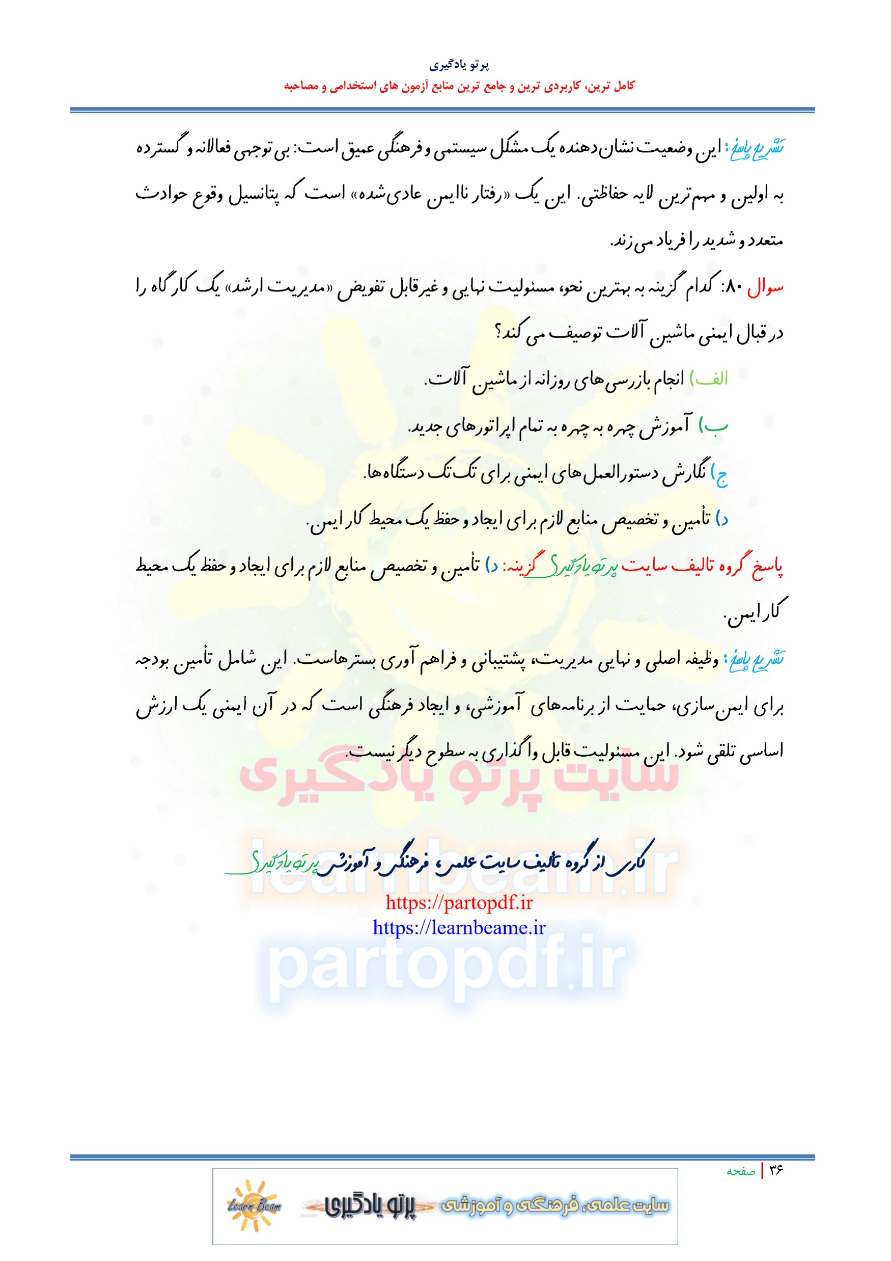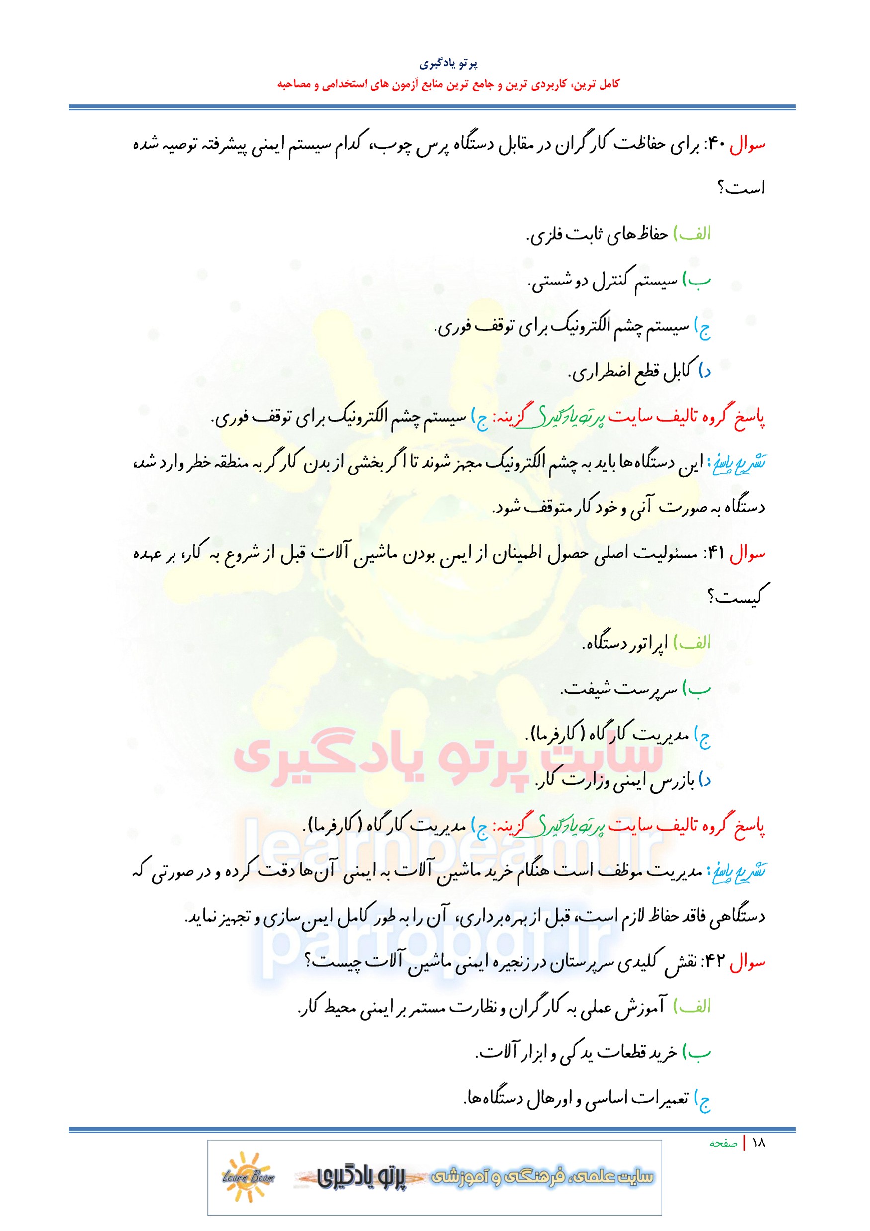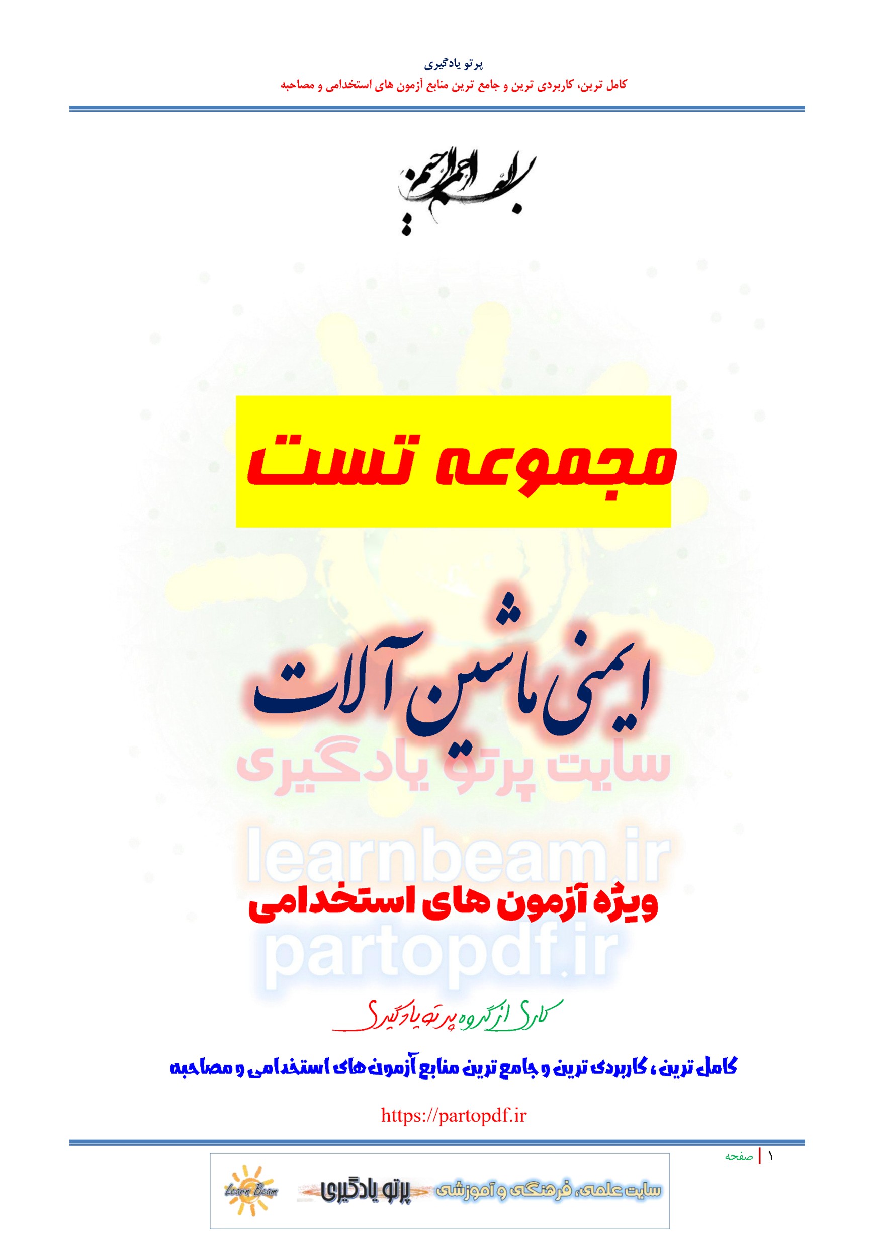 سوالات و تست ایمنی ماشین آلات سوالات کتاب ایمنی ماشین آلات شامل 80 سوال تستی در 36 صفحه با پاسخ تشریحی در قالب فایل pdf. بهترین منبع برای آزمون های استخدامی می باشد. مجموعه سوالات تستی ایمنی ماشین آلات مطالب خوانده شده داوطلبین آزمون استخدامی را نظم بخشیده و منسجم می سازد. این مجموعه مرور سریع داوطلب را سبب می شود و آگاهی های وی را نظم بخشیده و یک آمادگی و شبیه سازی را برای جلسه آزمون به همراه دارد. مطالعه این منبع برای همه داوطلبین شرکت کننده در آزمون های استخدامی پیشنهاد می شود.