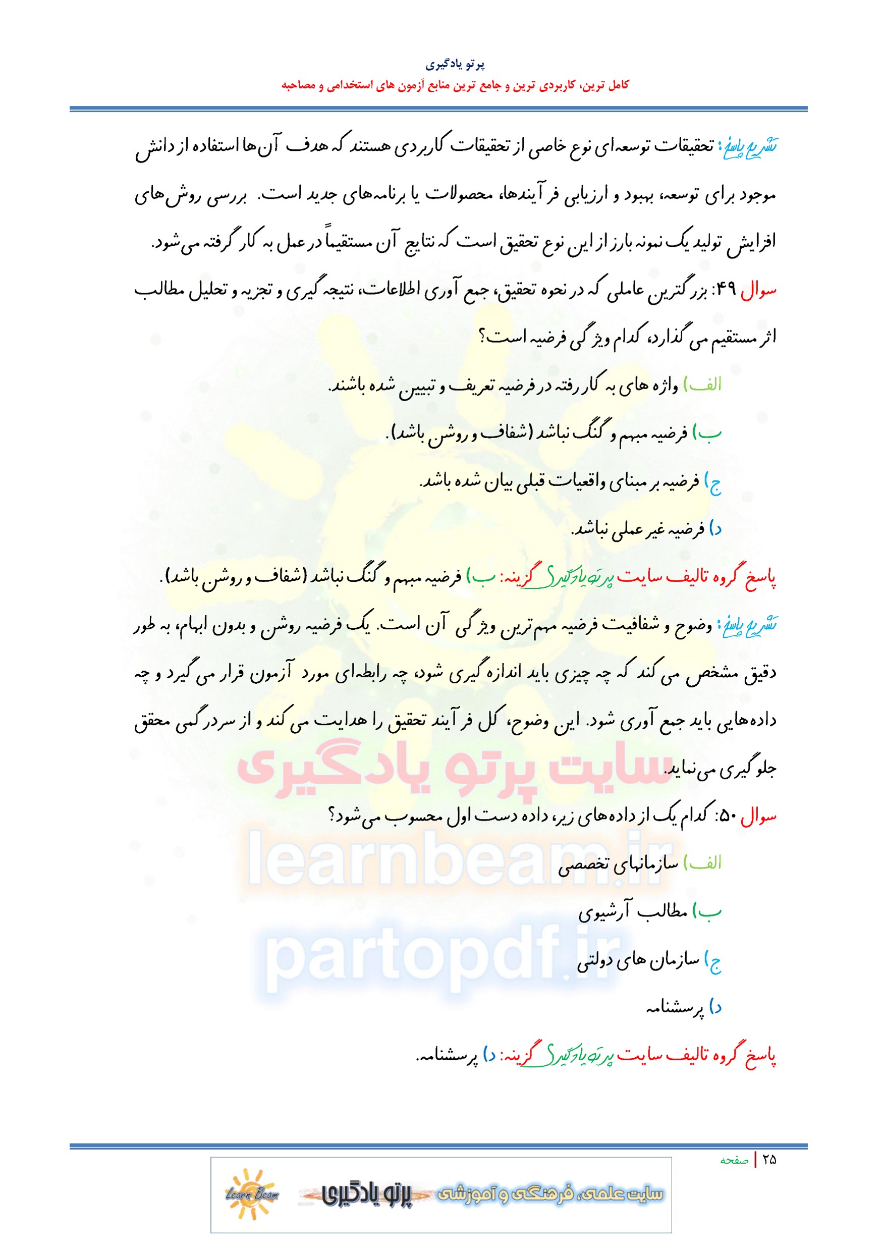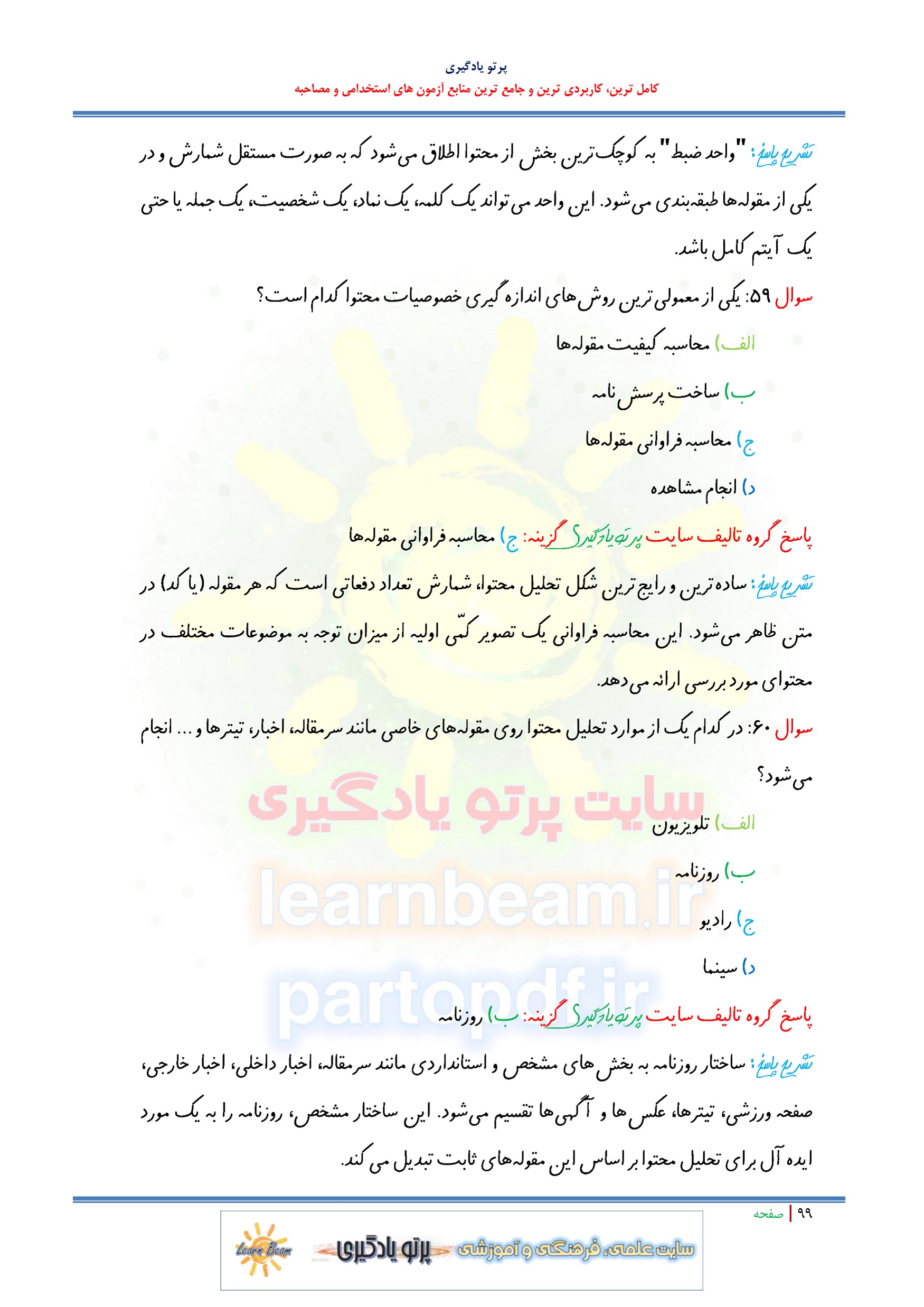 سوالات و تست کلیات روش تحقیق و تحلیل محتوا سوالات تستی کلیات روش تحقیق و تحلیل محتوا شامل 229 سوال تستی در 107 صفحه با پاسخ تشریحی در قالب فایل pdf. شامل 150 سوال تستی کلیات روش تحقیق و 79 سوال تحلیل محتوا. مطابق با سرفصل های دفترچه آزمون های استخدامی مجموعه تستی کلیات روش تحقیق و تحلیل محتوا بهترین منبع برای آمادگی آزمون های استخدامی می باشد. مجموعه سوالات و تست کلیات روش تحقیق و تحلیل محتوا مطالب خوانده شده داوطلبین آزمون استخدامی را نظم بخشیده و منسجم می سازد. مجموعه سوالات تستی کلیات روش تحقیق و تحلیل محتوا ویژه آزمون های استخدامی مرور سریع داوطلب را سبب می شود و آگاهی های وی را نظم بخشیده و یک آمادگی و شبیه سازی را برای جلسه آزمون به همراه دارد. مطالعه پک مجموعه سوالات و تست کلیات روش تحقیق و تحلیل محتوا برای داوطلبین آزمون های استخدامی پیشنهاد می شود.
