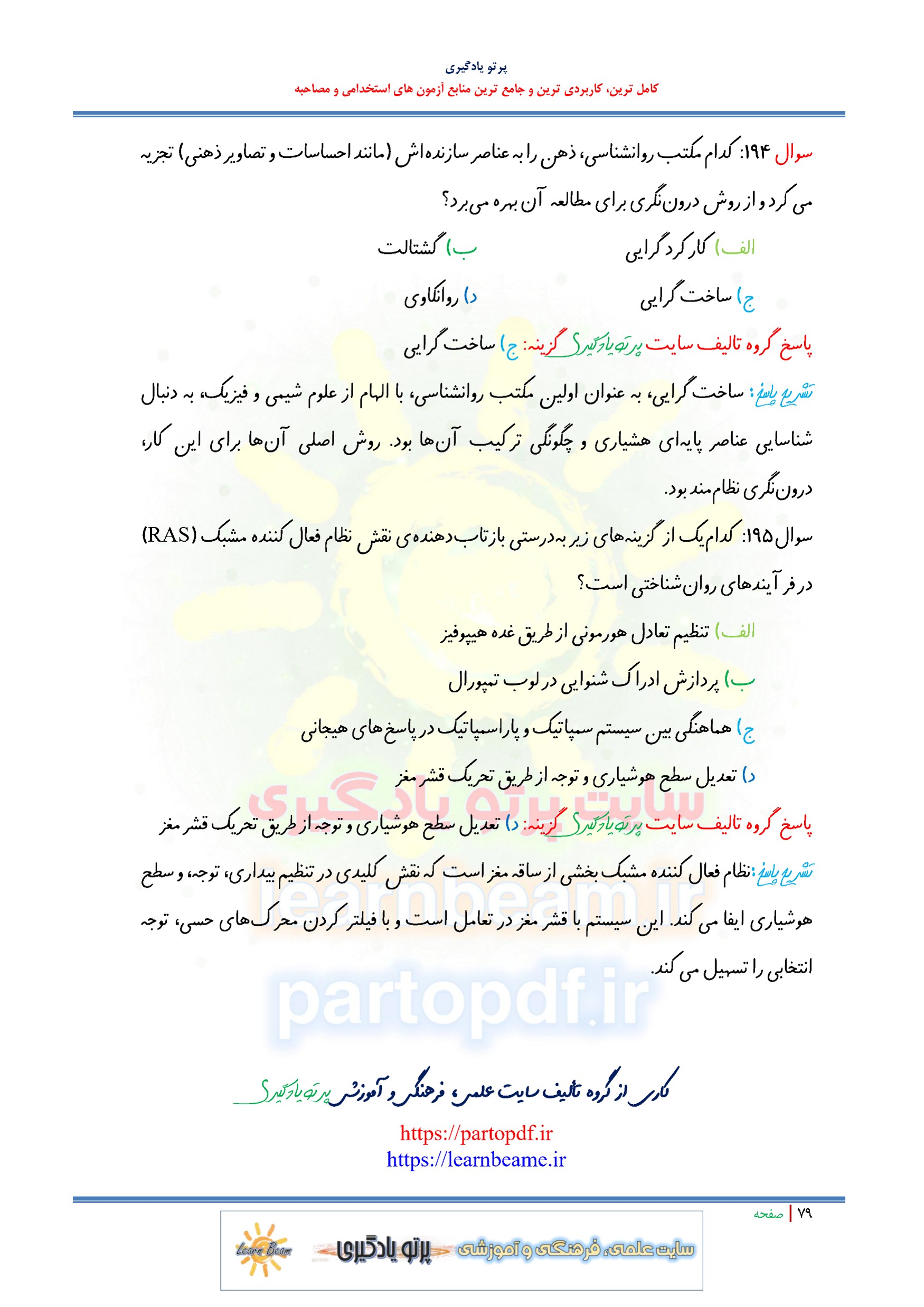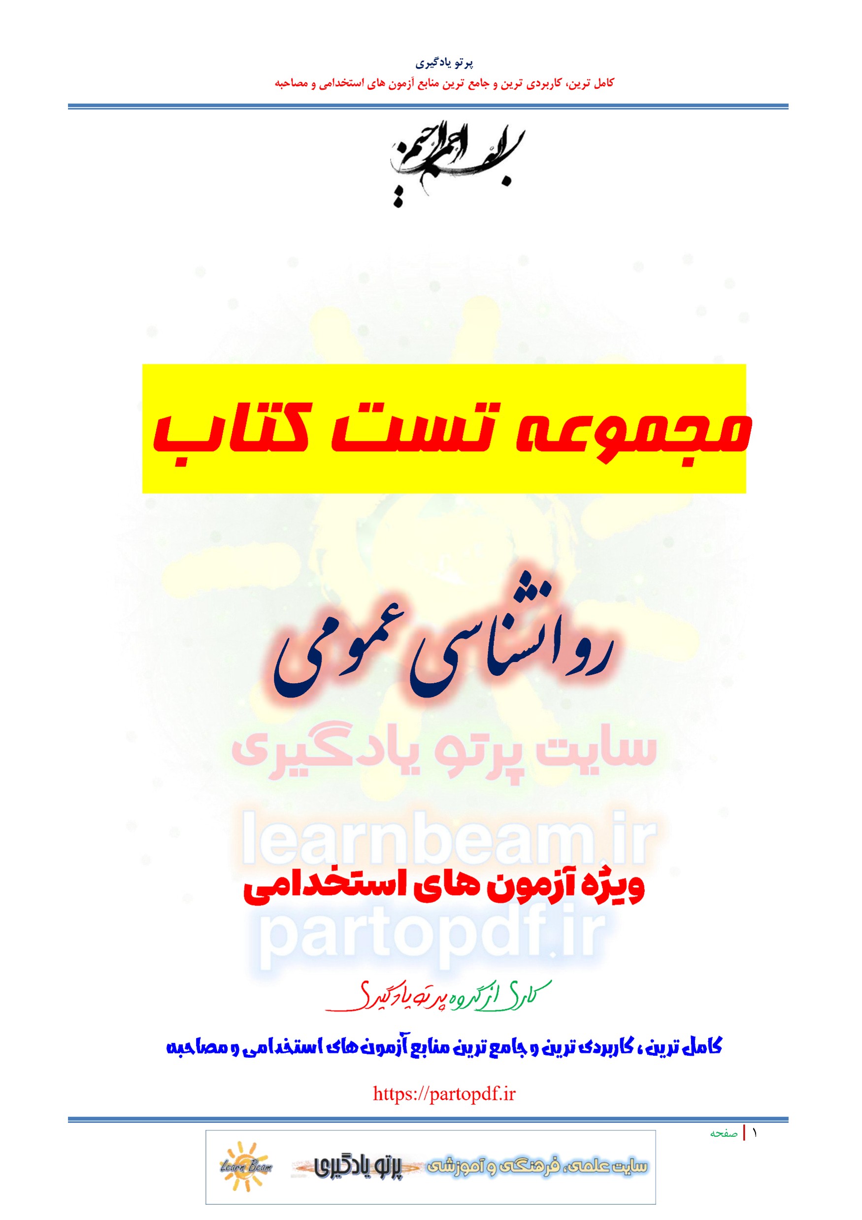سوالات و تست کتاب روانشناسی عمومی سوالات تستی کتاب روانشناسی عمومی شامل 195 سوال تستی در 79 صفحه با پاسخ تشریحی در قالب فایل pdf. مطابق با سرفصل های دفترچه آزمون های استخدامی مجموعه تستی کتاب روانشناسی عمومی بهترین منبع برای آمادگی آزمون های استخدامی می باشد. مجموعه سوالات و تست کتاب روانشناسی عمومی مطالب خوانده شده داوطلبین آزمون استخدامی را نظم بخشیده و منسجم می سازد. مجموعه سوالات تستی کتاب روانشناسی عمومی ویژه آزمون های استخدامی مرور سریع داوطلب را سبب می شود و آگاهی های وی را نظم بخشیده و یک آمادگی و شبیه سازی را برای جلسه آزمون به همراه دارد. مطالعه پک مجموعه سوالات و تست کتاب روانشناسی عمومی برای داوطلبین آزمون های استخدامی پیشنهاد می شود.