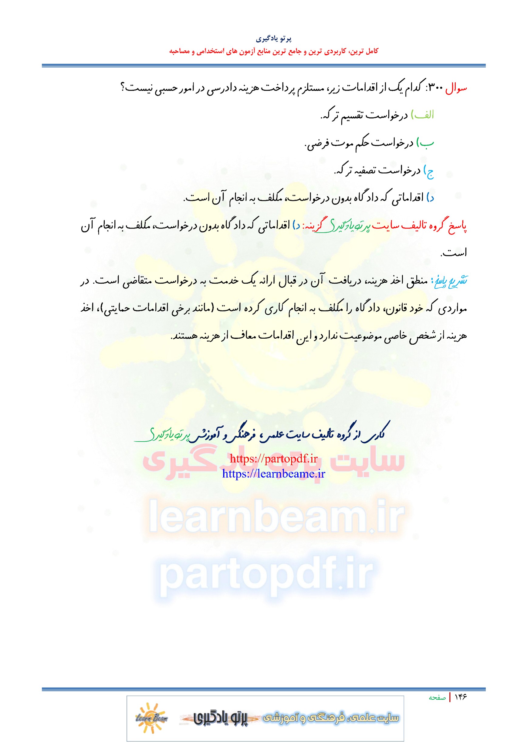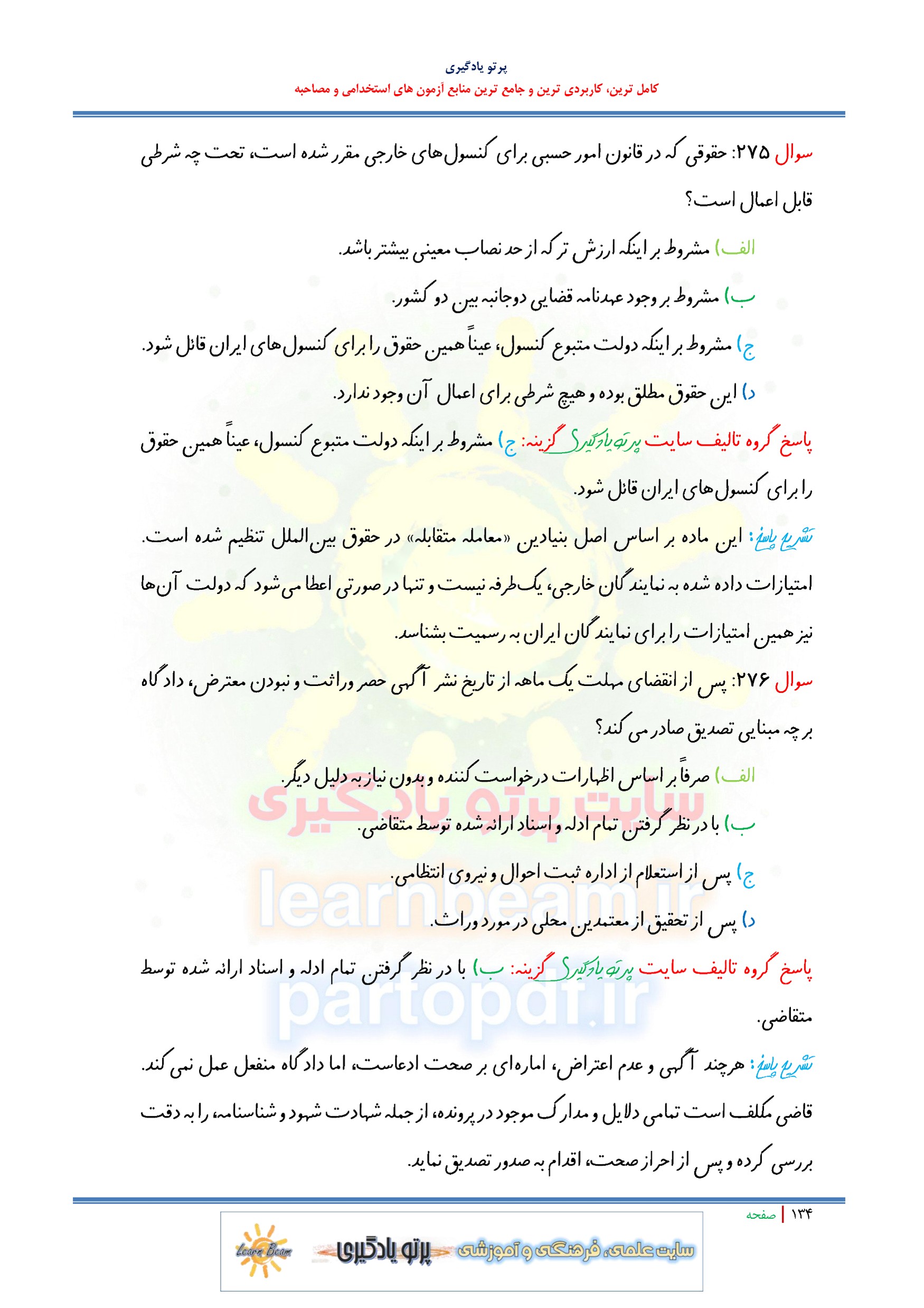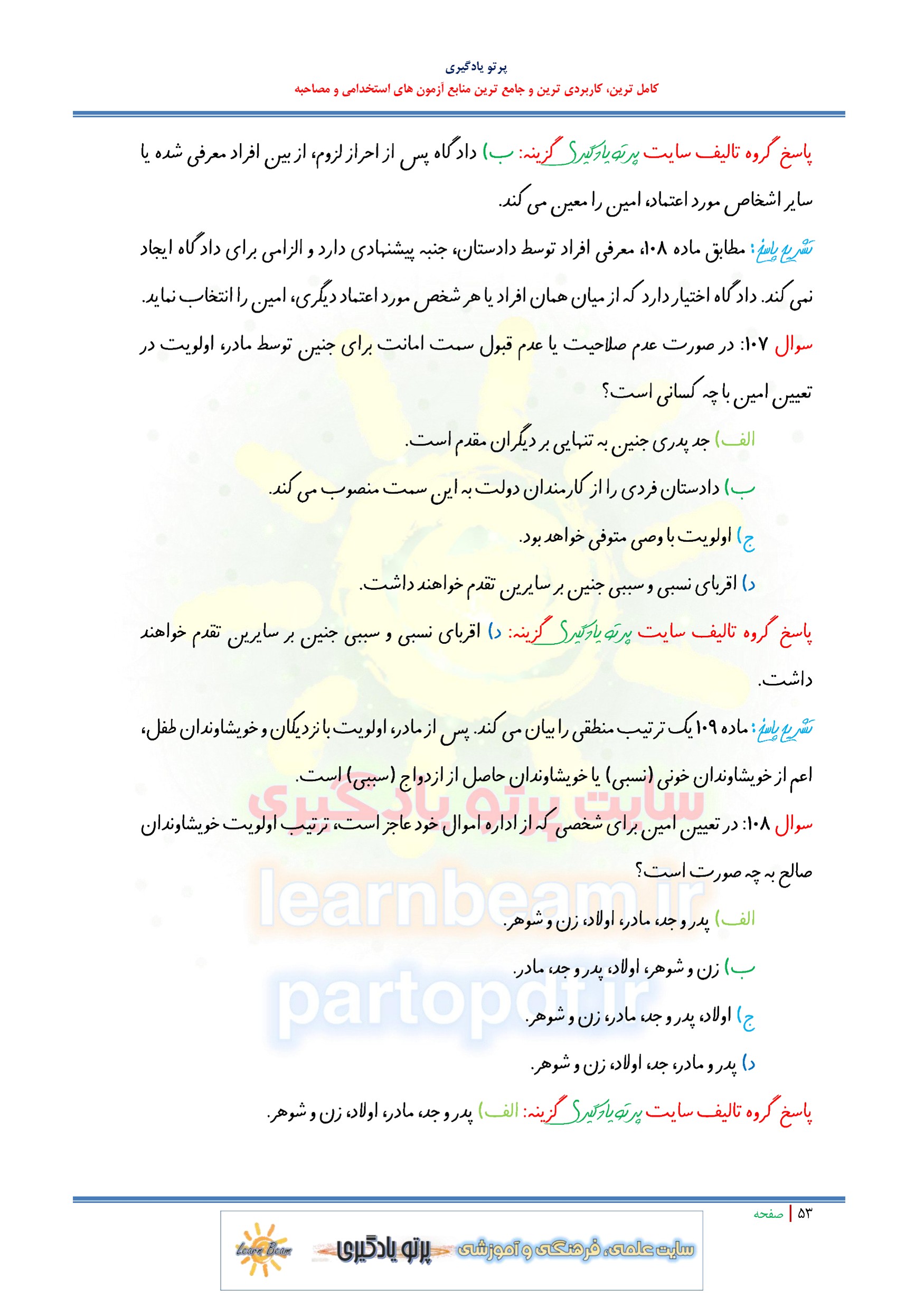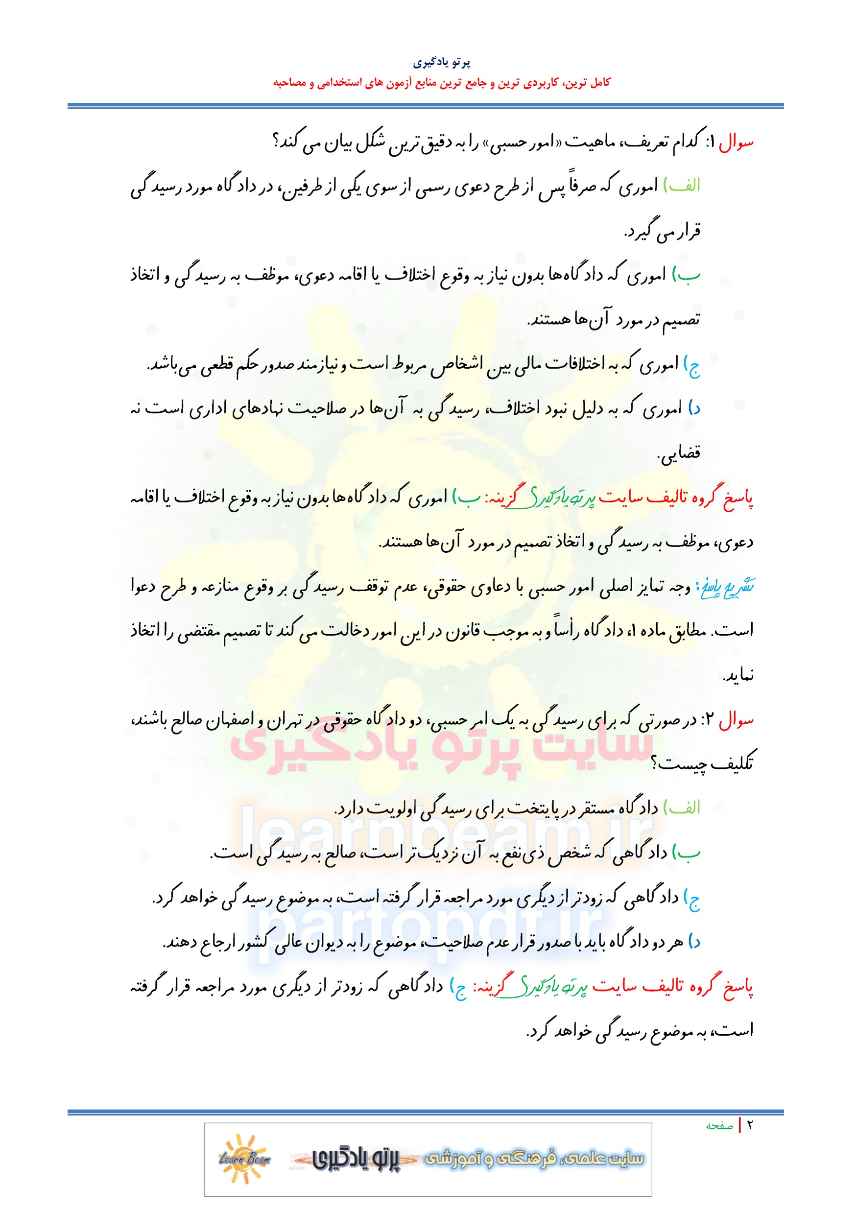 سوالات و تست قانون امور حسبی سوالات تستی قانون امور حسبی شامل 300 سوال تستی در 146 صفحه با پاسخ تشریحی در قالب فایل pdf. مطابق با سرفصل های دفترچه آزمون های استخدامی مجموعه تستی قانون امور حسبی بهترین منبع برای آمادگی آزمون های استخدامی می باشد. مجموعه سوالات و تست قانون امور حسبی مطالب خوانده شده داوطلبین آزمون استخدامی را نظم بخشیده و منسجم می سازد. مجموعه سوالات تستی قانون امور حسبی ویژه آزمون های استخدامی مرور سریع داوطلب را سبب می شود و آگاهی های وی را نظم بخشیده و یک آمادگی و شبیه سازی را برای جلسه آزمون به همراه دارد. مطالعه پک مجموعه سوالات و تست قانون امور حسبی برای داوطلبین آزمون های استخدامی پیشنهاد می شود.