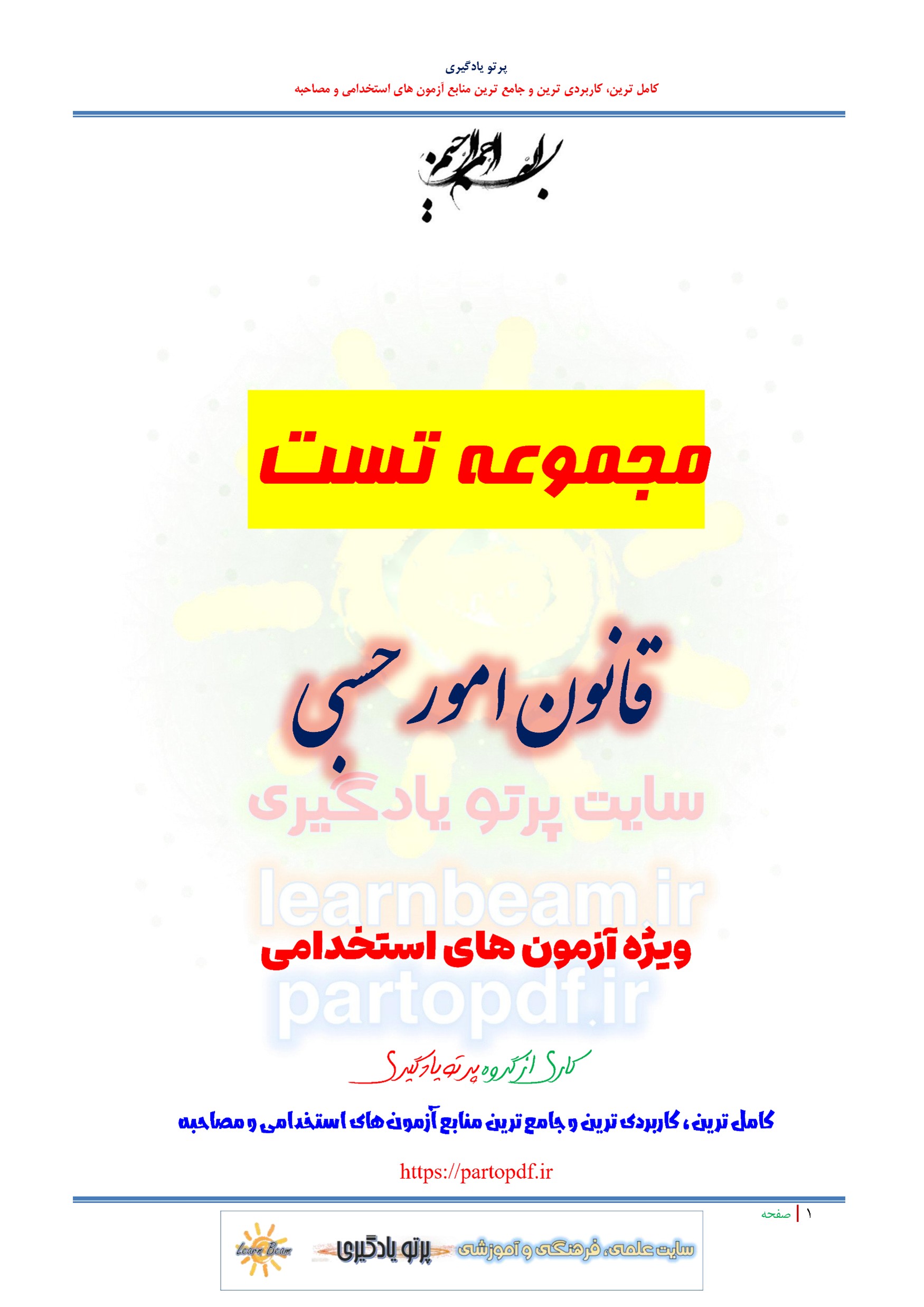 سوالات و تست قانون امور حسبی سوالات قانون امور حسبی شامل 300 سوال تستی در 146 صفحه با پاسخ تشریحی در قالب فایل pdf. بهترین منبع برای آزمون های استخدامی می باشد. مجموعه سوالات تستی قانون امور حسبی مطالب خوانده شده داوطلبین آزمون استخدامی را نظم بخشیده و منسجم می سازد. این مجموعه مرور سریع داوطلب را سبب می شود و آگاهی های وی را نظم بخشیده و یک آمادگی و شبیه سازی را برای جلسه آزمون به همراه دارد. مطالعه این منبع برای همه داوطلبین شرکت کننده در آزمون های استخدامی پیشنهاد می شود.