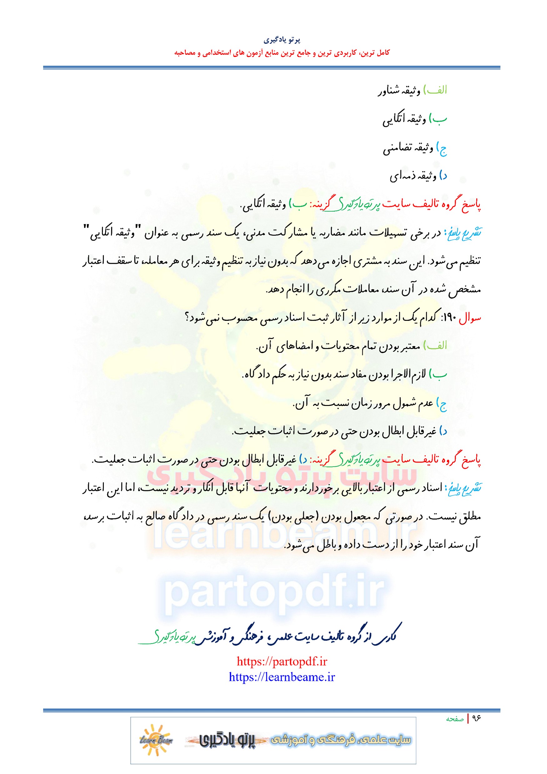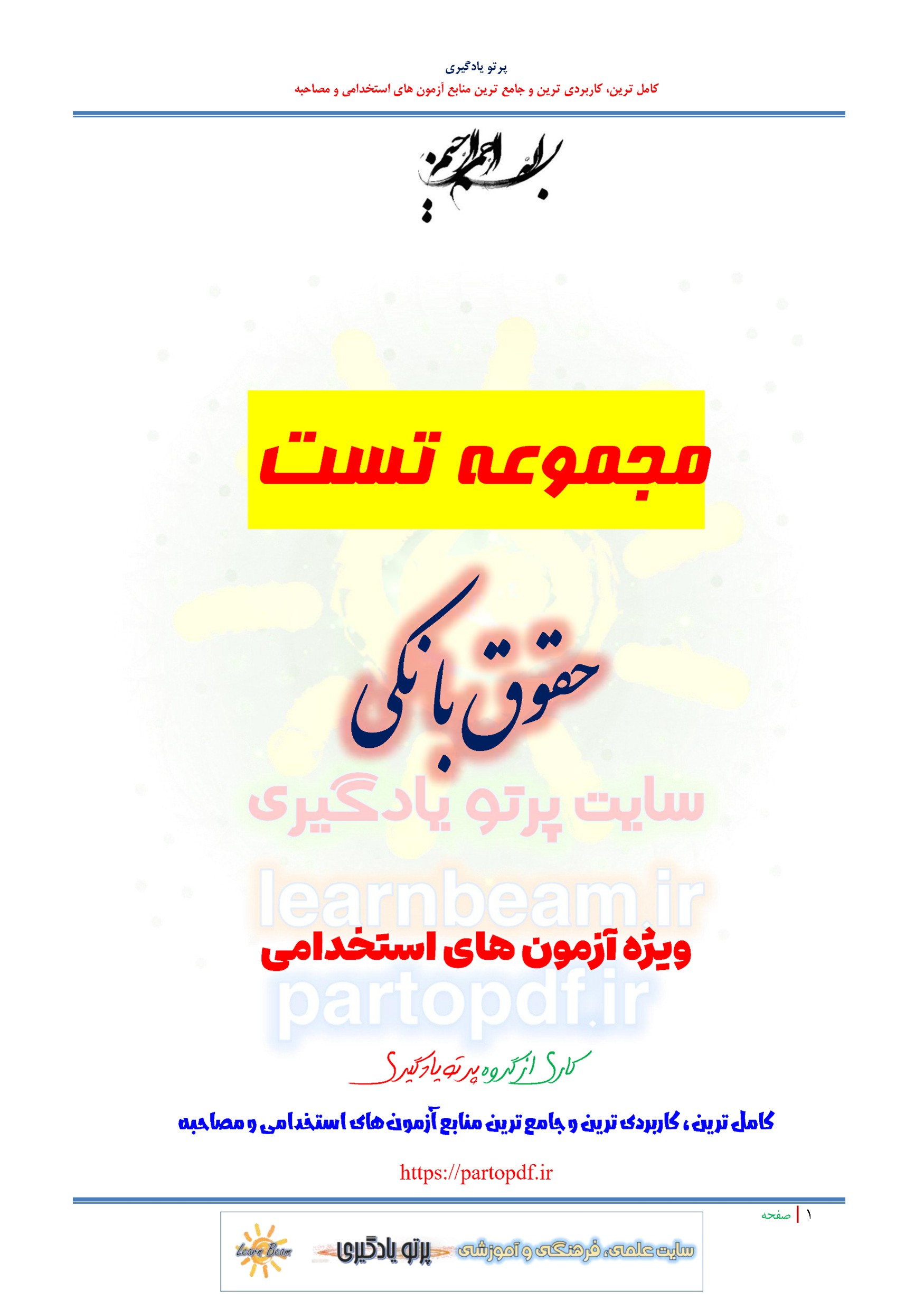 سوالات و تست حقوق بانکی سوالات حقوق بانکی شامل 190 سوال تستی در 96 صفحه با پاسخ تشریحی در قالب فایل pdf. بهترین منبع برای آزمون های استخدامی می باشد. مجموعه سوالات تستی حقوق بانکی مطالب خوانده شده داوطلبین آزمون استخدامی را نظم بخشیده و منسجم می سازد. این مجموعه مرور سریع داوطلب را سبب می شود و آگاهی های وی را نظم بخشیده و یک آمادگی و شبیه سازی را برای جلسه آزمون به همراه دارد. مطالعه این منبع برای همه داوطلبین شرکت کننده در آزمون های استخدامی پیشنهاد می شود.