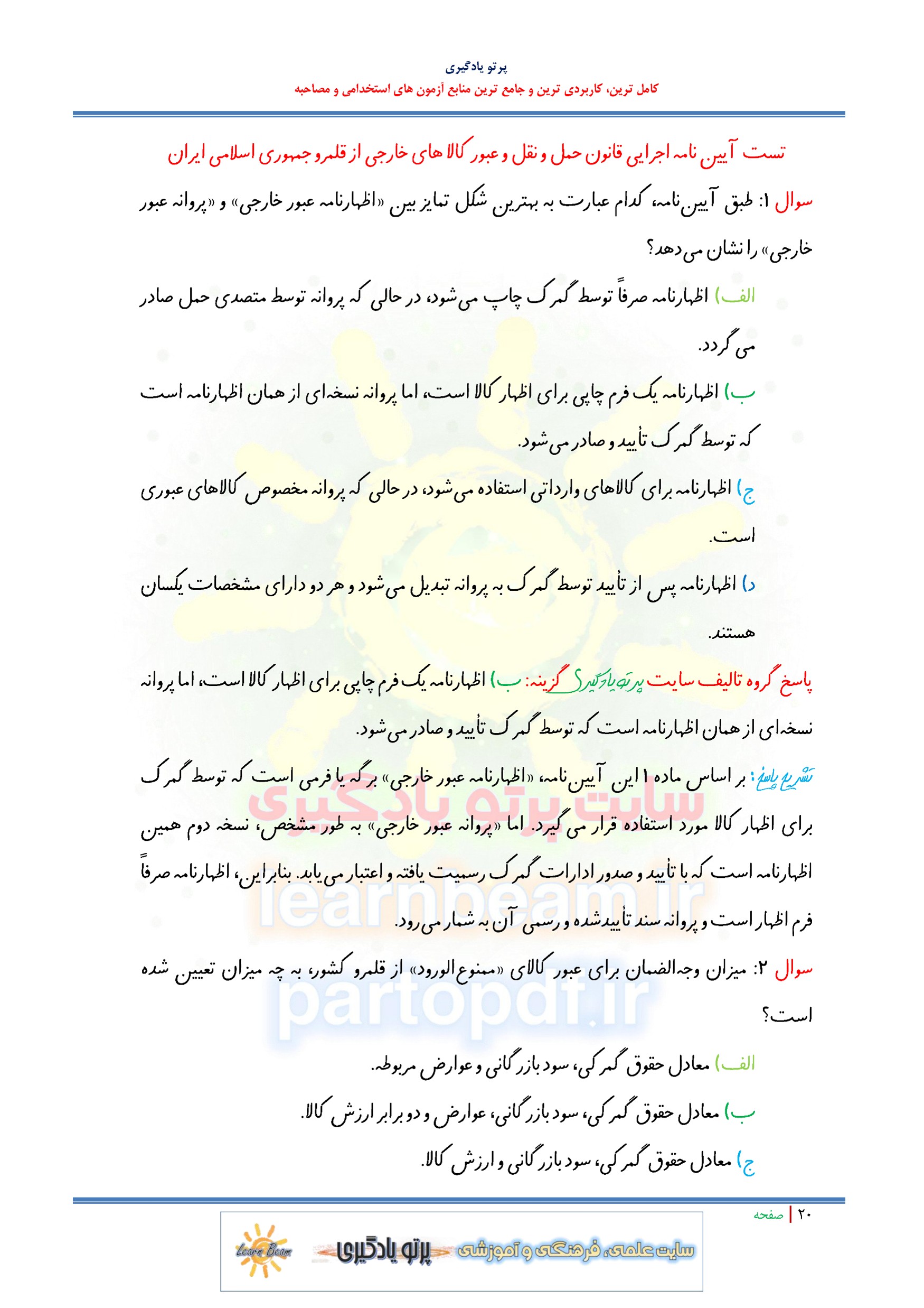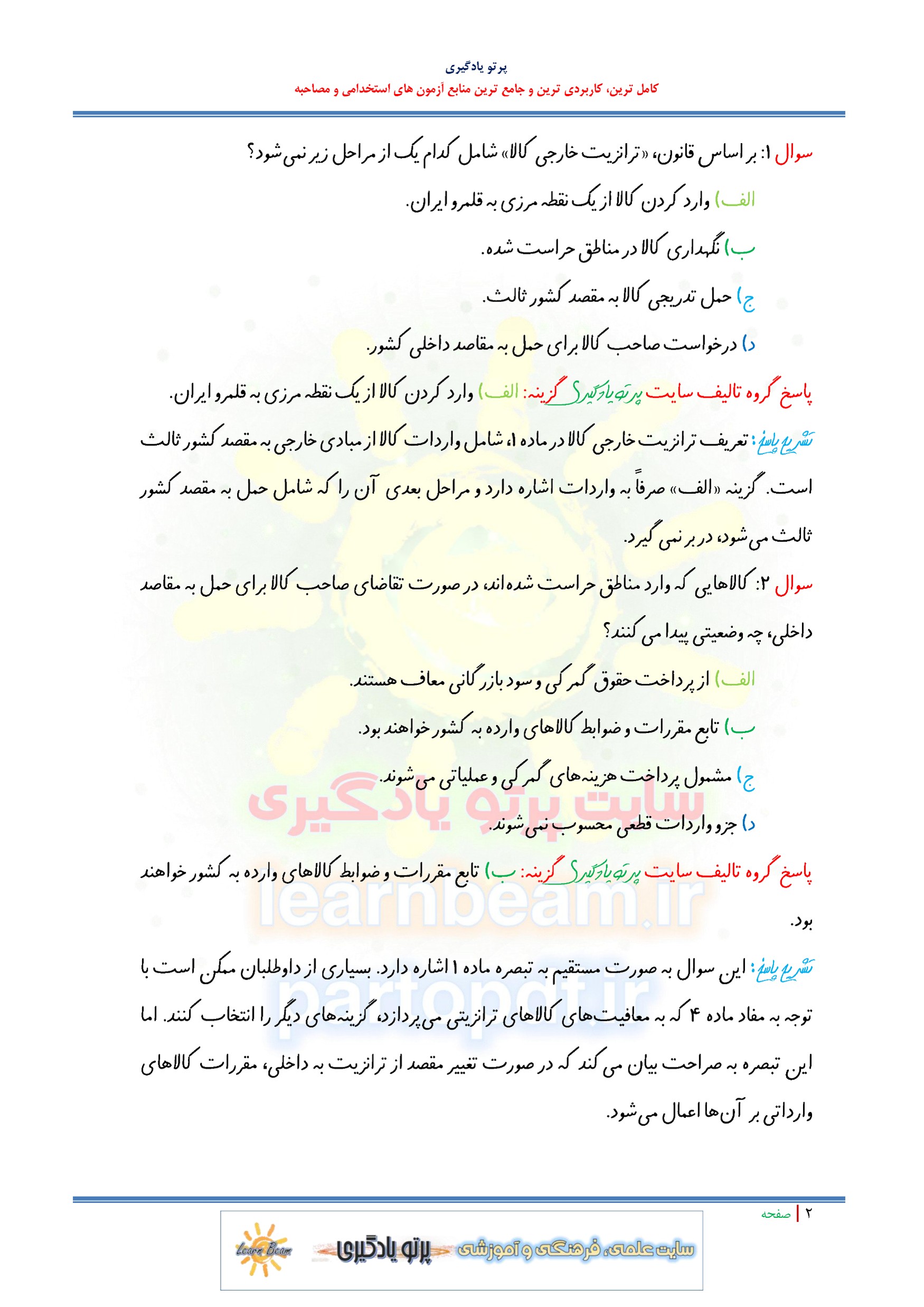 سوالات و تست قانون حمل و نقل و عبور كالاهای خارجی از قلمرو جمهوری اسلامی ايران سوالات تستی قانون حمل و نقل و عبور كالاهای خارجی از قلمرو جمهوری اسلامی ايران شامل 40 سوال تستی قانون حمل و نقل و عبور كالاهای خارجی و 90 سوال تستی آیین نامه حمل و نقل و عبور كالاهای خارجی در مجموع 130 سوال تستی در 60 صفحه با پاسخ تشریحی در قالب فایل pdf. بهترین منبع برای آزمون های استخدامی می باشد. مجموعه سوالات تستی تست قانون حمل و نقل و عبور كالاهای خارجی از قلمرو جمهوری اسلامی ايران مطالب خوانده شده داوطلبین آزمون استخدامی را نظم بخشیده و منسجم می سازد. این مجموعه مرور سریع داوطلب را سبب می شود و آگاهی های وی را نظم بخشیده و یک آمادگی و شبیه سازی را برای جلسه آزمون به همراه دارد. مطالعه این منبع برای همه داوطلبین شرکت کننده در آزمون های استخدامی پیشنهاد می شود.