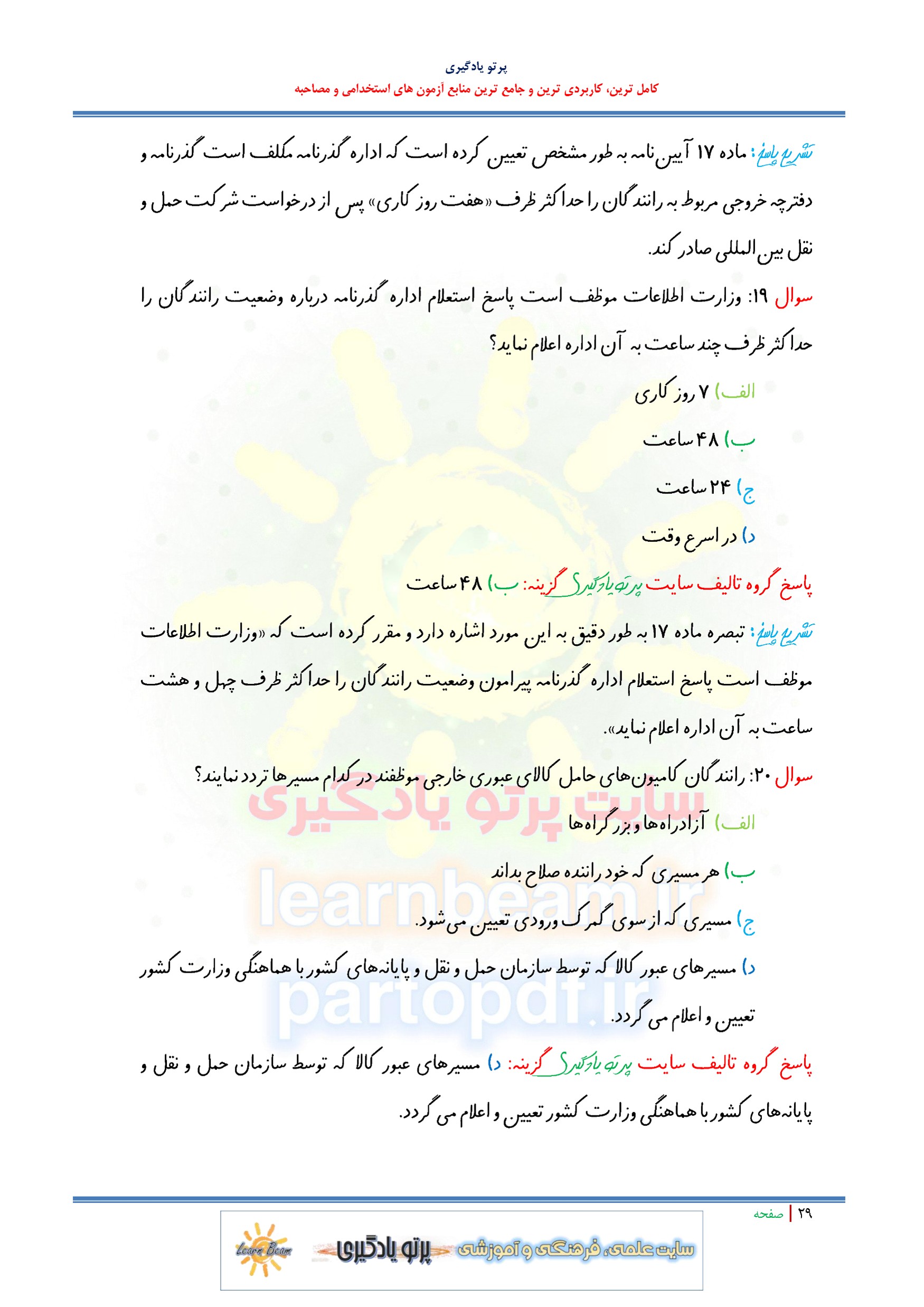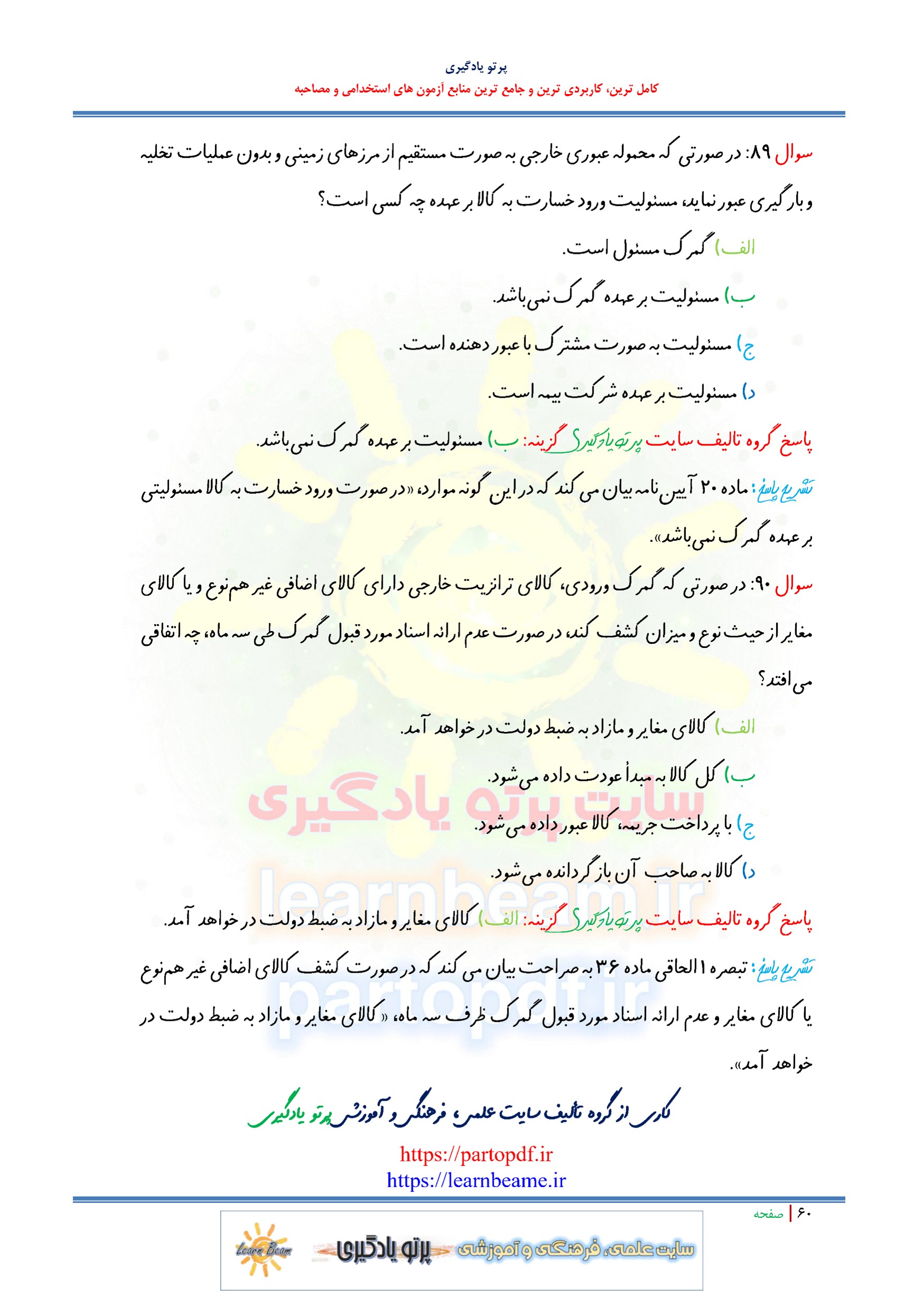 سوالات و تست قانون حمل و نقل و عبور كالاهای خارجی از قلمرو جمهوری اسلامی ايران سوالات تستی قانون حمل و نقل و عبور كالاهای خارجی از قلمرو جمهوری اسلامی ايران شامل 40 سوال تستی قانون حمل و نقل و 90 سوال تستی آیین نامه آن جمعا 130 سوال در 60 صفحه با پاسخ تشریحی در قالب فایل pdf. مطابق با سرفصل های دفترچه آزمون های استخدامی مجموعه تستی قانون حمل و نقل و عبور كالاهای خارجی از قلمرو جمهوری اسلامی ايران بهترین منبع برای آمادگی آزمون های استخدامی می باشد. مجموعه سوالات و تست قانون حمل و نقل و عبور كالاهای خارجی از قلمرو جمهوری اسلامی ايران مطالب خوانده شده داوطلبین آزمون استخدامی را نظم بخشیده و منسجم می سازد. مجموعه سوالات تستی قانون حمل و نقل و عبور كالاهای خارجی از قلمرو جمهوری اسلامی ايران ویژه آزمون های استخدامی مرور سریع داوطلب را سبب می شود و آگاهی های وی را نظم بخشیده و یک آمادگی و شبیه سازی را برای جلسه آزمون به همراه دارد. مطالعه پک مجموعه سوالات و تست قانون حمل و نقل و عبور كالاهای خارجی از قلمرو جمهوری اسلامی ايران برای داوطلبین آزمون های استخدامی پیشنهاد می شود.