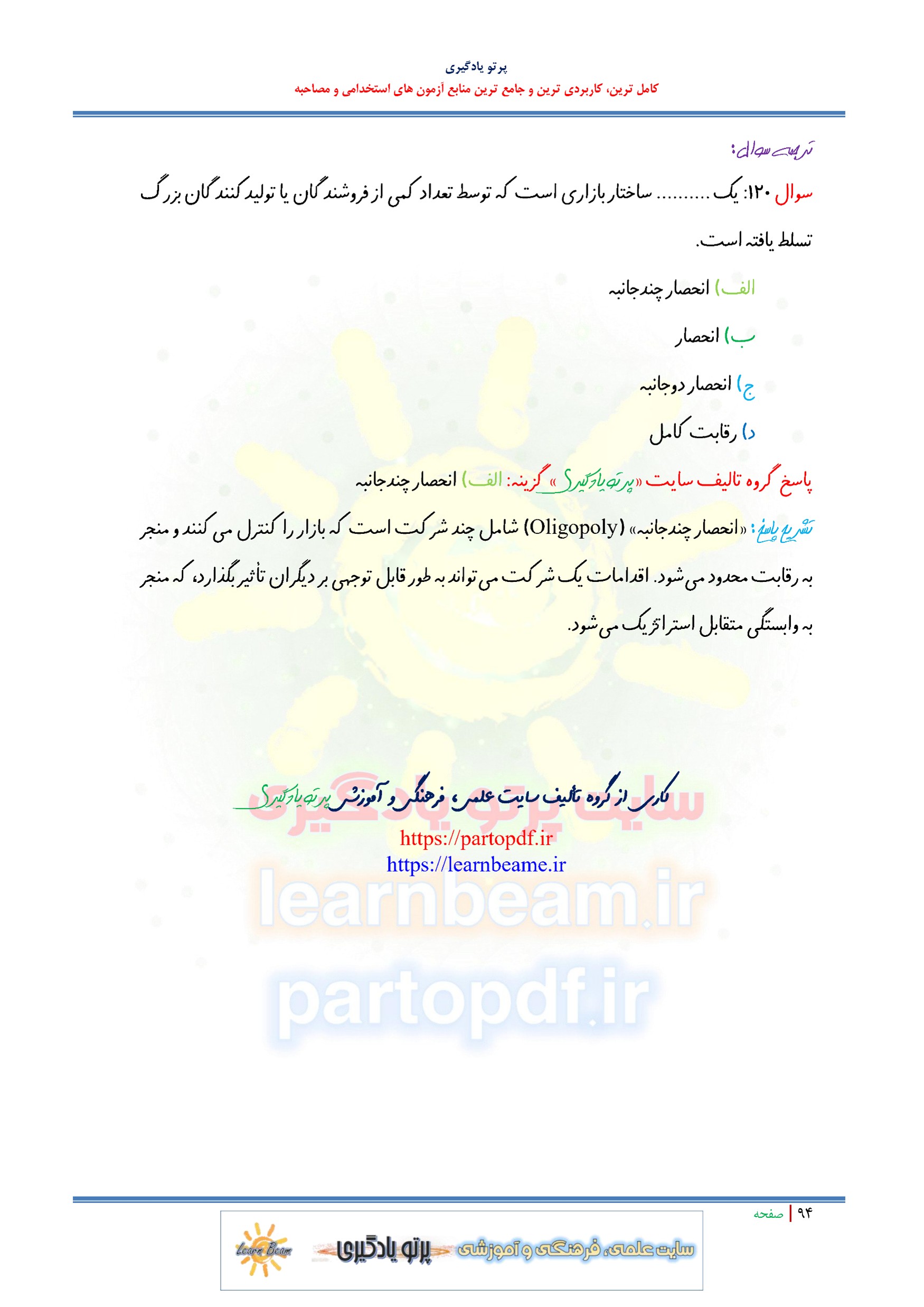 سوالات و تست کتاب زبان تخصصی اقتصاد سوالات کتاب زبان تخصصی اقتصاد شامل 120 سوال تستی در 94 صفحه با پاسخ تشریحی و ترجمه سوال به سوال به زبان فارسی در قالب فایل pdf. بهترین منبع برای آزمون های استخدامی می باشد. مجموعه سوالات تستی کتاب زبان تخصصی اقتصاد مطالب خوانده شده داوطلبین آزمون استخدامی را نظم بخشیده و منسجم می سازد. این مجموعه مرور سریع داوطلب را سبب می شود و آگاهی های وی را نظم بخشیده و یک آمادگی و شبیه سازی را برای جلسه آزمون به همراه دارد. مطالعه این منبع برای همه داوطلبین شرکت کننده در آزمون های استخدامی پیشنهاد می شود.