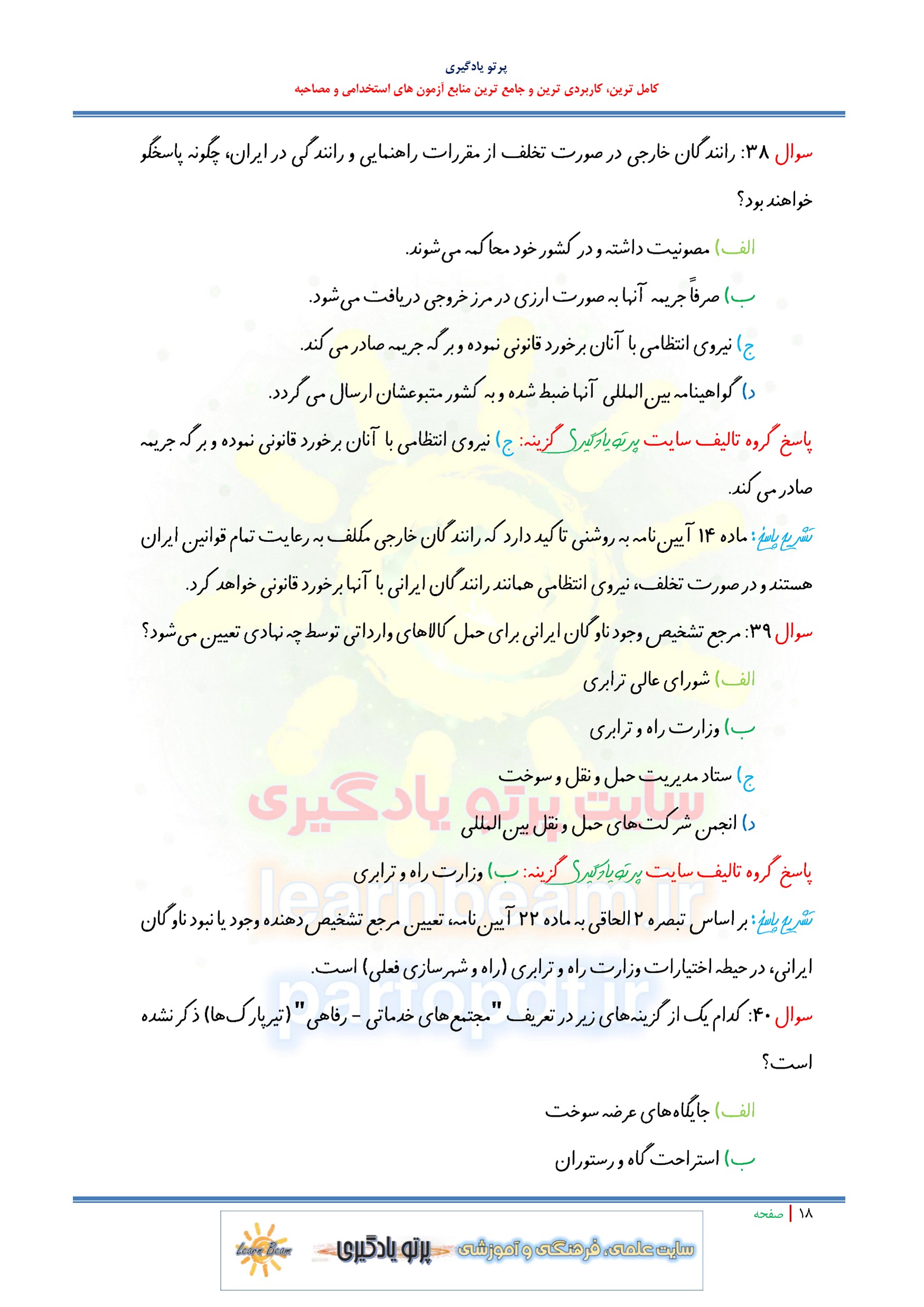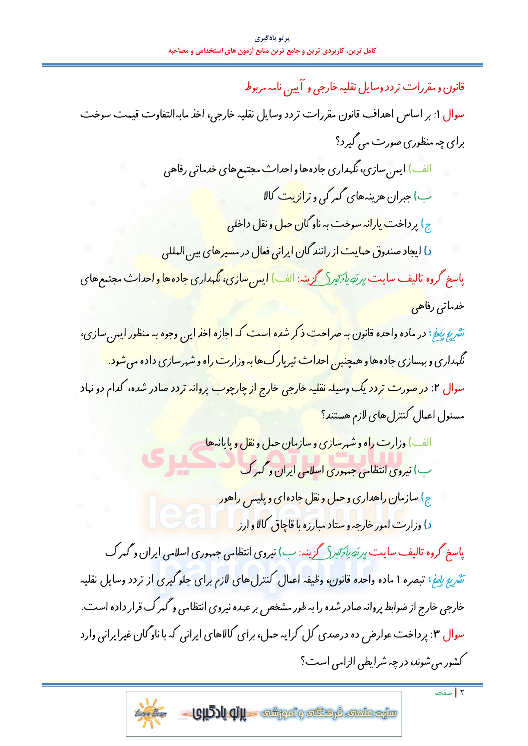 سوالات تستی قانون و مقررات تردد وسایل نقلیه خارجی و آیین نامه مربوطه