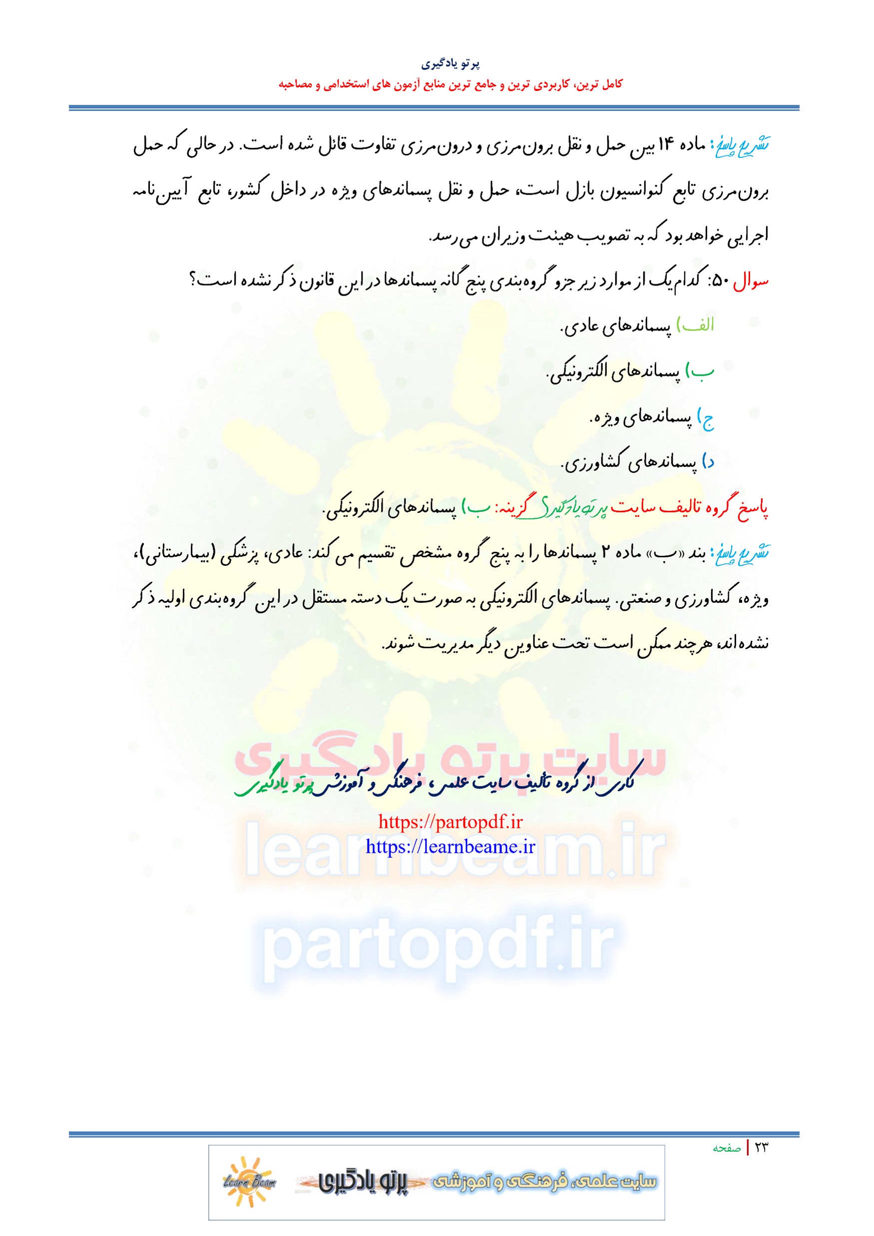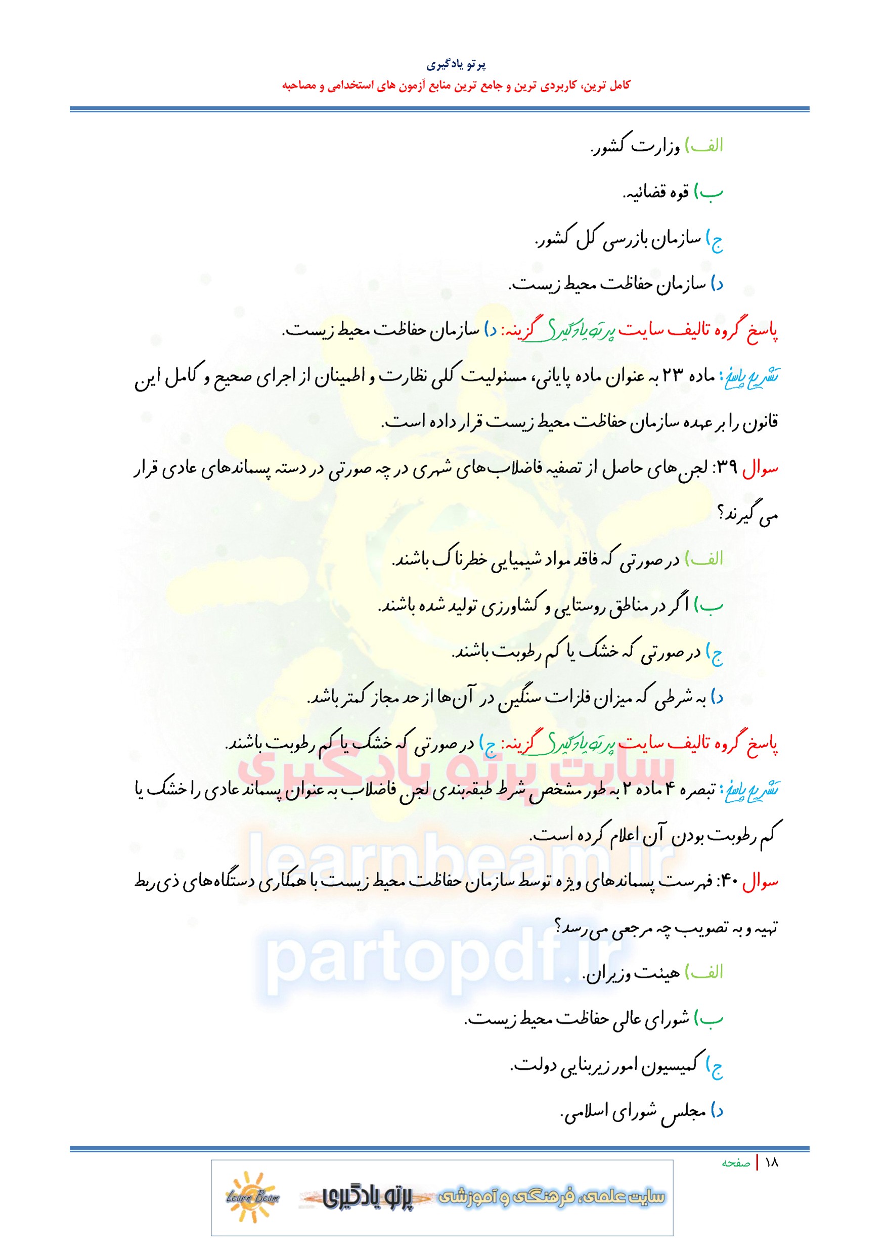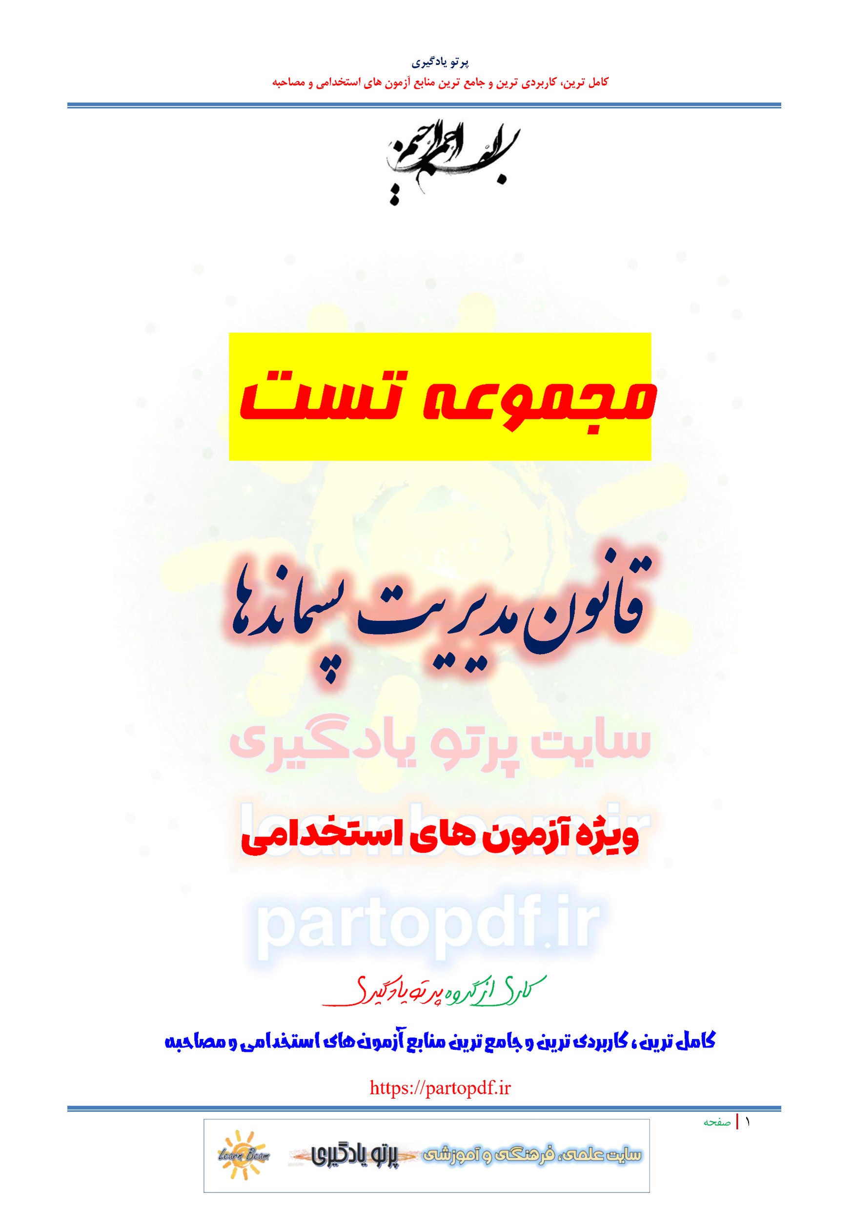 سوالات و تست قانون مدیریت پسماند ها سوالات قانون مدیریت پسماند ها شامل 50 سوال تستی در 23 صفحه با پاسخ تشریحی در قالب فایل pdf. بهترین منبع برای آزمون های استخدامی می باشد. مجموعه سوالات تستی قانون مدیریت پسماند ها مطالب خوانده شده داوطلبین آزمون استخدامی را نظم بخشیده و منسجم می سازد. این مجموعه مرور سریع داوطلب را سبب می شود و آگاهی های وی را نظم بخشیده و یک آمادگی و شبیه سازی را برای جلسه آزمون به همراه دارد. مطالعه این منبع برای همه داوطلبین شرکت کننده در آزمون های استخدامی پیشنهاد می شود.