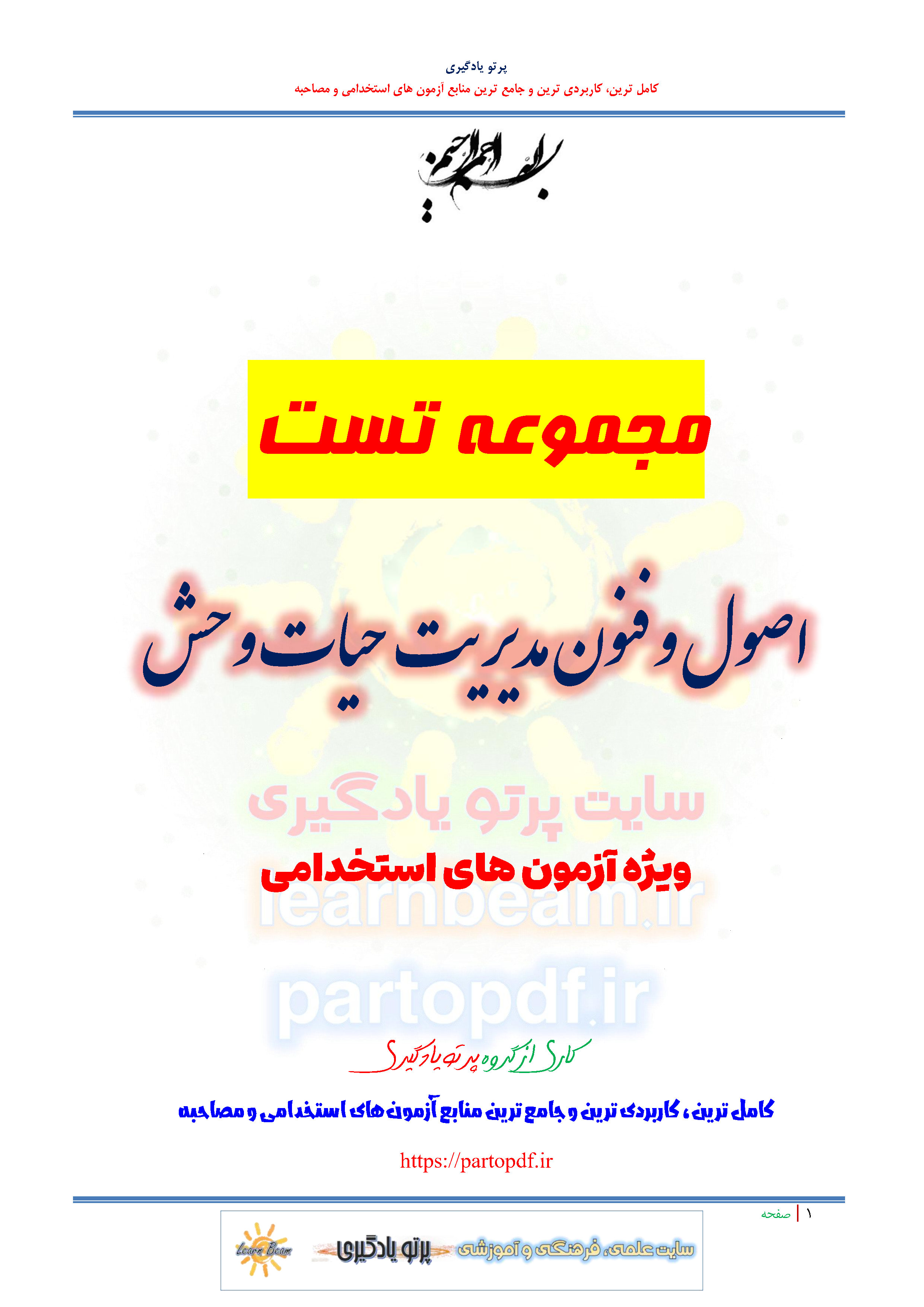 سوالات و تست اصول و فنون مدیریت حیات وحش سوالات اصول و فنون مدیریت حیات وحش شامل 173 سوال تستی در 81 صفحه با پاسخ تشریحی در قالب فایل pdf. بهترین منبع برای آزمون های استخدامی می باشد. مجموعه سوالات تستی اصول و فنون مدیریت حیات وحش مطالب خوانده شده داوطلبین آزمون استخدامی را نظم بخشیده و منسجم می سازد. این مجموعه مرور سریع داوطلب را سبب می شود و آگاهی های وی را نظم بخشیده و یک آمادگی و شبیه سازی را برای جلسه آزمون به همراه دارد. مطالعه این منبع برای همه داوطلبین شرکت کننده در آزمون های استخدامی پیشنهاد می شود.
