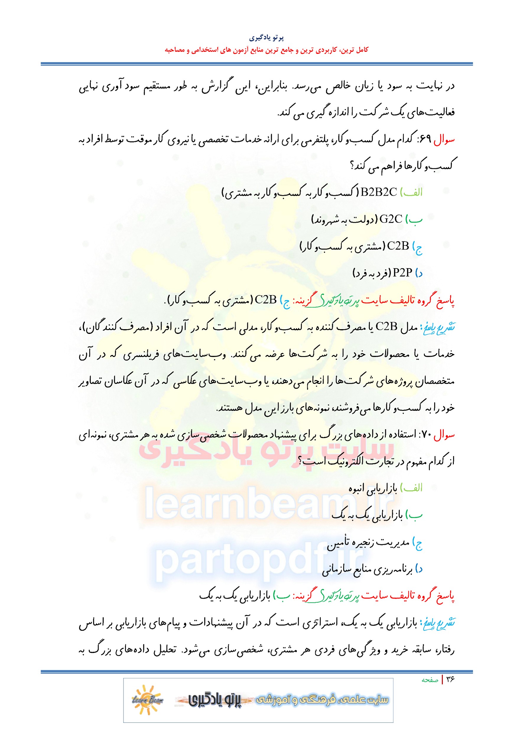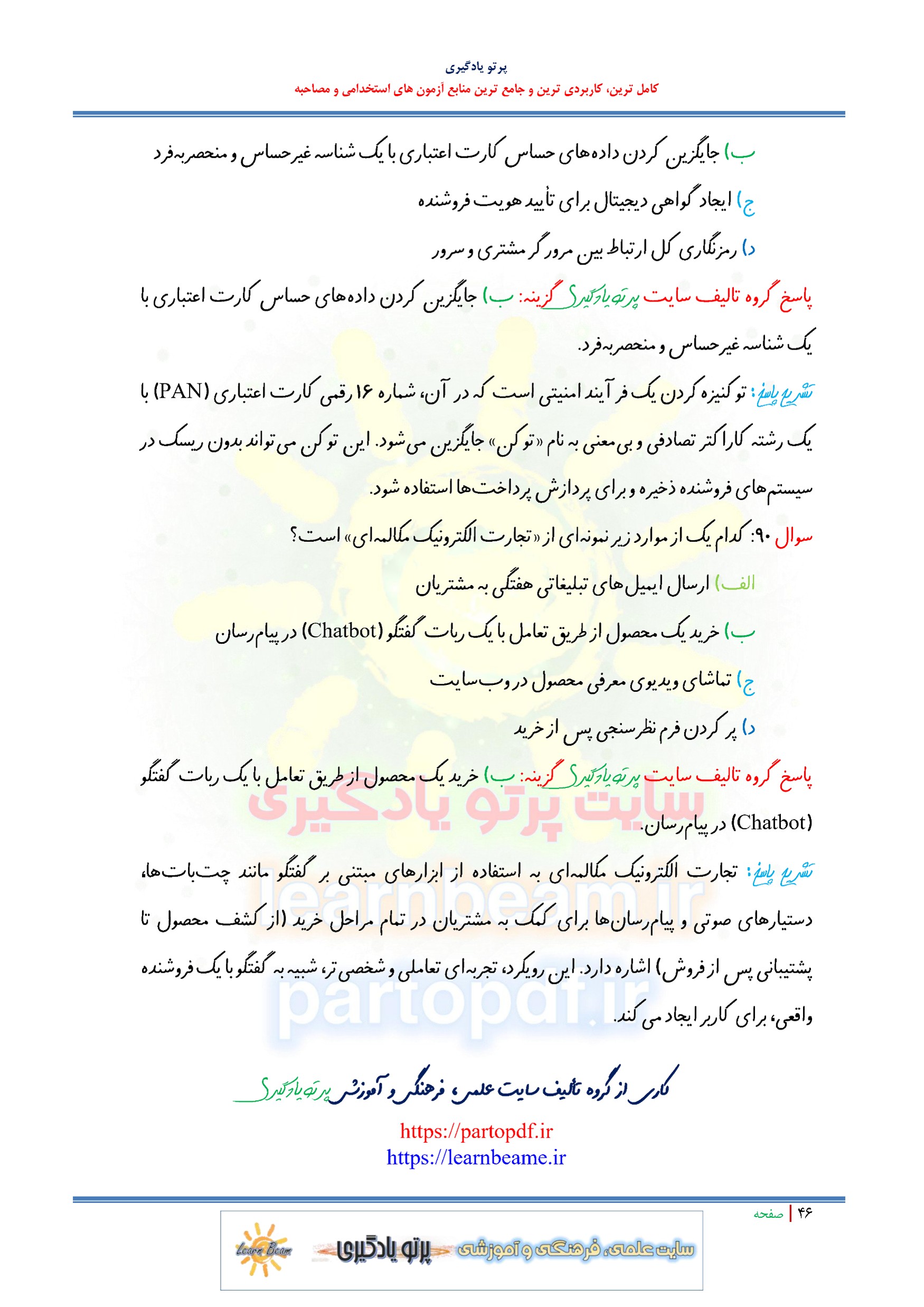 سوالات و تست تجارت الکترونیک سوالات تجارت الکترونیک شامل 90 سوال تستی در 46 صفحه با پاسخ تشریحی در قالب فایل pdf. بهترین منبع برای آزمون های استخدامی می باشد. مجموعه سوالات تستی تجارت الکترونیک مطالب خوانده شده داوطلبین آزمون استخدامی را نظم بخشیده و منسجم می سازد. این مجموعه مرور سریع داوطلب را سبب می شود و آگاهی های وی را نظم بخشیده و یک آمادگی و شبیه سازی را برای جلسه آزمون به همراه دارد. مطالعه این منبع برای همه داوطلبین شرکت کننده در آزمون های استخدامی پیشنهاد می شود.