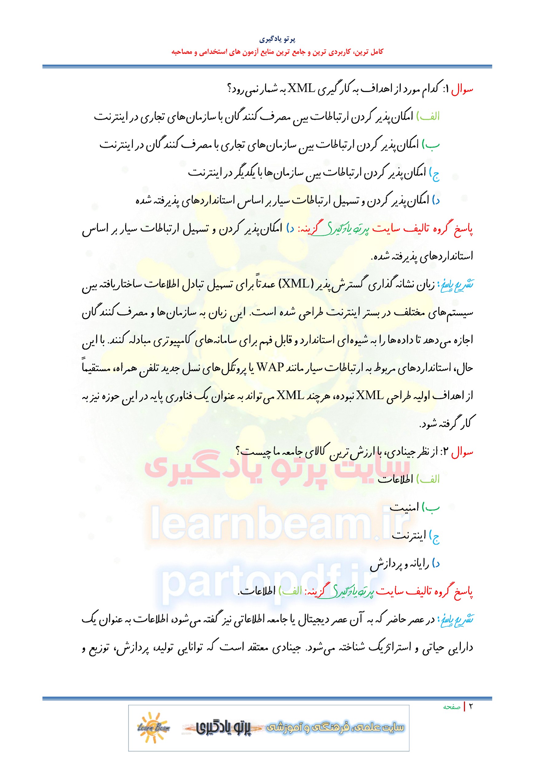 سوالات و تست تجارت الکترونیک سوالات تستی تجارت الکترونیک شامل 90 سوال تستی در 46 صفحه با پاسخ تشریحی در قالب فایل pdf. مطابق با سرفصل های دفترچه آزمون های استخدامی مجموعه تستی تجارت الکترونیک بهترین منبع برای آمادگی آزمون های استخدامی می باشد. مجموعه سوالات و تست تجارت الکترونیک مطالب خوانده شده داوطلبین آزمون استخدامی را نظم بخشیده و منسجم می سازد. مجموعه سوالات تستی تجارت الکترونیک ویژه آزمون های استخدامی مرور سریع داوطلب را سبب می شود و آگاهی های وی را نظم بخشیده و یک آمادگی و شبیه سازی را برای جلسه آزمون به همراه دارد. مطالعه پک مجموعه سوالات و تست تجارت الکترونیک برای داوطلبین آزمون های استخدامی پیشنهاد می شود.