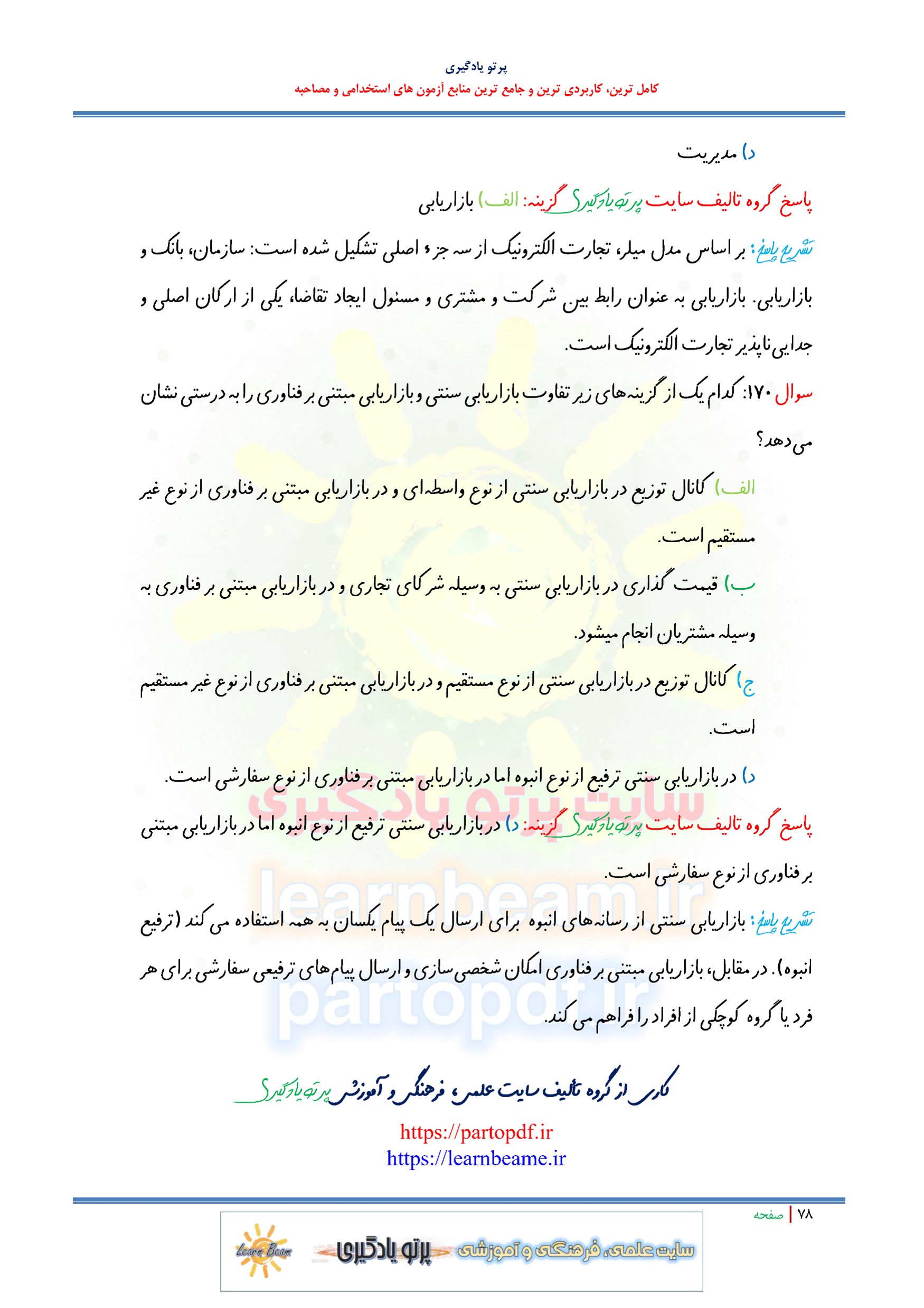 سوالات و تست کسب و کار الکترونیک سوالات تستی کسب و کار الکترونیک شامل 170 سوال تستی در 78 صفحه با پاسخ تشریحی در قالب فایل pdf. مطابق با سرفصل های دفترچه آزمون های استخدامی مجموعه تستی کسب و کار الکترونیک بهترین منبع برای آمادگی آزمون های استخدامی می باشد. مجموعه سوالات و تست کسب و کار الکترونیک مطالب خوانده شده داوطلبین آزمون استخدامی را نظم بخشیده و منسجم می سازد. مجموعه سوالات تستی کسب و کار الکترونیک ویژه آزمون های استخدامی مرور سریع داوطلب را سبب می شود و آگاهی های وی را نظم بخشیده و یک آمادگی و شبیه سازی را برای جلسه آزمون به همراه دارد. مطالعه پک مجموعه سوالات و تست کسب و کار الکترونیک برای داوطلبین آزمون های استخدامی پیشنهاد می شود.