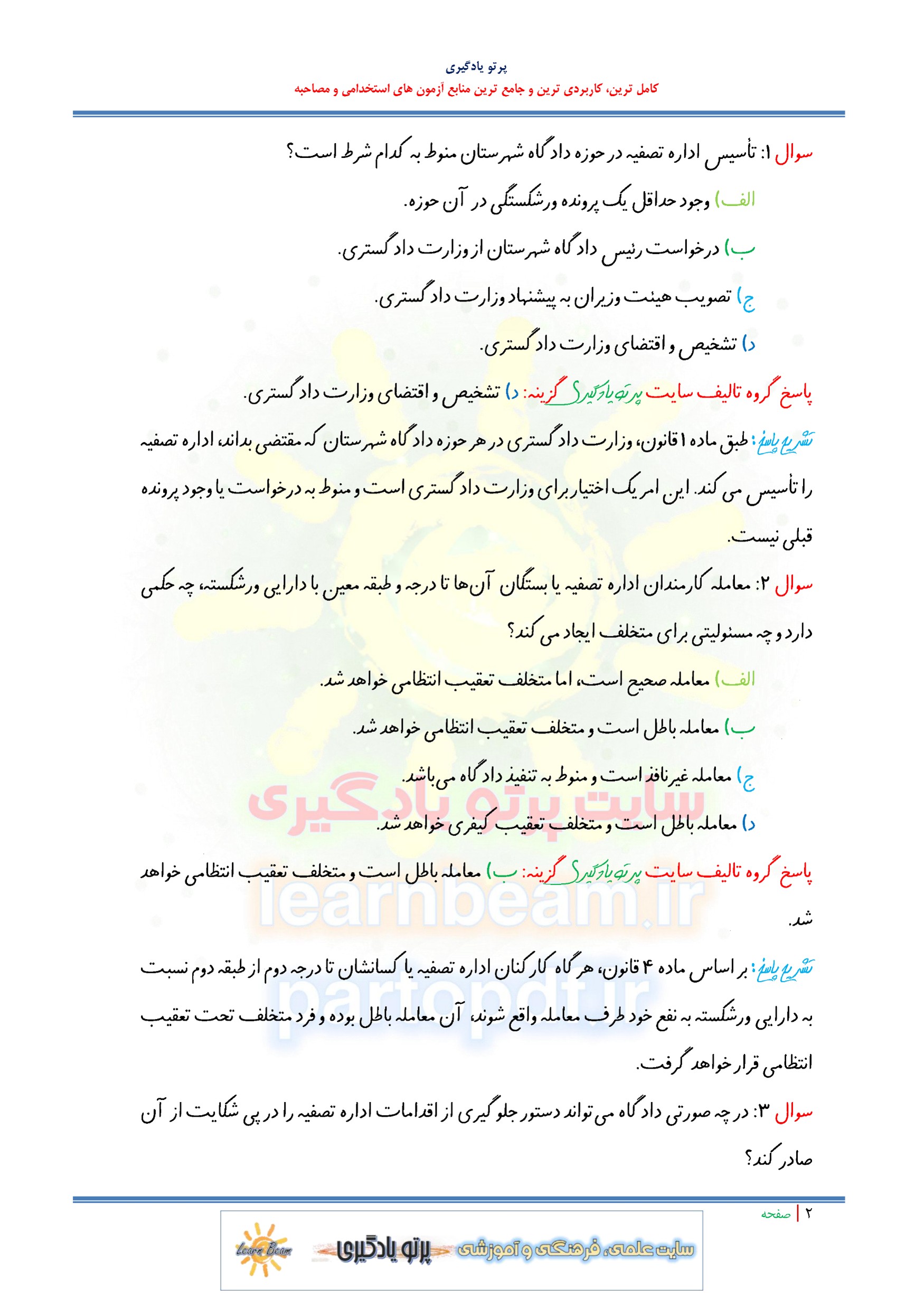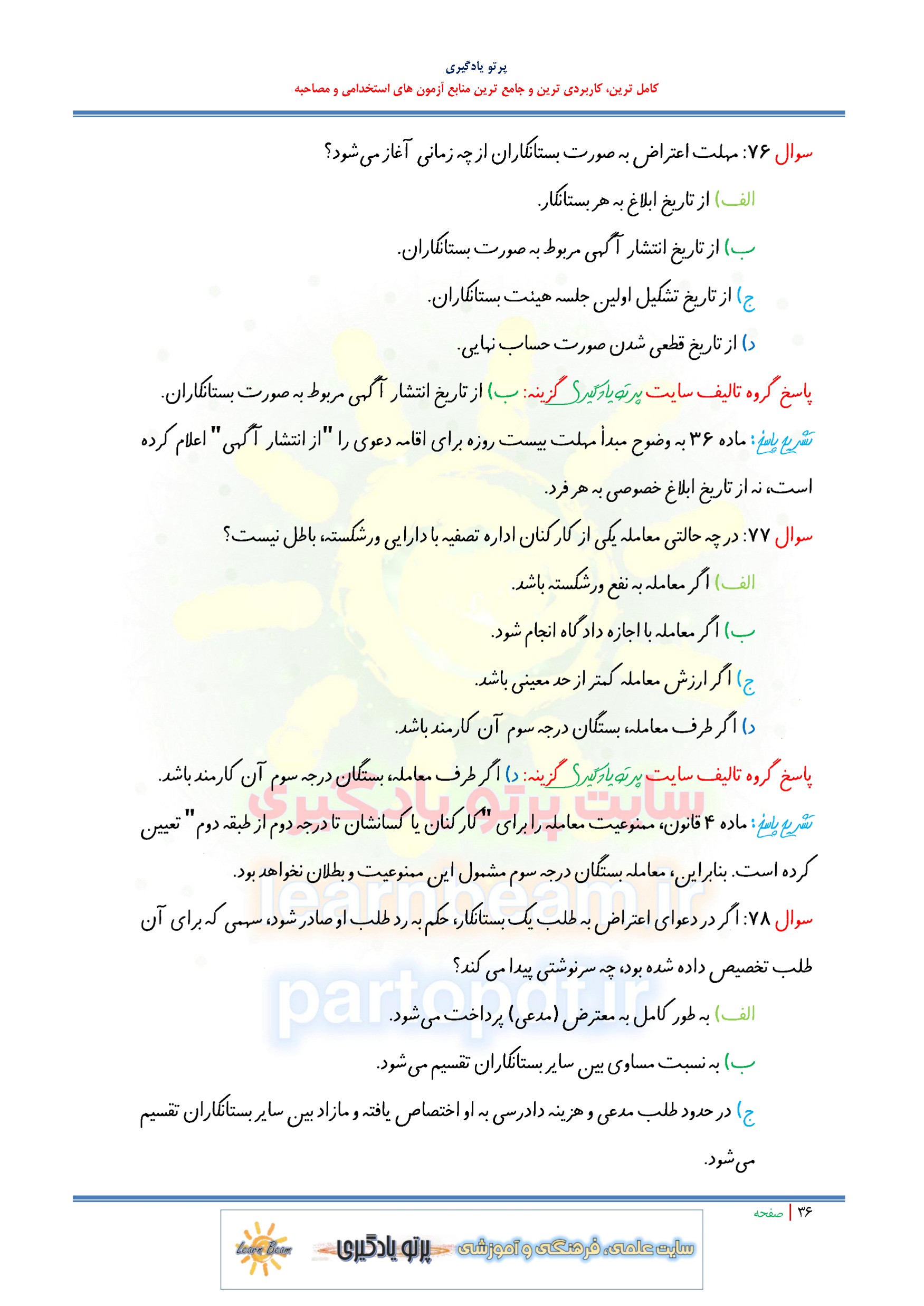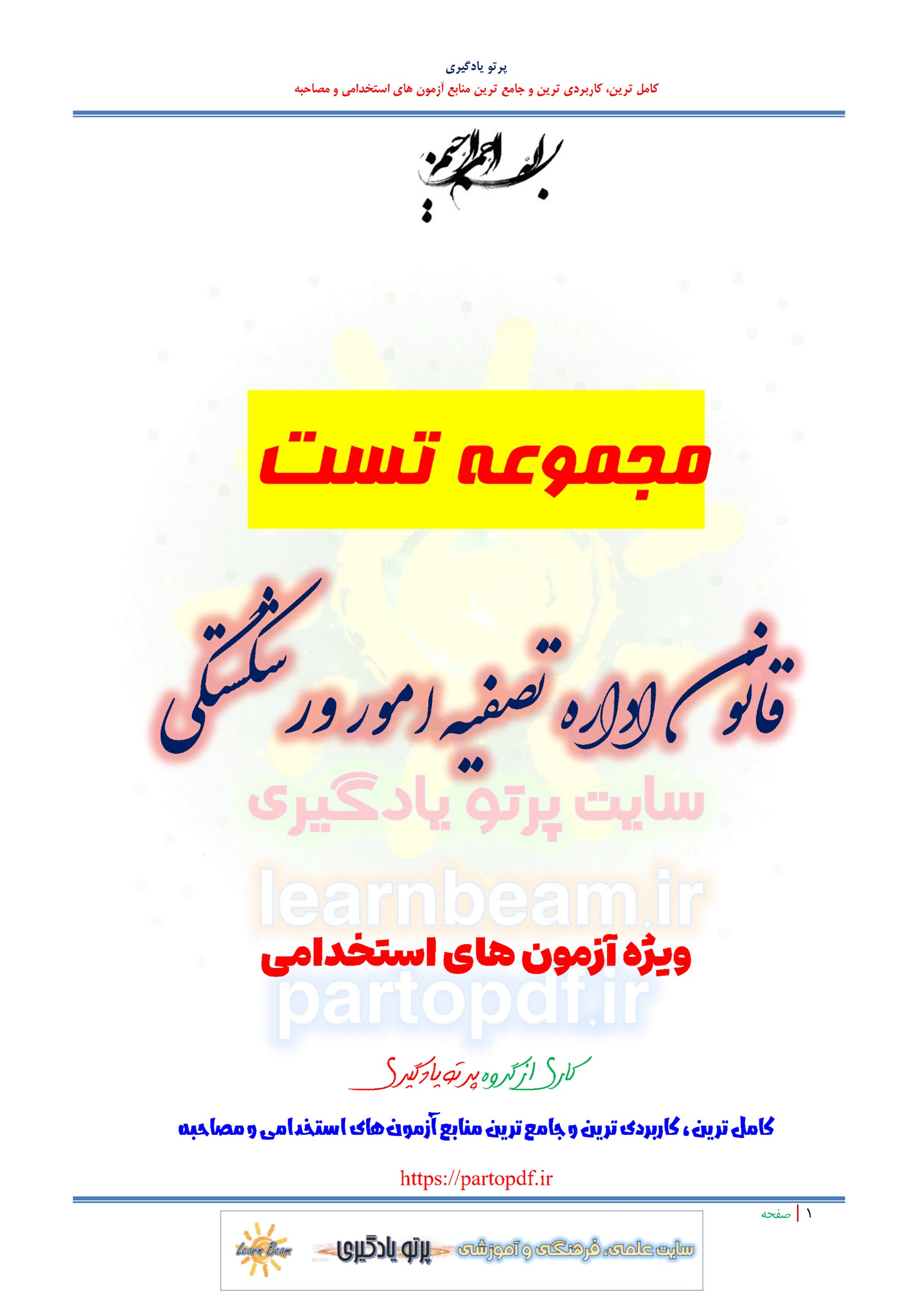 سوالات و تست قانون اداره تصفیه امور ورشکستگی سوالات قانون اداره تصفیه امور ورشکستگی شامل 100 سوال تستی در 48 صفحه با پاسخ تشریحی در قالب فایل pdf. بهترین منبع برای آزمون های استخدامی می باشد. مجموعه سوالات تستی قانون اداره تصفیه امور ورشکستگی مطالب خوانده شده داوطلبین آزمون استخدامی را نظم بخشیده و منسجم می سازد. این مجموعه مرور سریع داوطلب را سبب می شود و آگاهی های وی را نظم بخشیده و یک آمادگی و شبیه سازی را برای جلسه آزمون به همراه دارد. مطالعه این منبع برای همه داوطلبین شرکت کننده در آزمون های استخدامی پیشنهاد می شود.