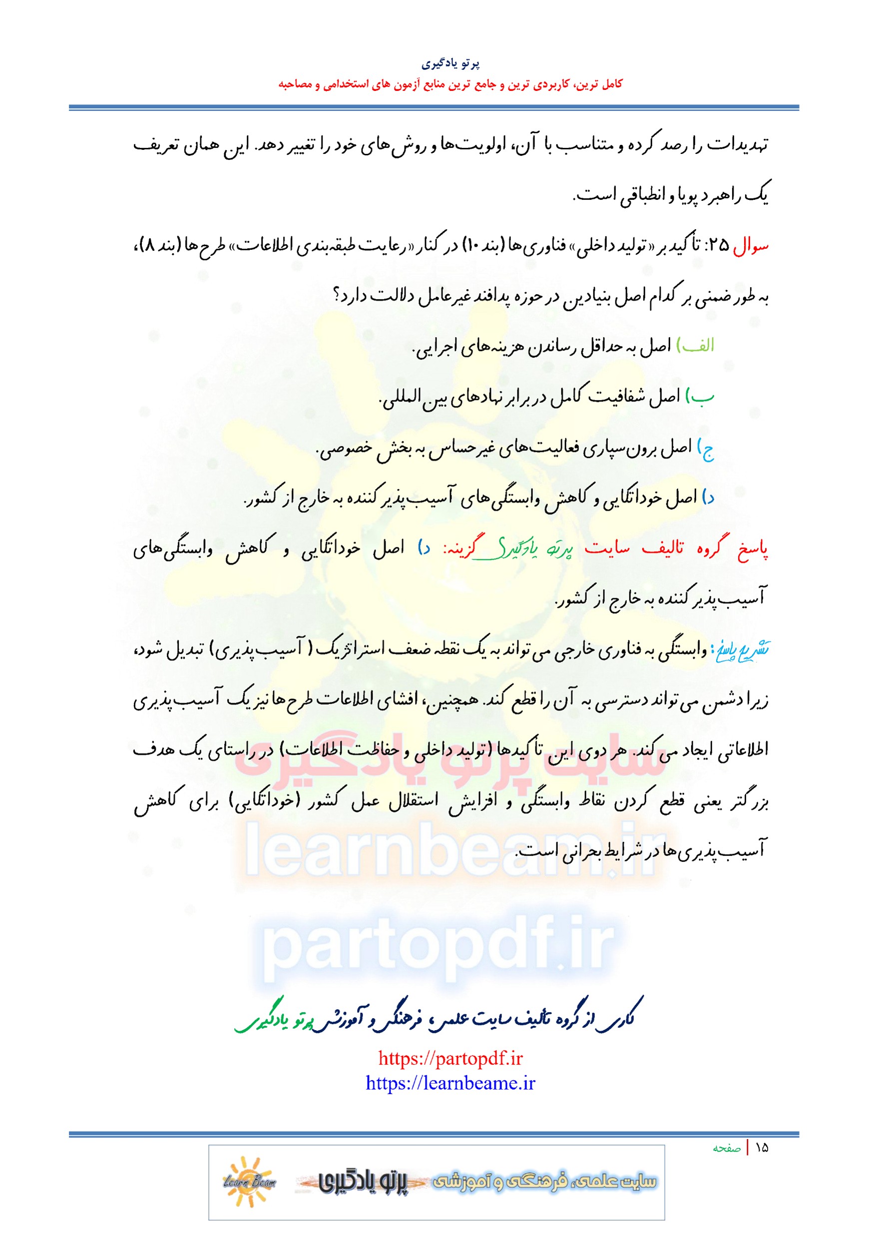 سوالات و تست سیاست های کلی امور پدافند غیرعامل سوالات سیاست های کلی امور پدافند غیرعامل شامل 25 سوال تستی در 15 صفحه با پاسخ تشریحی در قالب فایل pdf. بهترین منبع برای آزمون های استخدامی می باشد. مجموعه سوالات تستی سیاست های کلی امور پدافند غیرعامل مطالب خوانده شده داوطلبین آزمون استخدامی را نظم بخشیده و منسجم می سازد. این مجموعه مرور سریع داوطلب را سبب می شود و آگاهی های وی را نظم بخشیده و یک آمادگی و شبیه سازی را برای جلسه آزمون به همراه دارد. مطالعه این منبع برای همه داوطلبین شرکت کننده در آزمون های استخدامی پیشنهاد می شود.