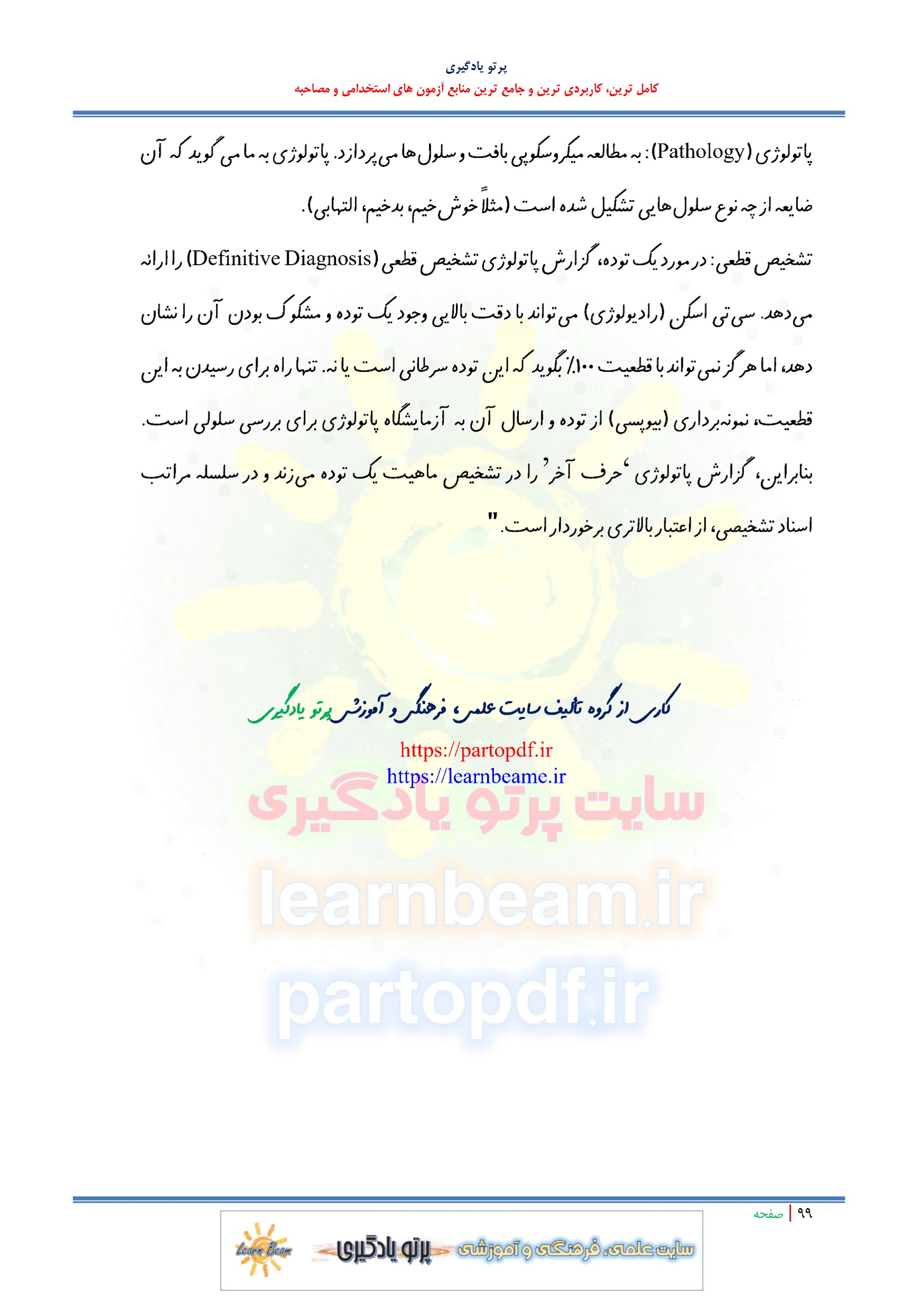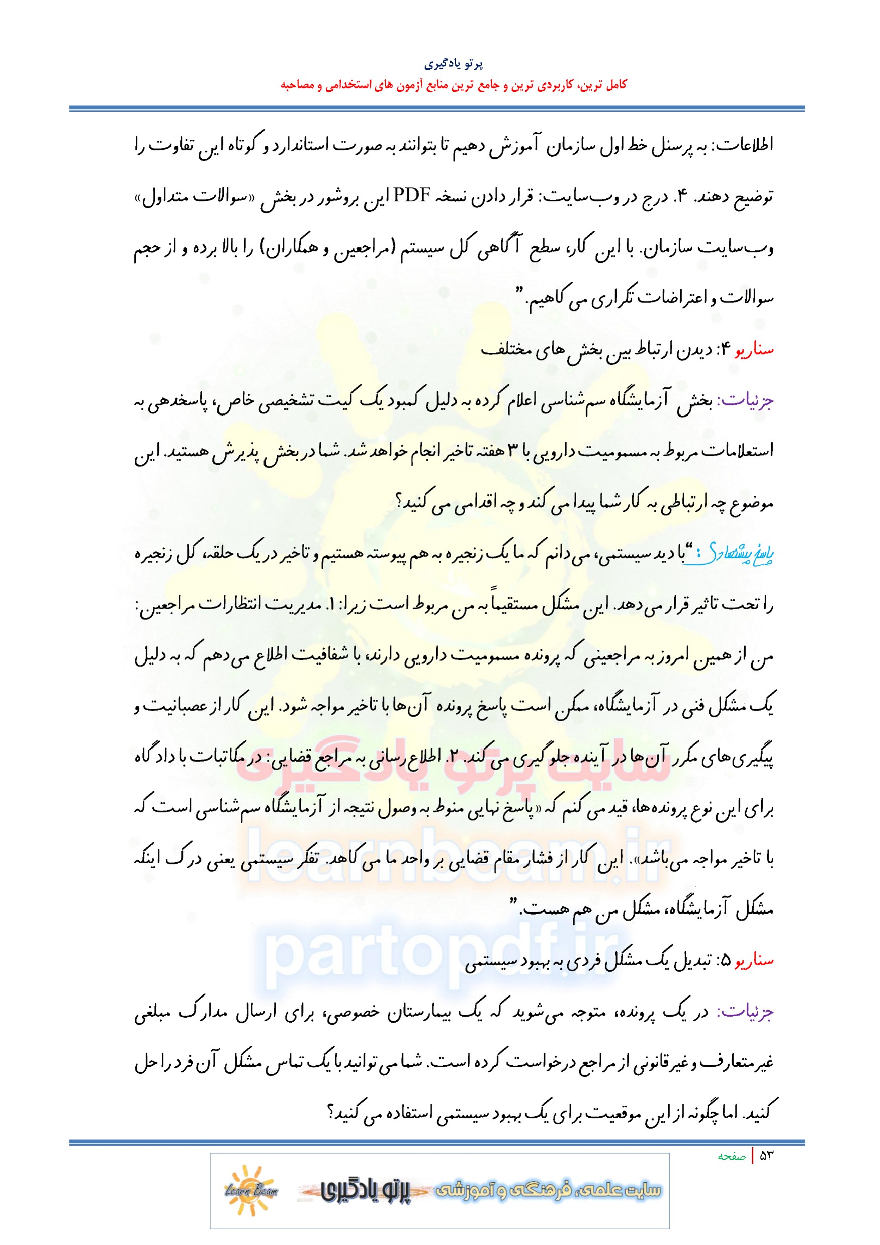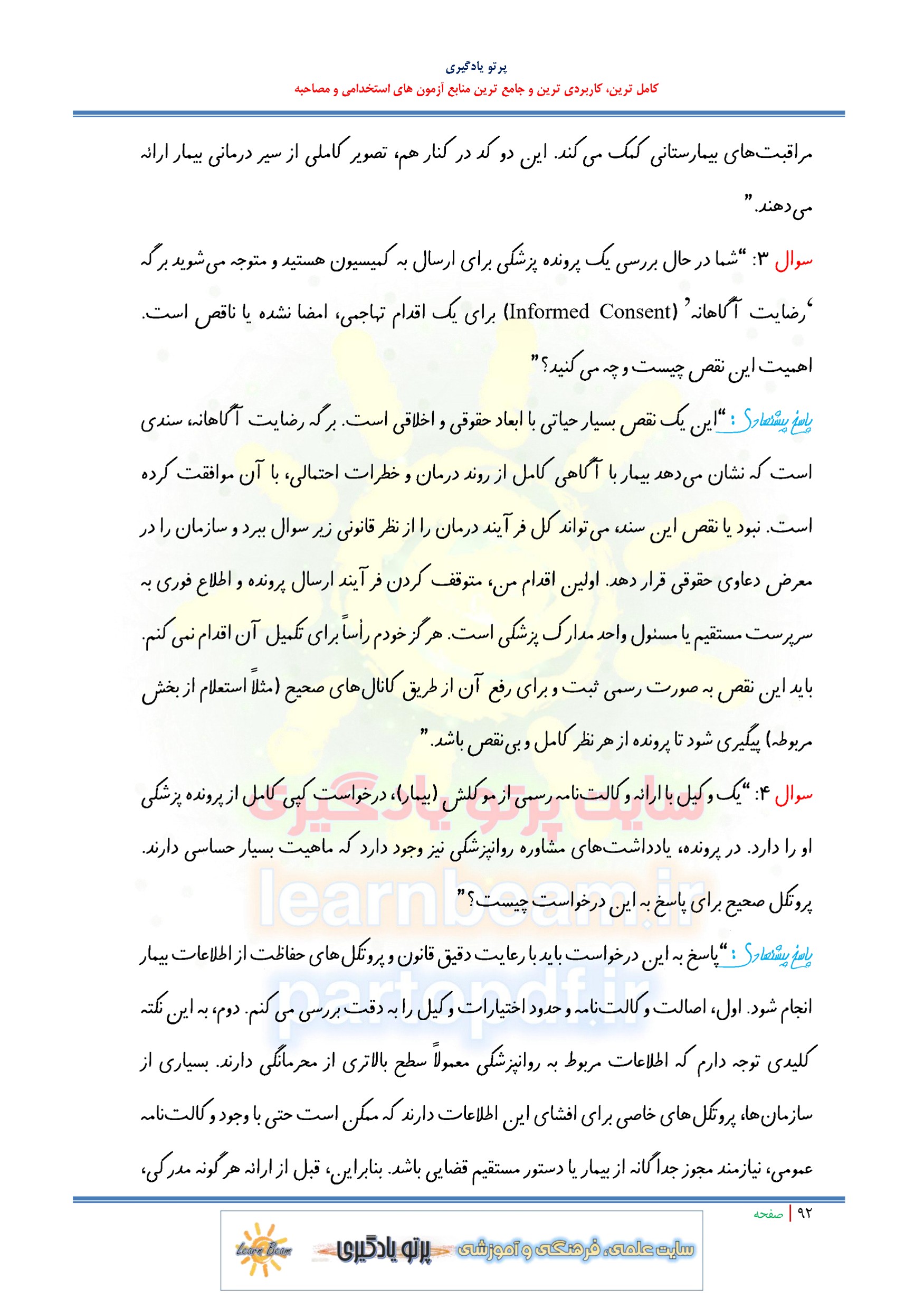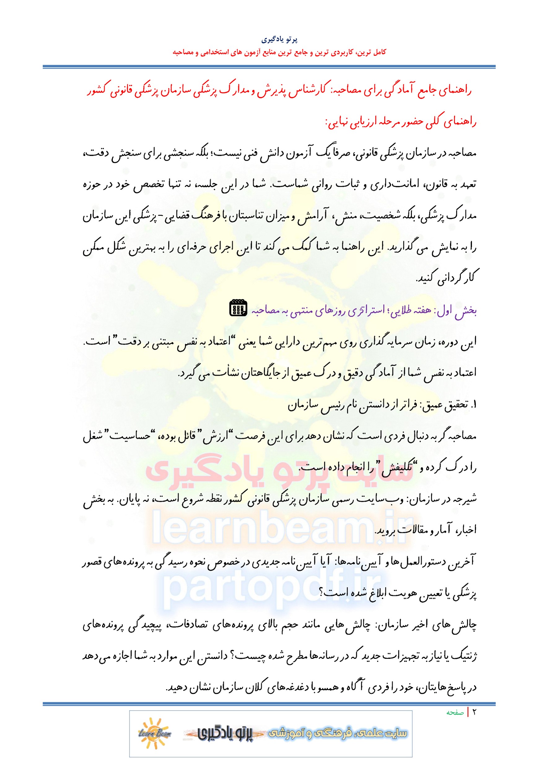 جزوه مصاحبه استخدامی کارشناس پذیرش و مدارک پزشکی سازمان پزشکی قانونی کشور. مجموعه سوالات آمادگی برای مصاحبه استخدامی کارشناس پذیرش و مدارک پزشکی سازمان پزشکی قانونی کشور شامل سوال و جواب با پاسخ پیشنهادی توضیحی در 99 صفحه در قالب فایل pdf. شامل سوالات عمومی - روانشناسی و تخصصی در قالب سوالات شایسته محور و تخصصی. شامل: سوالات مصاحبه کارشناس پذیرش و مدارک پزشکی سازمان پزشکی قانونی کشور. مجموعه سوالات آمادگی برای مصاحبه کارشناس پذیرش و مدارک پزشکی سازمان پزشکی قانونی کشور برای حضور توانمند عزیزان در کانون مصاحبه تالیف گردیده است. تلاش گروه پرتو یادگیری با تهیه پک کامل این مصاحبه، راحتی و دستیابی عادلانه همه داوطلبین این آزمون استخدامی به منابع کامل می باشد. ضمن آرزوی موفقیت برای یکایک عزیزان در مصاحبه تخصصی و عمومی پیش رو. مطالعه جزوه مصاحبه استخدامی کارشناس پذیرش و مدارک پزشکی سازمان پزشکی قانونی کشور برای داوطلبین عزیز پیشنهاد می گردد.
