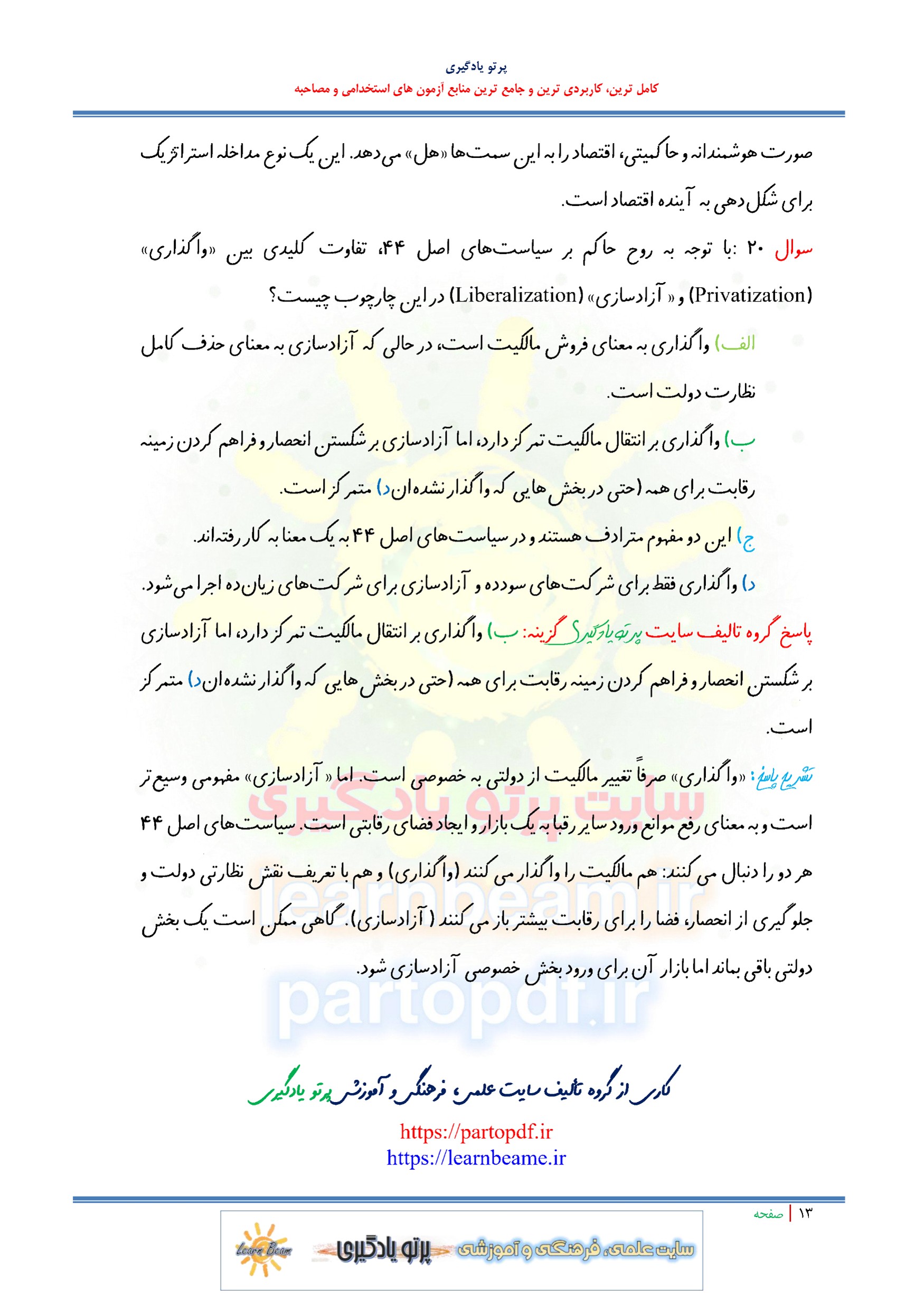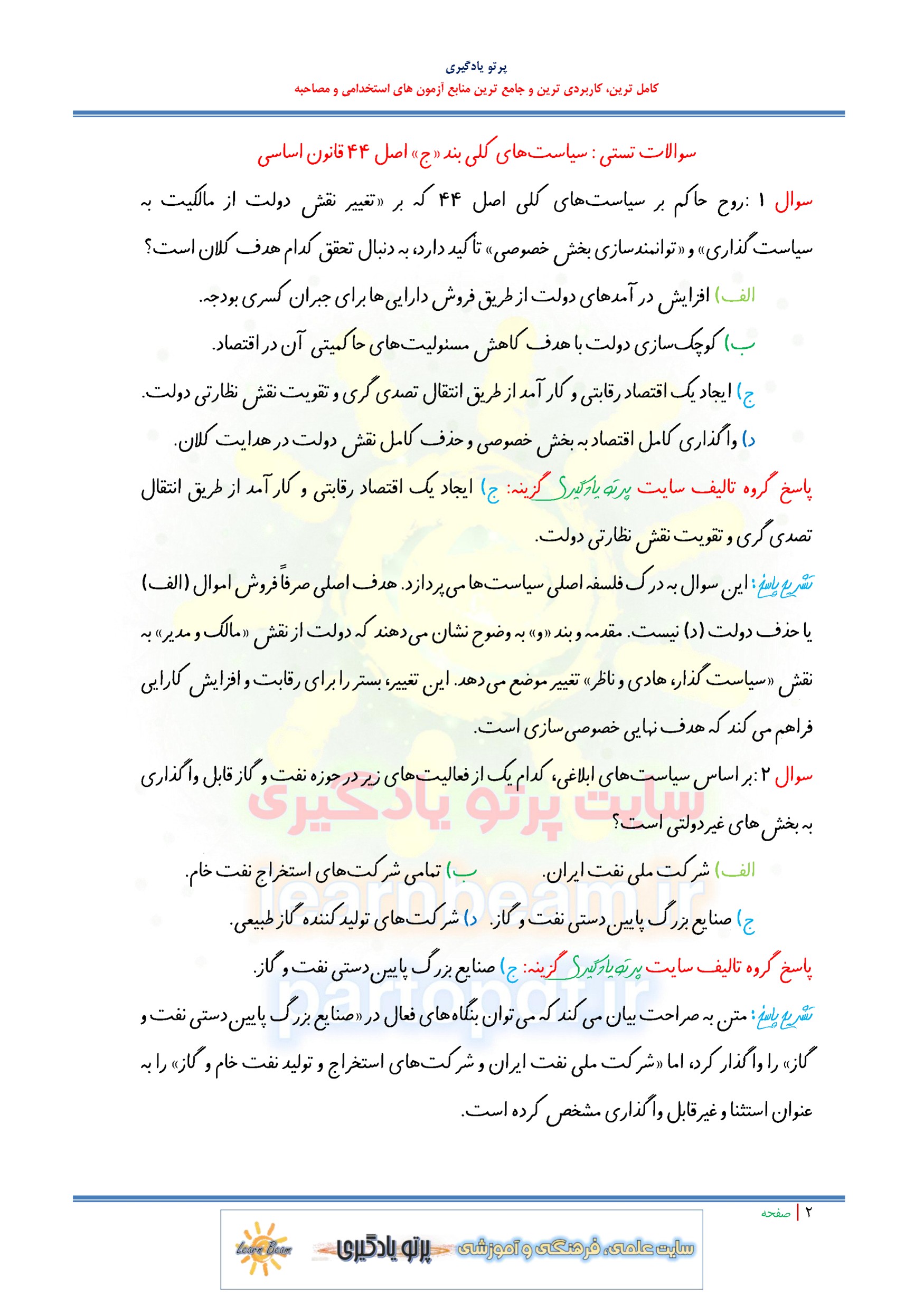 سوالات و تست سیاست های کلی بند ج اصل ۴۴ قانون اساسی