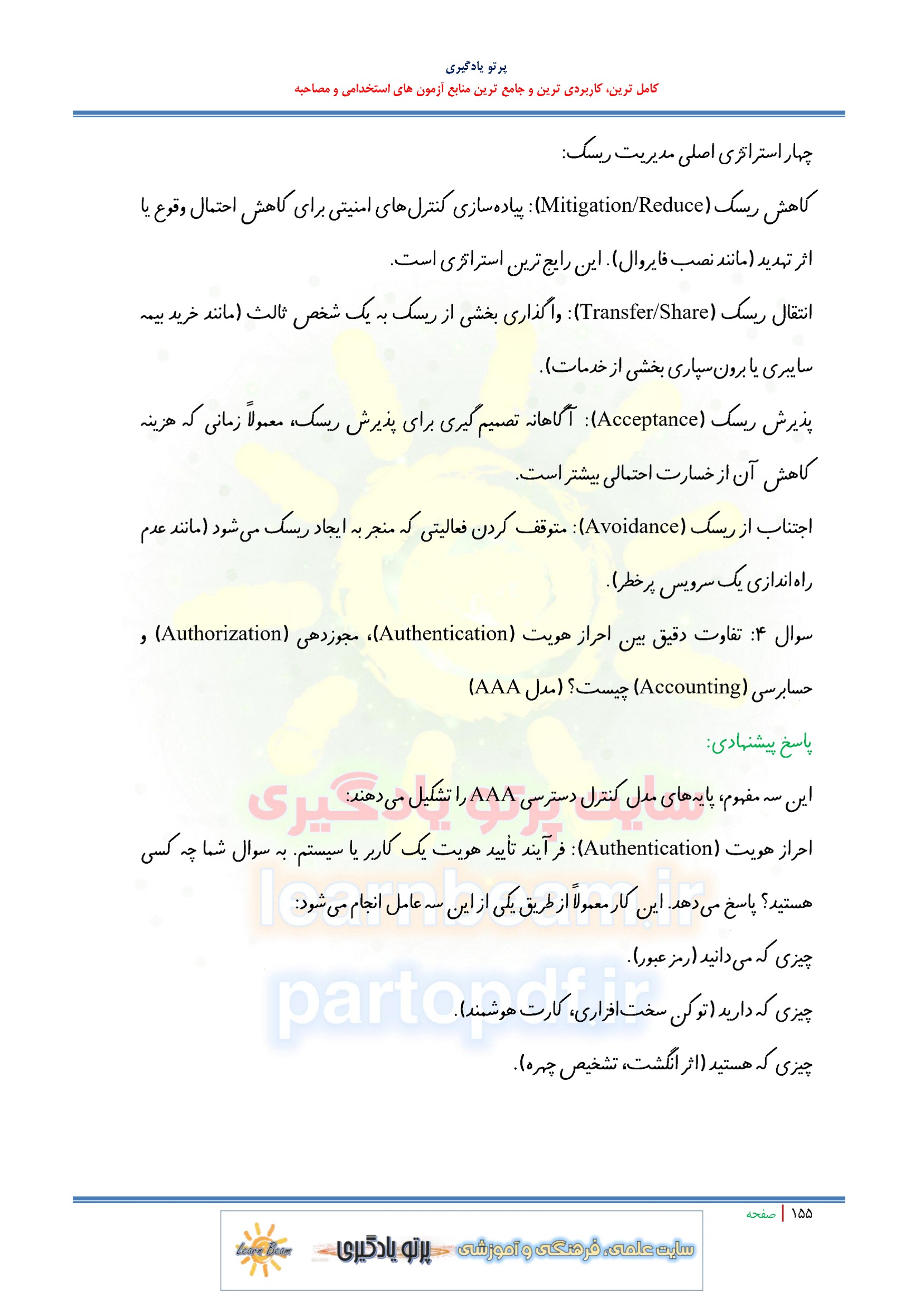 جزوه مصاحبه استخدامی کارشناس حراست فناوری اطلاعات استخدامی وزارت ارتباطات و فناوری اطلاعات. مجموعه سوالات آمادگی برای مصاحبه استخدامی کارشناس حراست فناوری اطلاعات استخدامی وزارت ارتباطات و فناوری اطلاعات شامل سوال و جواب با پاسخ پیشنهادی توضیحی در 168 صفحه در قالب فایل pdf. شامل سوالات عمومی - روانشناسی و تخصصی در قالب سوالات شایسته محور و تخصصی. شامل: سوالات مصاحبه کارشناس حراست فناوری اطلاعات وزارت ارتباطات و فناوری اطلاعات. مجموعه سوالات آمادگی برای مصاحبه کارشناس حراست فناوری اطلاعات استخدامی وزارت ارتباطات و فناوری اطلاعات برای حضور توانمند عزیزان در کانون مصاحبه تالیف گردیده است. تلاش گروه پرتو یادگیری با تهیه پک کامل این مصاحبه، راحتی و دستیابی عادلانه همه داوطلبین این آزمون استخدامی به منابع کامل می باشد. ضمن آرزوی موفقیت برای یکایک عزیزان در مصاحبه تخصصی و عمومی پیش رو. مطالعه جزوه مصاحبه استخدامی کارشناس حراست فناوری اطلاعات استخدامی وزارت ارتباطات و فناوری اطلاعات برای داوطلبین عزیز پیشنهاد می گردد.