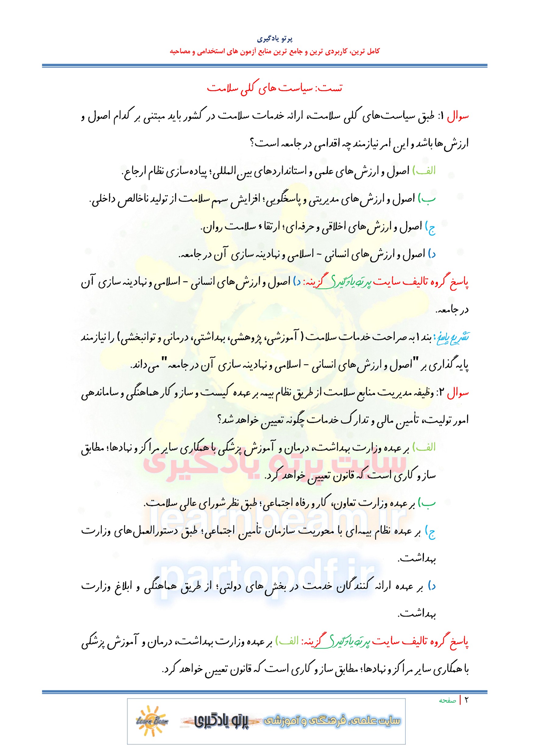 سوالات و تست سیاست های کلی سلامت