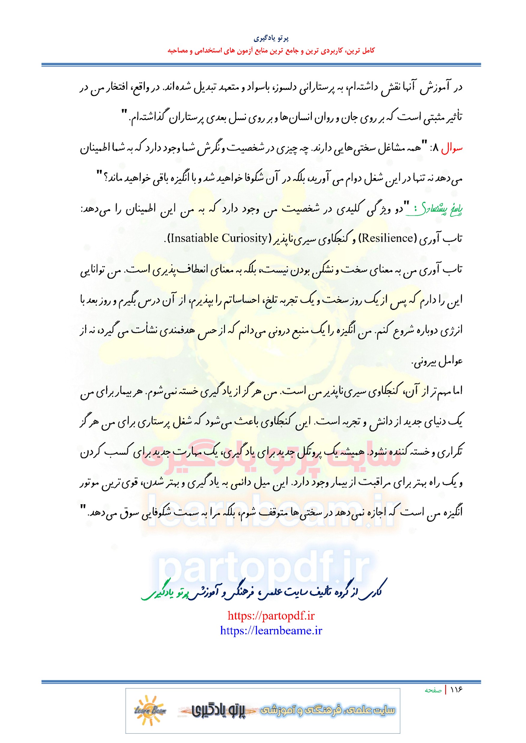 جزوه مصاحبه استخدامی پرستاری استخدامی وزارت بهداشت درمان و آموزش پزشکی. مجموعه سوالات آمادگی برای مصاحبه استخدامی پرستاری استخدامی وزارت بهداشت درمان و آموزش پزشکی شامل سوال و جواب با پاسخ پیشنهادی توضیحی در 116 صفحه در قالب فایل pdf. شامل سوالات عمومی - روانشناسی و تخصصی در قالب سوالات شایسته محور و تخصصی. شامل: سوالات مصاحبه پرستاری استخدامی وزارت بهداشت درمان و آموزش پزشکی. مجموعه سوالات آمادگی برای مصاحبه پرستاری استخدامی وزارت بهداشت درمان و آموزش پزشکی برای حضور توانمند عزیزان در کانون مصاحبه تالیف گردیده است. تلاش گروه پرتو یادگیری با تهیه پک کامل این مصاحبه، راحتی و دستیابی عادلانه همه داوطلبین این آزمون استخدامی به منابع کامل می باشد. ضمن آرزوی موفقیت برای یکایک عزیزان در مصاحبه تخصصی و عمومی پیش رو. مطالعه جزوه مصاحبه استخدامی پرستاری استخدامی وزارت بهداشت درمان و آموزش پزشکی برای داوطلبین عزیز پیشنهاد می گردد.
