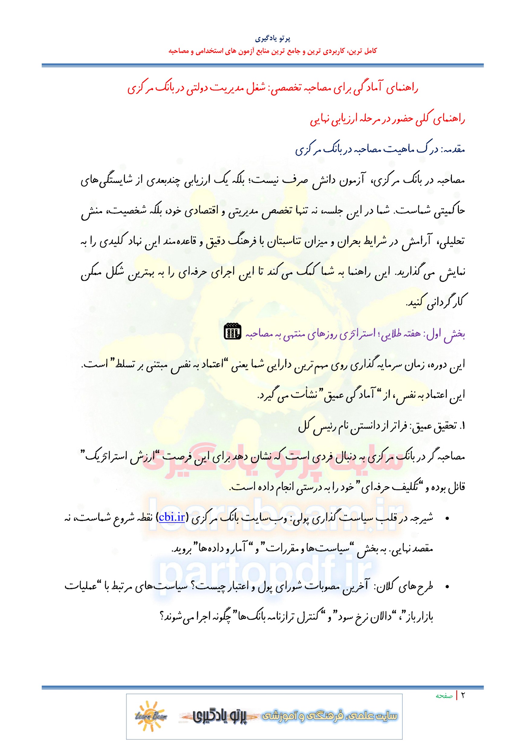 جزوه مصاحبه استخدامی مشاغل تخصصی مدیریت دولتی بانک مرکزی جمهور اسلامی ایران. مجموعه سوالات آمادگی برای مصاحبه استخدامی کارشناس مشاغل تخصصی مدیریت دولتی بانک مرکزی شامل سوال و جواب با پاسخ پیشنهادی توضیحی در 121 صفحه در قالب فایل pdf. شامل سوالات عمومی - روانشناسی و تخصصی در قالب سوالات شایسته محور و تخصصی. شامل: سوالات مصاحبه کارشناس مشاغل تخصصی مدیریت دولتی بانک مرکزی. مجموعه سوالات آمادگی برای مصاحبه کارشناس مشاغل تخصصی مدیریت دولتی بانک مرکزی برای حضور توانمند عزیزان در کانون مصاحبه تالیف گردیده است. تلاش گروه پرتو یادگیری با تهیه پک کامل این مصاحبه، راحتی و دستیابی عادلانه همه داوطلبین این آزمون استخدامی به منابع کامل می باشد. ضمن آرزوی موفقیت برای یکایک عزیزان در مصاحبه تخصصی و عمومی پیش رو. مطالعه جزوه مصاحبه استخدامی کارشناس مشاغل تخصصی مدیریت دولتی بانک مرکزی جمهور اسلامی ایران برای داوطلبین عزیز پیشنهاد می گردد.