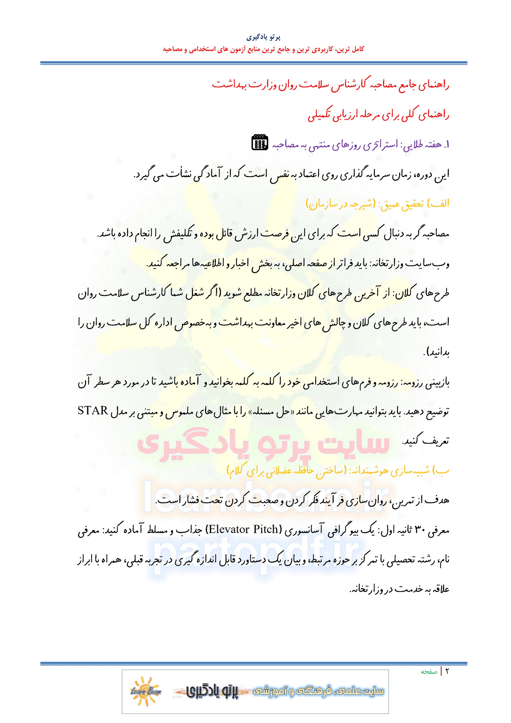 جزوه مصاحبه استخدامی کارشناس سلامت روان استخدامی وزارت بهداشت درمان و آموزش پزشکی. مجموعه سوالات آمادگی برای مصاحبه استخدامی کارشناس سلامت روان استخدامی وزارت بهداشت درمان و آموزش پزشکی شامل سوال و جواب با پاسخ پیشنهادی توضیحی در 82 صفحه در قالب فایل pdf. شامل سوالات عمومی - روانشناسی و تخصصی در قالب سوالات شایسته محور و تخصصی. شامل: سوالات مصاحبه کارشناس سلامت روان استخدامی وزارت بهداشت درمان و آموزش پزشکی. مجموعه سوالات آمادگی برای مصاحبه کارشناس سلامت روان استخدامی وزارت بهداشت درمان و آموزش پزشکی برای حضور توانمند عزیزان در کانون مصاحبه تالیف گردیده است. تلاش گروه پرتو یادگیری با تهیه پک کامل این مصاحبه، راحتی و دستیابی عادلانه همه داوطلبین این آزمون استخدامی به منابع کامل می باشد. ضمن آرزوی موفقیت برای یکایک عزیزان در مصاحبه تخصصی و عمومی پیش رو. مطالعه جزوه مصاحبه استخدامی کارشناس سلامت روان استخدامی وزارت بهداشت درمان و آموزش پزشکی برای داوطلبین عزیز پیشنهاد می گردد.