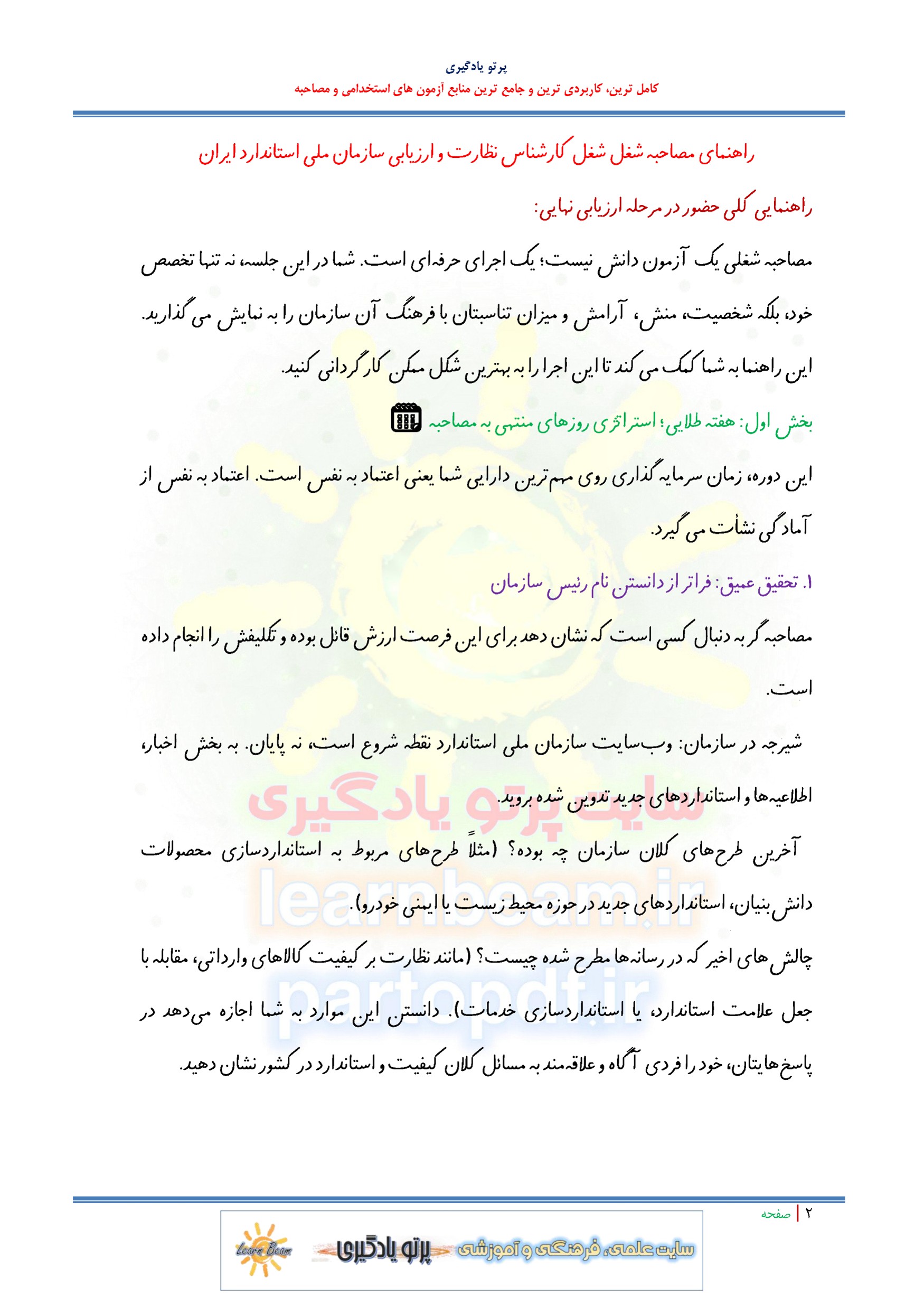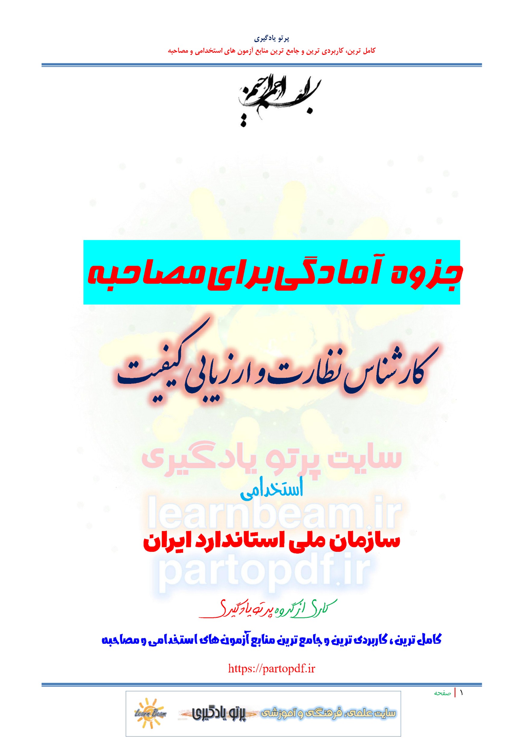 جزوه مجموعه سوالات آمادگی برای مصاحبه کارشناس نظارت و ارزیابی کیفیت استخدامی سازمان ملی استاندارد ایران در 4 محور تدوین گردیده است: بخش 1 کلیات مصاحبه و نحوه حضور در آن شرایط و ویژگی ها و ملاک های لازم را برای حضور در مصاحبه ترسیم نموده و شما را برای حضور فیزیکی برای مصاحبه آماده می کند. بخش 2 و 3 که مباحث عمومی و تخصصی که در برگیرنده سوالات تخصصی و کاملا مرتبط و متناسب با عنوان شغل کارشناس نظارت و ارزیابی کیفیت استخدامی سازمان ملی استاندارد است و بخش 4 که مربوط به سوالات مهم و پرتکرار حیطه عمومی، تخصصی و روانشناسی است که آمادگی داوطلبین را برای حضور در جلسه مصاحبه آن دستگاه اجرایی به همراه دارد.