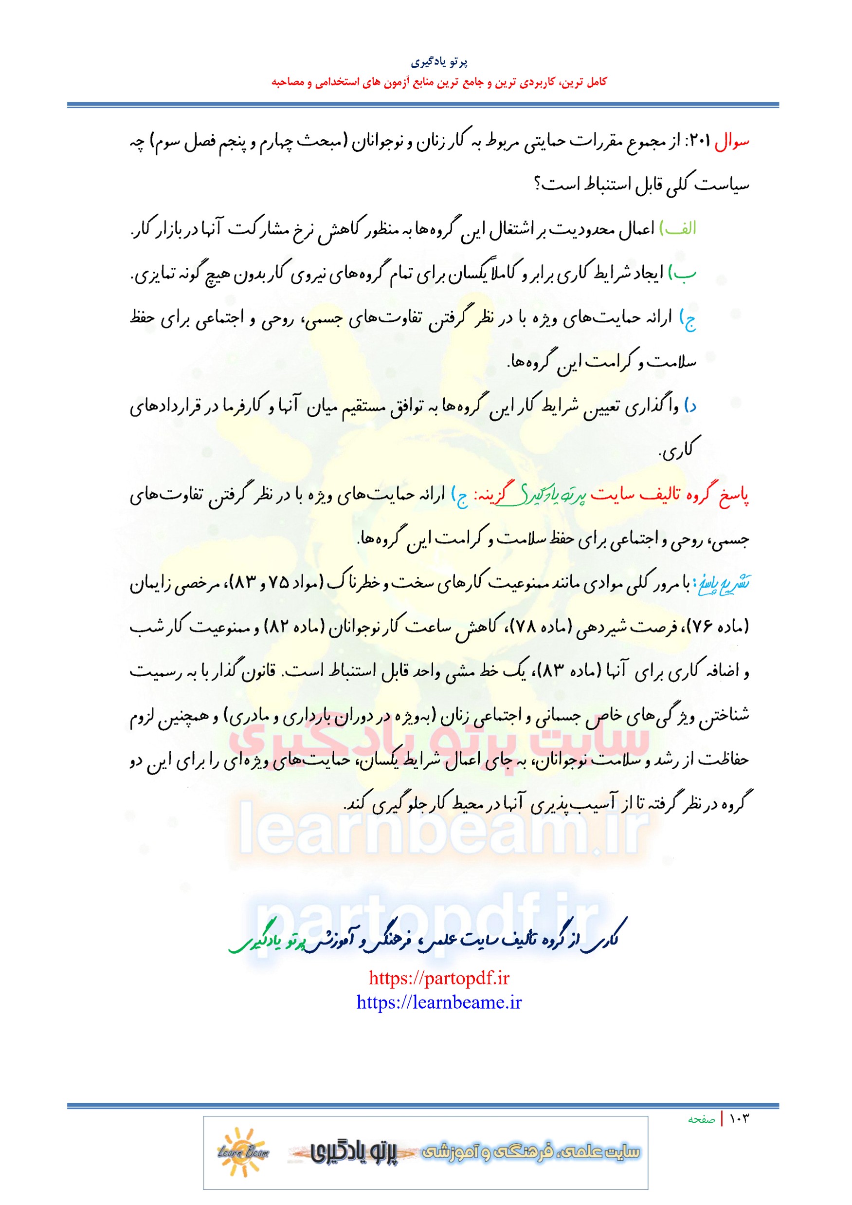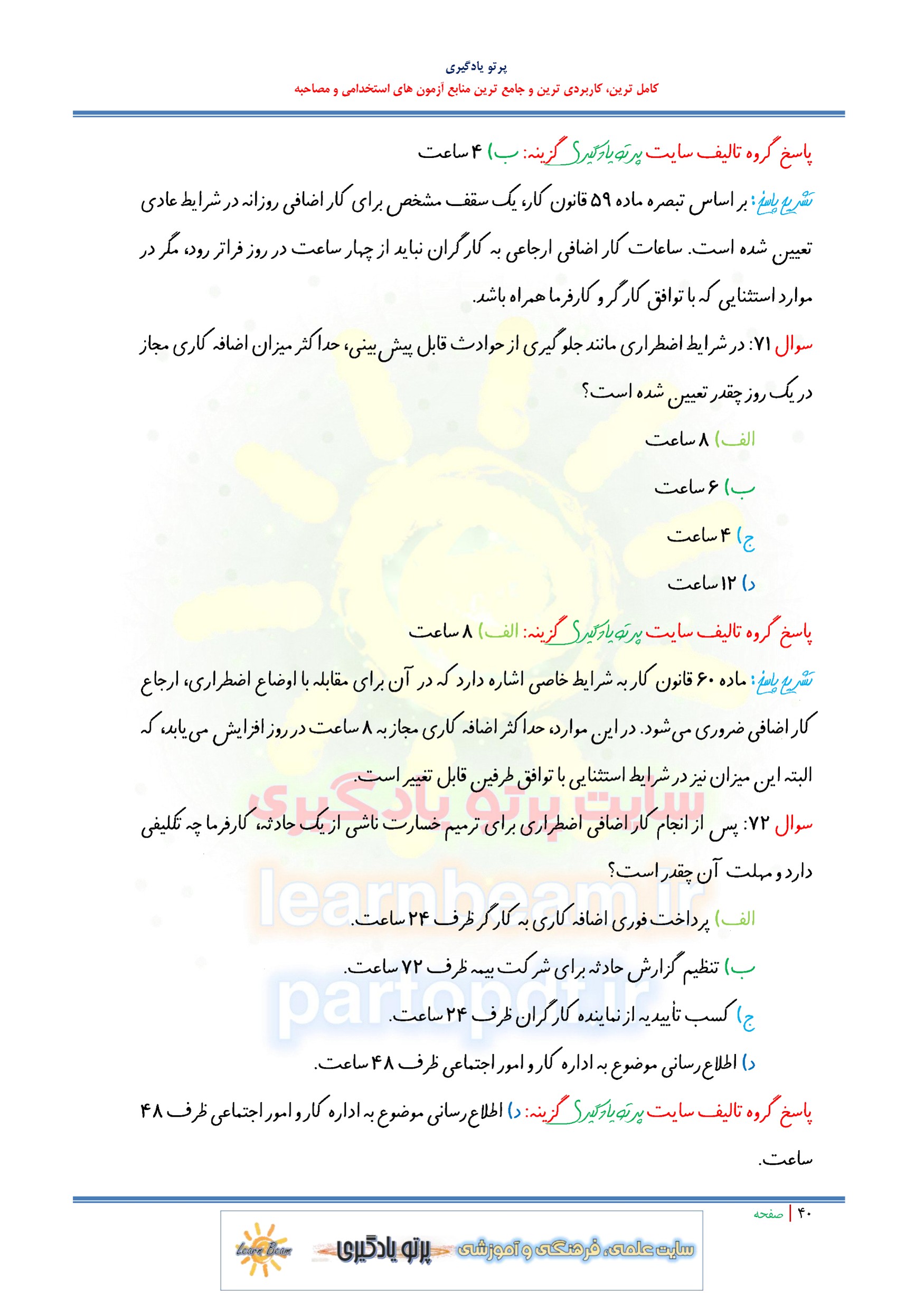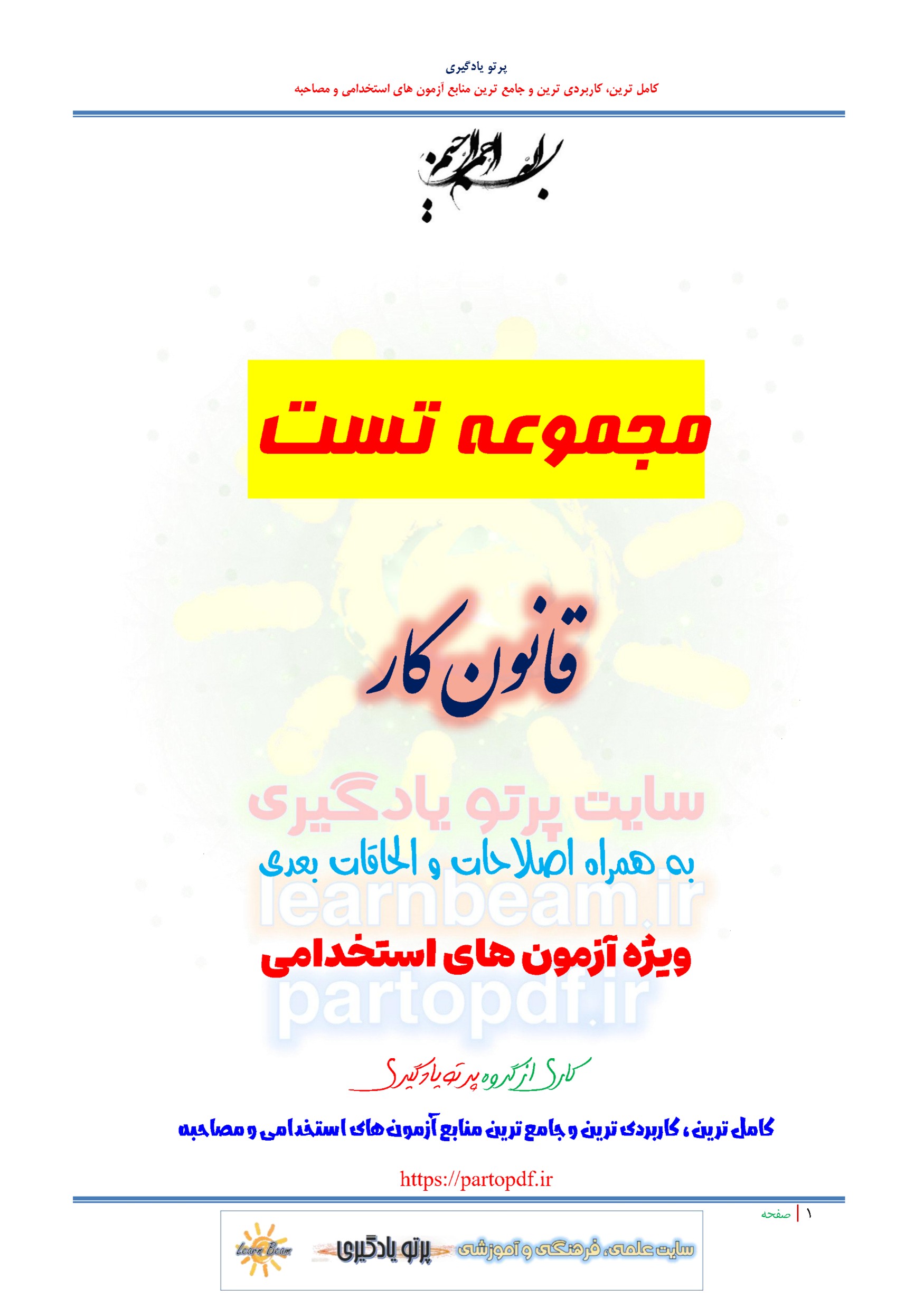 سوالات و تست قانون کار با اصلاحات و الحاقات بعدی. سوالات تستی قانون کار با اصلاحات و الحاقات بعدی شامل 201 سوال تستی در 103 صفحه با پاسخ تشریحی در قالب فایل pdf. مطابق با سرفصل های دفترچه آزمون های استخدامی. مجموعه سوالات تستی قانون کار با اصلاحات و الحاقات بعدی بهترین منبع برای آمادگی آزمون های استخدامی می باشد. مجموعه سوالات و تست قانون کار با اصلاحات و الحاقات بعدی مطالب خوانده شده داوطلبین آزمون استخدامی را نظم بخشیده و منسجم می سازد. مجموعه سوالات و تست قانون کار با اصلاحات و الحاقات بعدی ویژه آزمون های استخدامی مرور سریع داوطلب را سبب می شود و آگاهی های وی را نظم بخشیده و یک آمادگی و شبیه سازی را برای جلسه آزمون به همراه دارد. مطالعه پک مجموعه سوالات و تست قانون کار با اصلاحات و الحاقات بعدی برای داوطلبین آزمون های استخدامی پیشنهاد می شود.