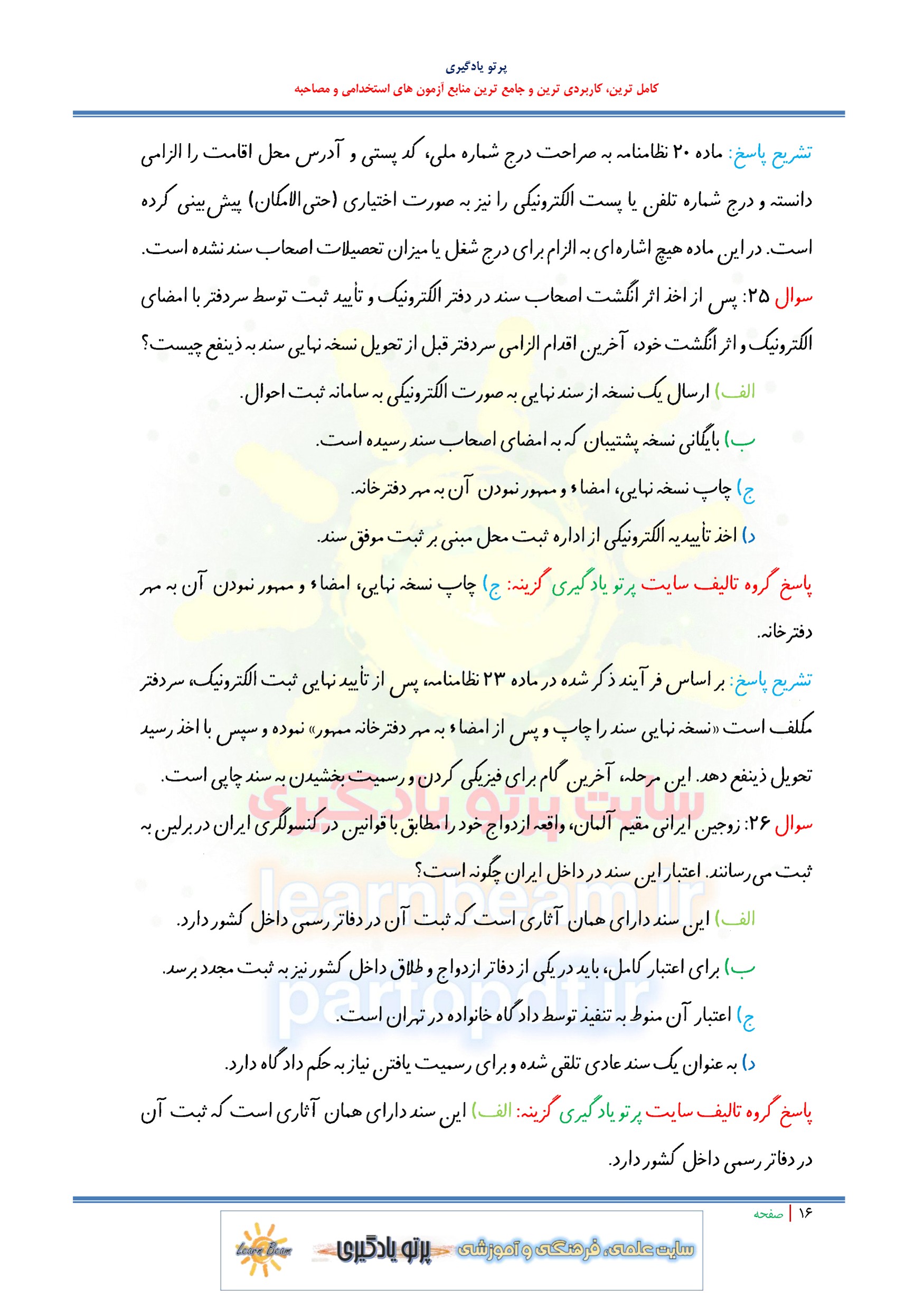 سوالات و تست نظامنامه تشکیلات دفاتر ازدواج و طلاق سوالات نظامنامه تشکیلات دفاتر ازدواج و طلاق شامل 81 سوال تستی در 45 صفحه با پاسخ تشریحی در قالب فایل pdf. بهترین منبع برای آزمون های استخدامی می باشد. مجموعه سوالات تستی نظامنامه تشکیلات دفاتر ازدواج و طلاق مطالب خوانده شده داوطلبین آزمون استخدامی را نظم بخشیده و منسجم می سازد. این مجموعه مرور سریع داوطلب را سبب می شود و آگاهی های وی را نظم بخشیده و یک آمادگی و شبیه سازی را برای جلسه آزمون به همراه دارد. مطالعه این منبع برای همه داوطلبین شرکت کننده در آزمون های استخدامی پیشنهاد می شود.
