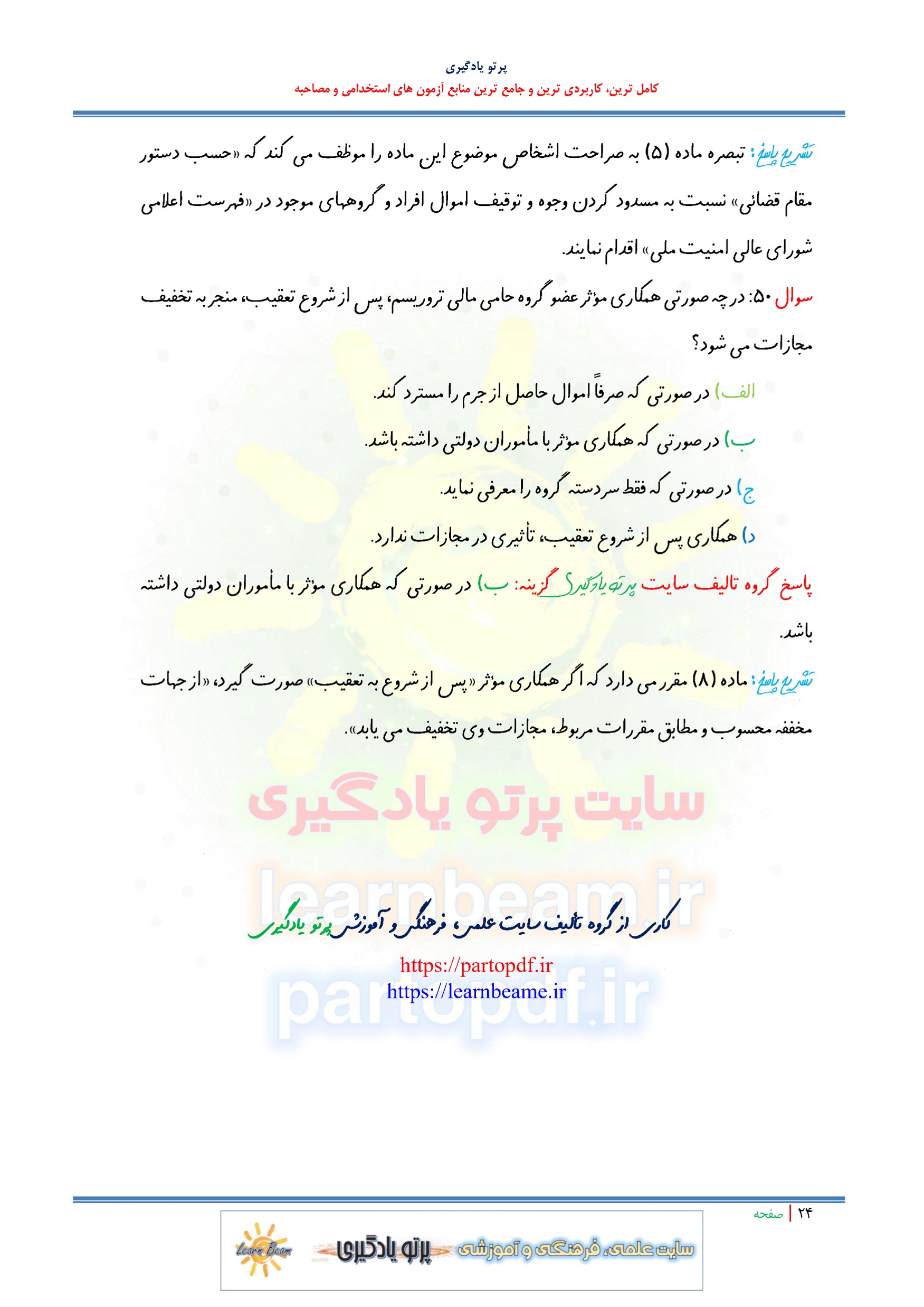 سوالات و تست قانون مبارزه با تامین مالی تروریسم سوالات قانون مبارزه با تامین مالی تروریسم شامل 50 سوال تستی در 25 صفحه با پاسخ تشریحی در قالب فایل pdf. بهترین منبع برای آزمون های استخدامی می باشد. مجموعه سوالات تستی قانون مبارزه با تامین مالی تروریسم مطالب خوانده شده داوطلبین آزمون استخدامی را نظم بخشیده و منسجم می سازد. این مجموعه مرور سریع داوطلب را سبب می شود و آگاهی های وی را نظم بخشیده و یک آمادگی و شبیه سازی را برای جلسه آزمون به همراه دارد. مطالعه این منبع برای همه داوطلبین شرکت کننده در آزمون های استخدامی پیشنهاد می شود.