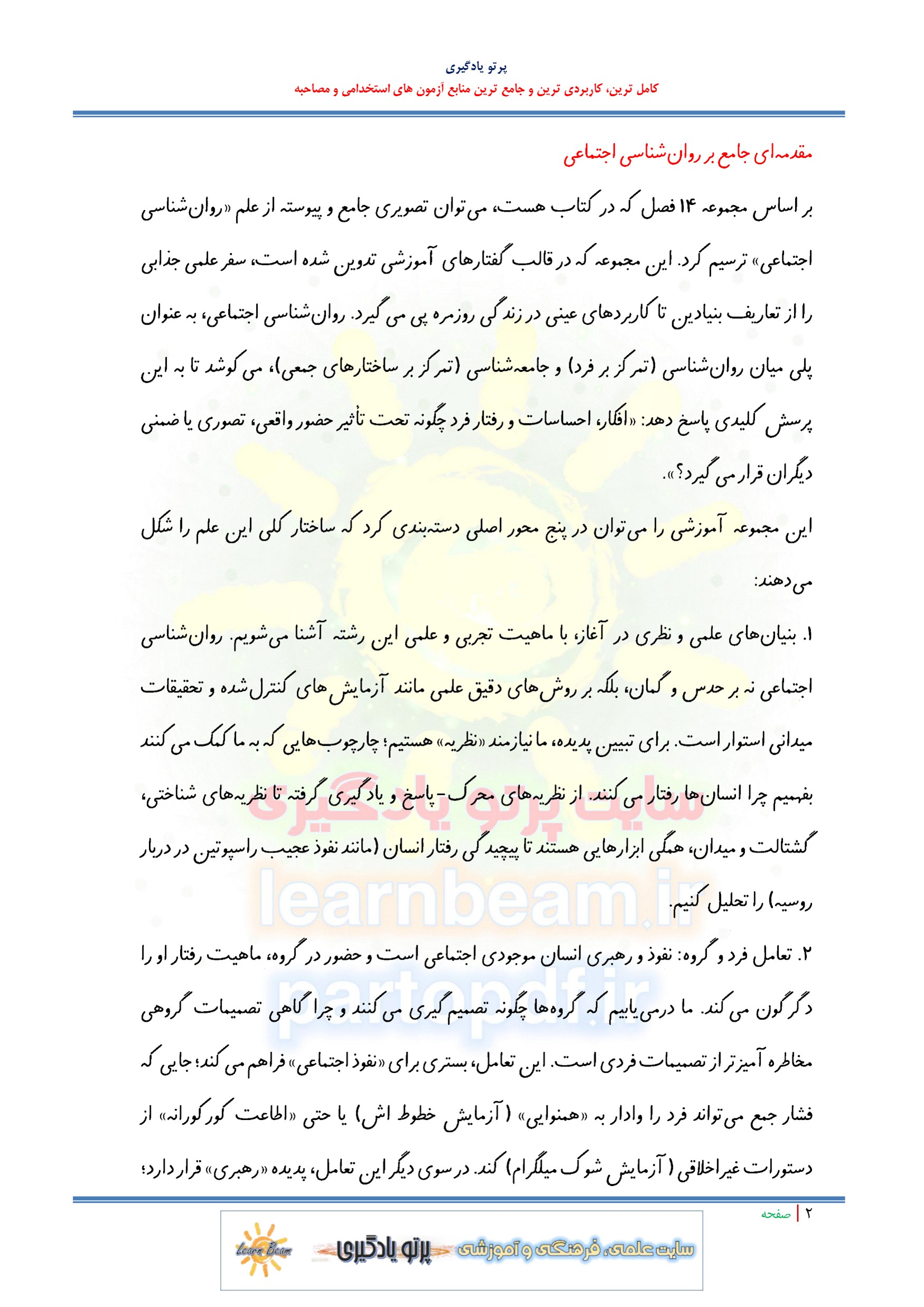 خلاصه کتاب روانشناسی اجتماعی در 78 صفحه در قالب pdf. مجموعه ای کامل برای مطالعه و موفقیت در آزمون های استخدامی است. این مجموعه ارزشمند در قالب فایل پی دی اف می تواند مناسب ترین انتخاب برای انسجام ذهنی و آمادگی برای آزمون شما عزیزان باشد. مجموعه خلاصه و نکات کلیدی کتاب روانشناسی اجتماعی برای تجمیع، جمع بندی و مرور سریع متناسب با سرفصل های اعلامی آزمون استخدامی طراحی و تدوین شده است.
