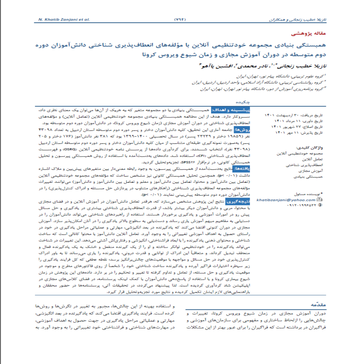 هدف از این مطالعه همبستگی بنیادی مجموعه خودتنظیمی آنلاین (تعامل آنلاين) و مؤلفههای انعطافپذیری شناختی در دوران آموزش مجازي (زمان شیوع ویروس کرونا)، در دانشآموزان دوره دوم متوسطه بود.همبستگی بنیادی مجموعه خودتنظیمی آنلاین با مؤلفه های انعطاف پذیری شناختی دانش آموزان دوره دوم متوسطه در دوران آموزش مجازی و زمان شیوع ویروس کرونا