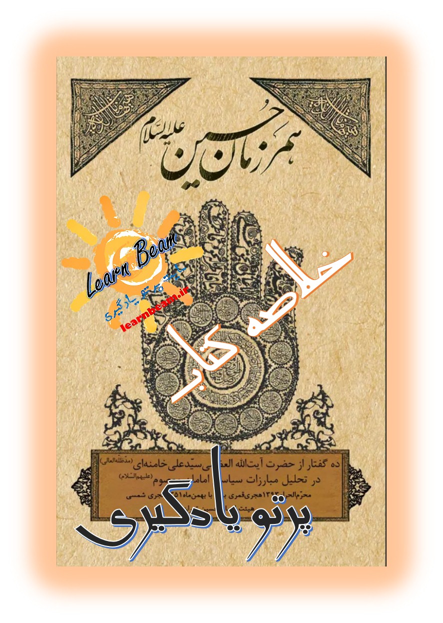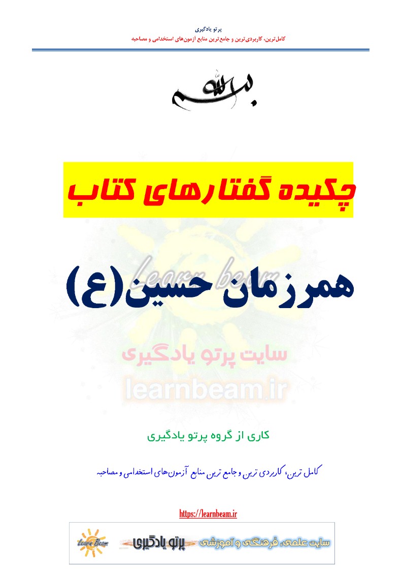 خلاصه و نکات کلیدی کتاب همرزمان حسین (ع) کتاب همرزمان حسین مشتمل بر ۱۰ سخنرانی رهبر انقلاب در ماه محرّم سال ۵۱ است. خلاصه آن بصورت پی دی اف در 28 صفحه ارایه شده است چکیده کتاب همرزمان حسین می تواند داوطلبین آزمون استخدامی را به دیدگاه کلی و اصل مطلب مجهز نماید. چکیده کتاب همرزمان حسین امکان مرور سریع بر این منبع آزمون را میسر می سازد. چکیده کتاب همرزمان حسین با داشتن نکات برجسته داوطلبین را برای آزمون استخدامی آموزش و پرورش آماده می کند.آزمون مربی پرورشی،دبیری و آموزگاری آموزش و پرورش منبع آزمون مربی پرورشی، دبیری و آموزگاری
