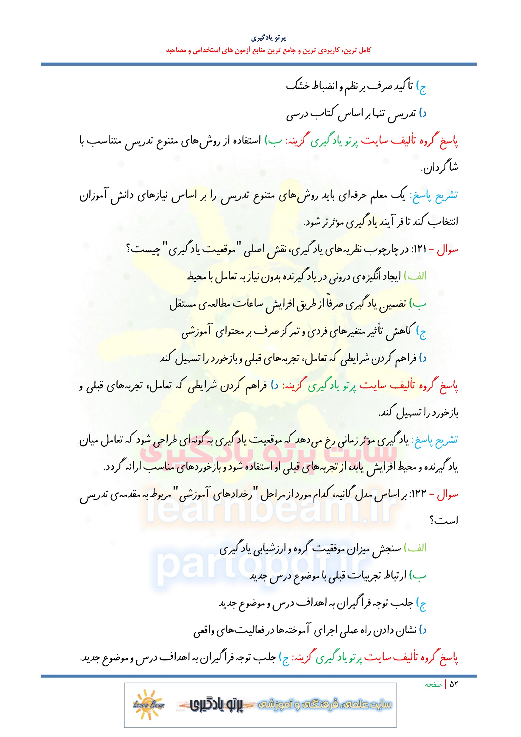 تست کتاب روش ها و فنون تدریس مجموعه تست کتاب روش ها و فنون تدریس در 129 صفحه و 307 تست چهار گزینه ای در قالب فایل pdf. قابل چاپ با کیفیت عالی جهت انسجام ذهنی، خودآزمایی و مطالعه سریع داوطلبین شرکت کننده در آزمونهای استخدامی و آزمون استخدامی استخدامی آموزش و پرورش مطابق با دفترچه راهنمای ثبت نام آزمون استخدامی و مطابق با سرفصل های اعلامی در دفترچه راهنمای ثبت نام. این مجموعه از فصول معتبرترین کتب روش ها و فنون تدریس استخراج شده است. مجموعه تست روش ها و فنون تدریس آموخته های داوطلبین آزمون استخدامی را نظم بخشیده و منسجم می سازد. این مجموعه مرور سریع داوطلب را سبب می شود و آگاهی های وی را در زمینه مهارت ها و فنون تدریس و مهارت های کلاسی نظم بخشیده و یک آمادگی و شبیه سازی را برای جلسه آزمون به همراه دارد.