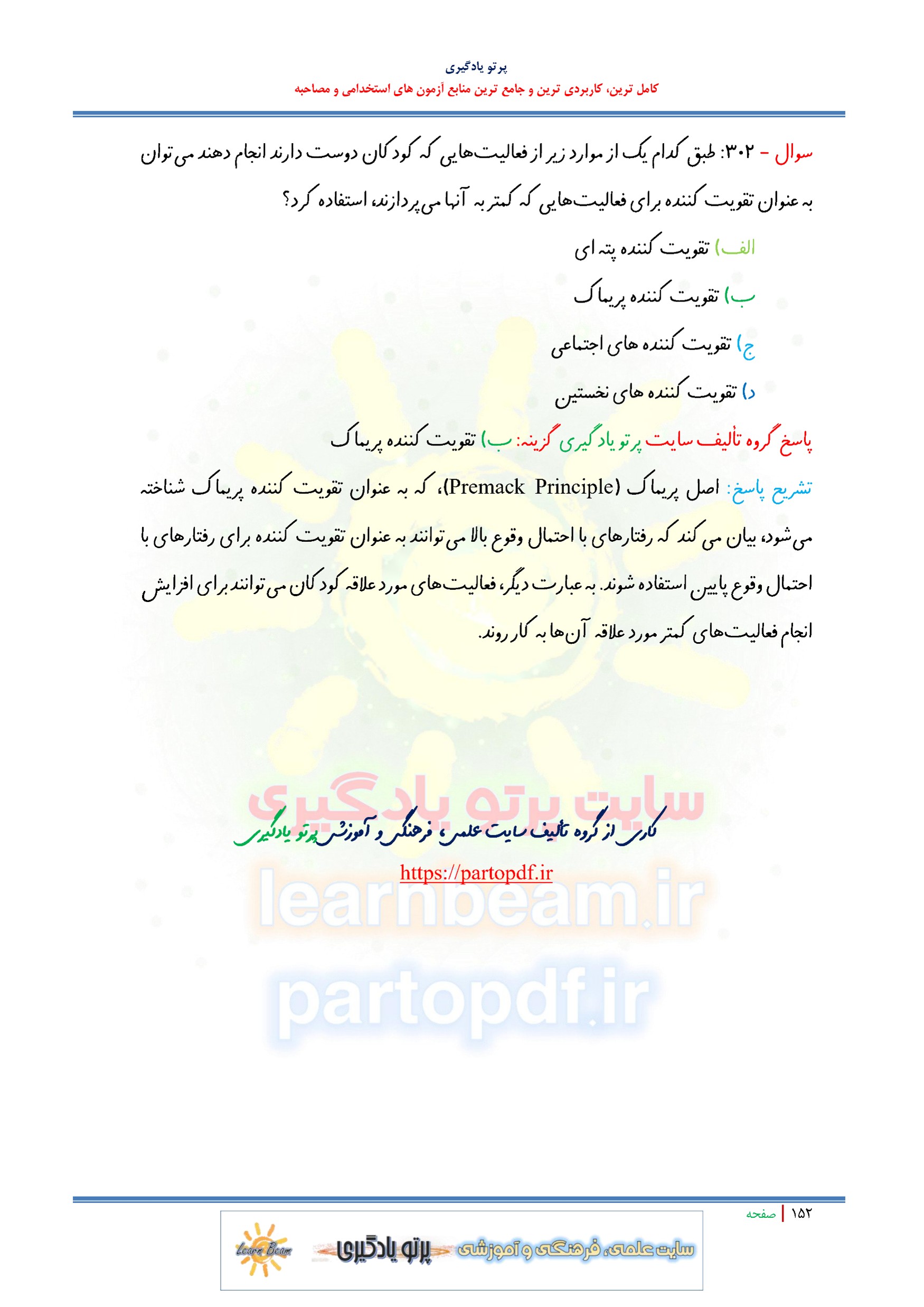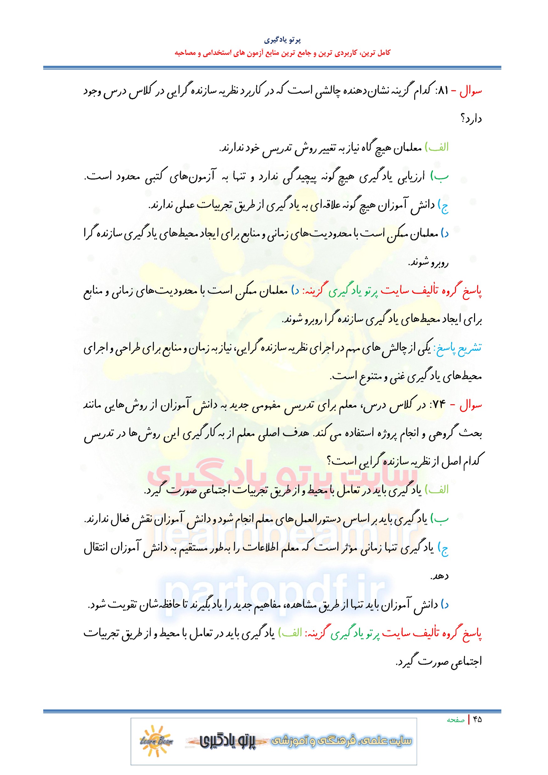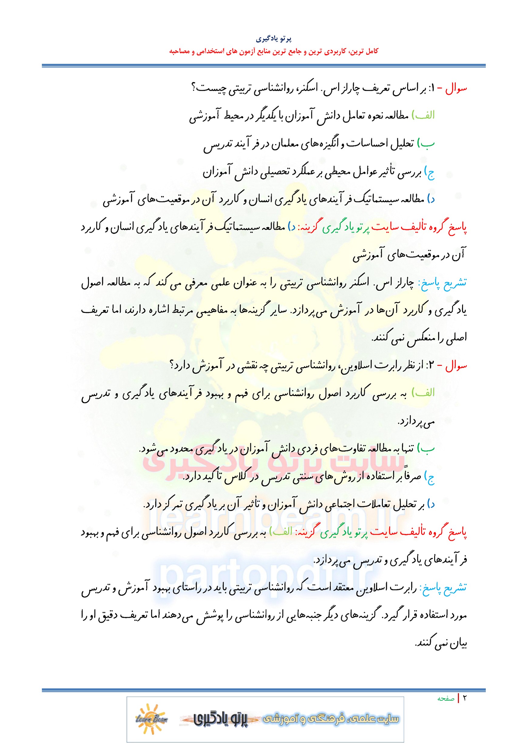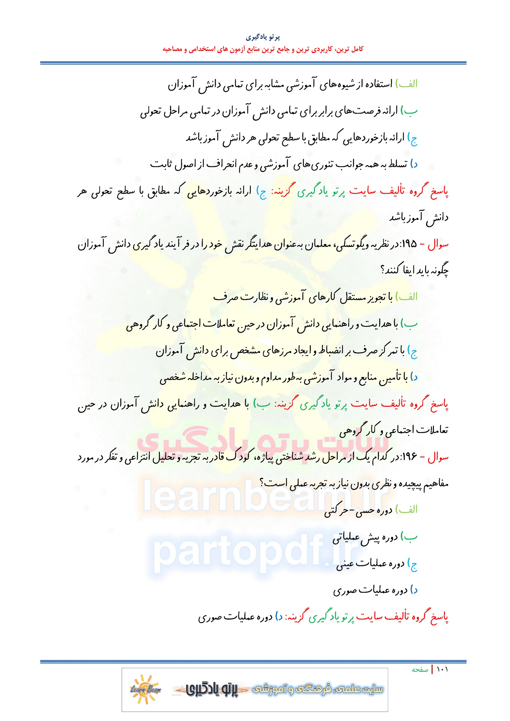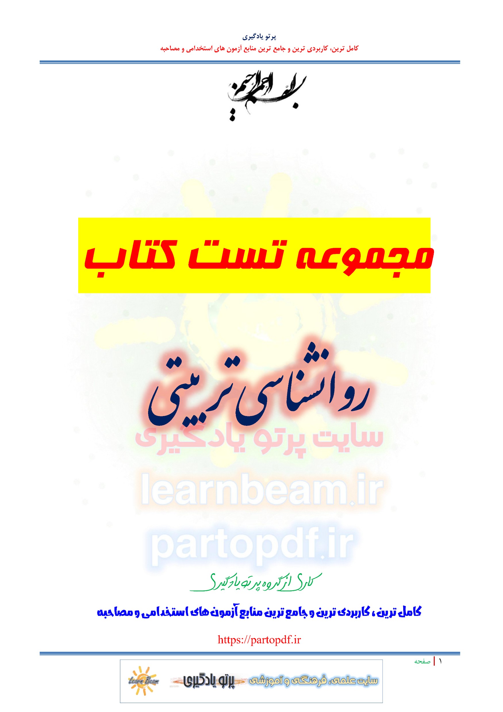 سوالات و تست کتاب روانشناسی تربیتی جزوه سوالات تستی کتاب روانشناسی تربیتی با پاسخ تشریحی به همراه دو دوره سوالات آزمون استخدامی وزارت آموزش و پرورش شامل 302 سوال تستی در 152 صفحه در قالب فایل pdf. قابل چاپ با کیفیت عالی جهت انسجام ذهنی، خودآزمایی و مطالعه سریع داوطلبین شرکت کننده در آزمون استخدامی استخدامی آموزش و پرورش مطابق با دفترچه راهنمای ثبت نام آزمون استخدامی و مطابق با سرفصل های اعلامی آزمون در دفترچه راهنمای ثبت نام. این مجموعه تستی از فصول معتبرترین کتب روانشناسی تربیتی استخراج شده است. جزوه سوالات تستی روانشناسی تربیتی آموخته های داوطلبین آزمون استخدامی را نظم بخشیده و منسجم می سازد. این مجموعه مرور سریع داوطلب را سبب می شود و آگاهی های وی را در زمینه روانشناسی تربیتیروش های تدریس و مهارت های کلاسی نظم بخشیده و یک آمادگی و شبیه سازی را برای جلسه آزمون به همراه دارد.