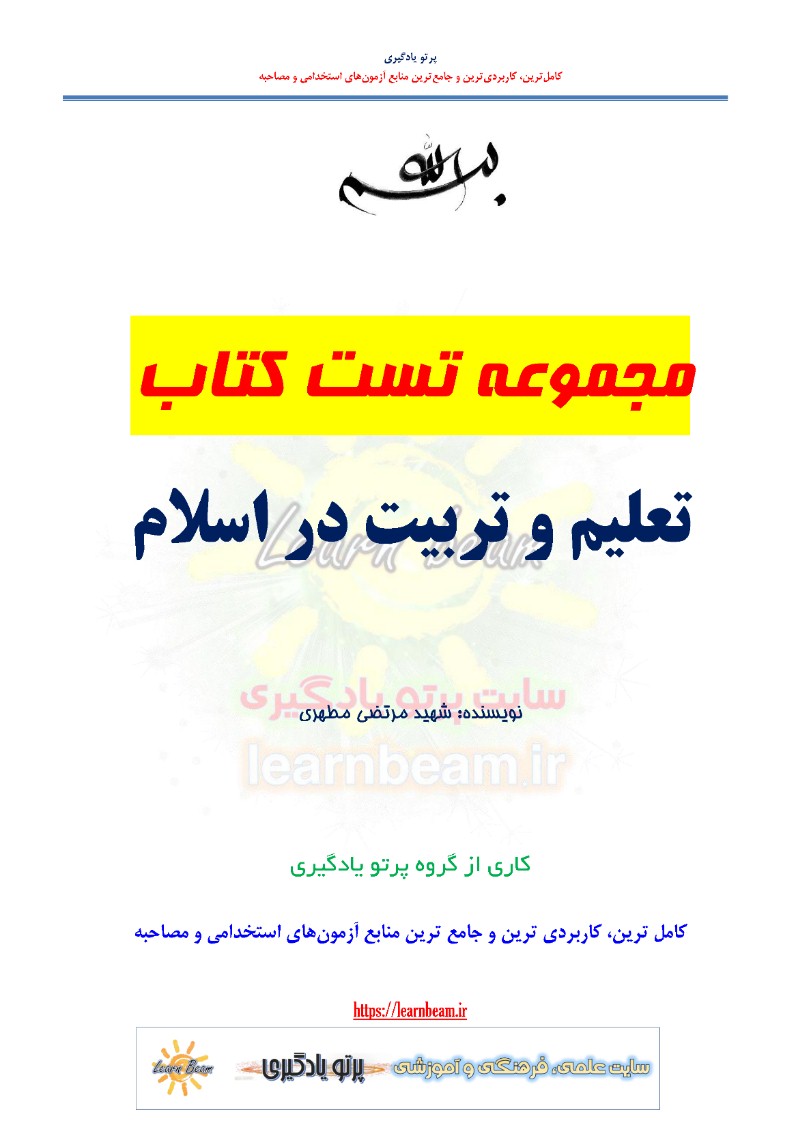 سوالات تستی کتاب تعلیم و تربیت در اسلام مجموعه سوالات تستی کتاب تعلیم و تربیت اثر شهید مرتضی مطهری، منبع مفیدی برای آمادگی در آزمون های استخدامی و آزمون استخدامی آموزش و پرورش است که مطابق با دفترچه راهنمای ثبت نام آزمون های استخدامی تهیه گردیده است.