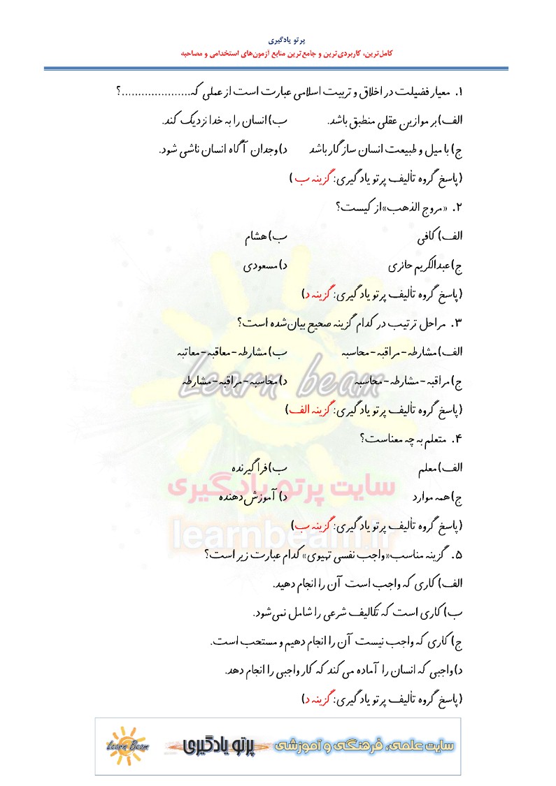 سوالات تستی کتاب تعلیم و تربیت در اسلام شهید مرتضی مطهری در برگیرنده 140 سوال تستی با پاسخ در 30 صفحه در قالب فایل PDF می باشد. سوالات مطرح شده دقیق و با کیفیت است. سوالات تستی تعلیم و تربیت در اسلام می تواند شرکت کنندگان در آزمون های استخدامی و آزمون استخدامی آموزش و پرورش را برای آزمون استخدامی آماده نماید. کتاب تعلیم و تربیت در اسلام منبع ارزشمندی در باب تربیت و ارتباط آن با اسلام بوده و جزو منابع اکثر آزمون های استخدامی باشد.