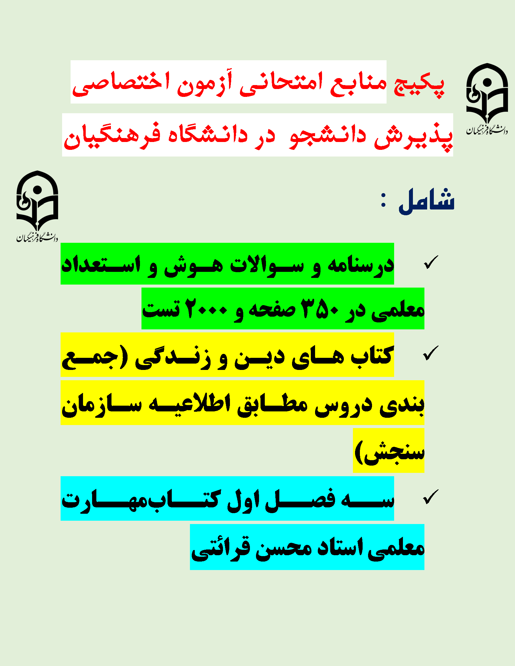 منابع امتحانی کنکور اختصاصی دانشگاه فرهنگیان ویژه رشته علوم انسانی شامل درسنامه و تست برای مادۀ امتحاني "هوش و استعداد معلمي" که طبق اعلام قبلي با ضريب 3 اعمال ميشود. سؤالاتي از جنس درک مفهوم متن، استدلال بر پايه گزارههاي منطقي، طبقهبندي و تحليل متغيرها، انجام مقايسههاي کمي و حل مسائل عددي، نمونههايي از سؤالات اين عنوان امتحاني هستند. پی دی افسه فصل اول کتاب «مهارت معلمي» استاد محسن قرائتي.- پی دی اف کتابهاي دين و زندگي متوسطه دوم