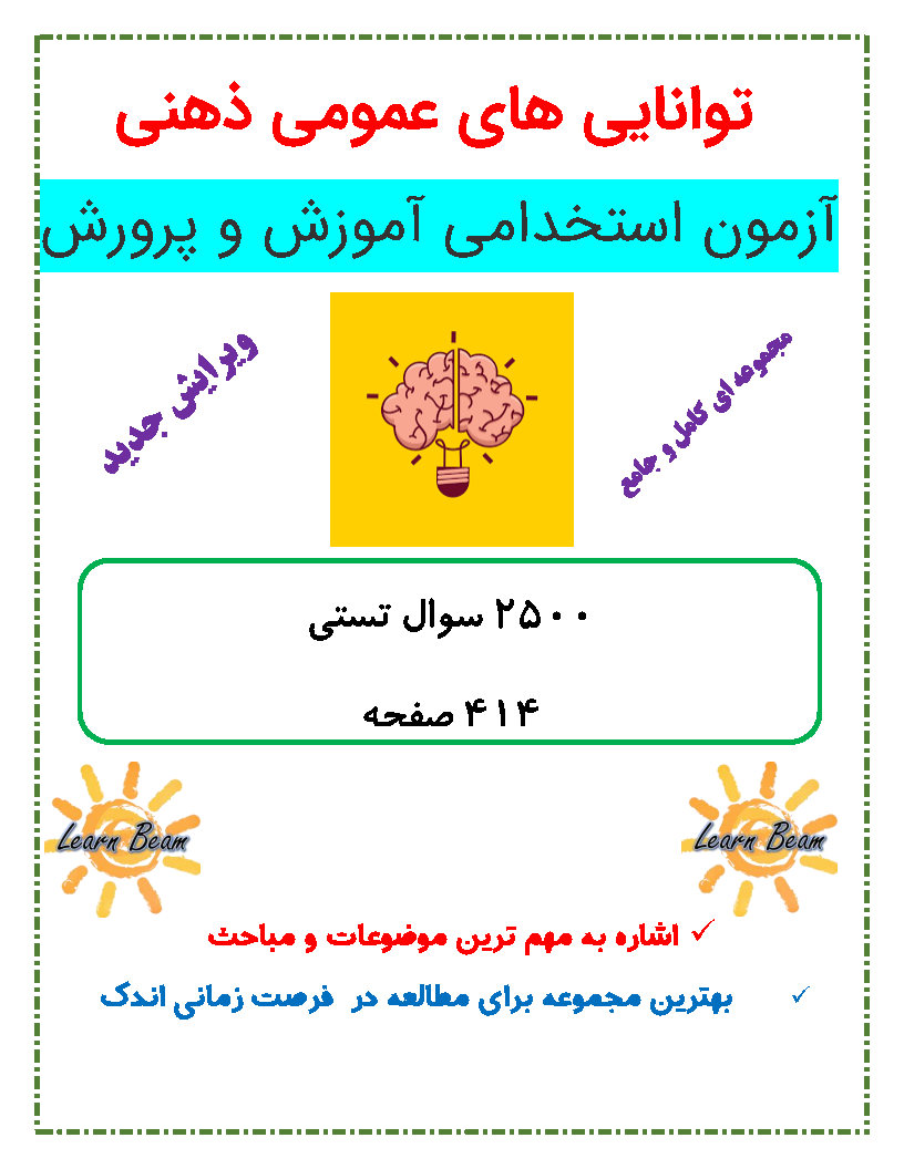 بزرگترین مجموعه تست منتشر شده در کشور شامل 2500 سوال توانایی های عمومی ذهنی آزمون استخدامی آموزش و پرورش سال 1403 بصورت فایل پی دی اف pdf به همراه پاسخنامه. سوالات توانايی های عمومي ذهنی آزمون استخدامی آموزش و پرورش 1403 با کیفیت بوده و جزو منابع آزمون استخدامی آموزش و پرورش سال 1403 می باشد و مناسب برای مطالعه با تلفن همراه، رایانه می باشد. تمامی محصولات پرتو یادگیری قابلیت چاپ باکیفیت. داشته و هیچ گونه قفلی ندارند. داوطلبین آزمون استخدامی می توانند باخیال آسوده خرید نموده و فایل های مربوطه را چاپ و پرینت نمایند. هدف و آرزوی گروه پرتو یادگیری موفقیت شما عزیزان در آزمون های استخدامی می باشد. از اینکه با ما بسوی یادگیری مثل پرتوهای نور هم مسیر هستید مسروریم. هم و غم و سعی و تلاش ما تهیه بهترین، بروزترین و معتبرترین فایل های آموزشی، علمی و فرهنگی بوده و هست.